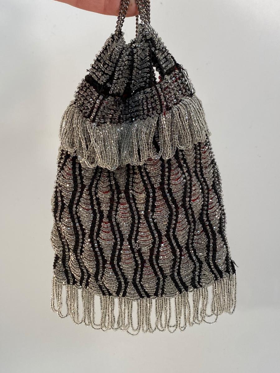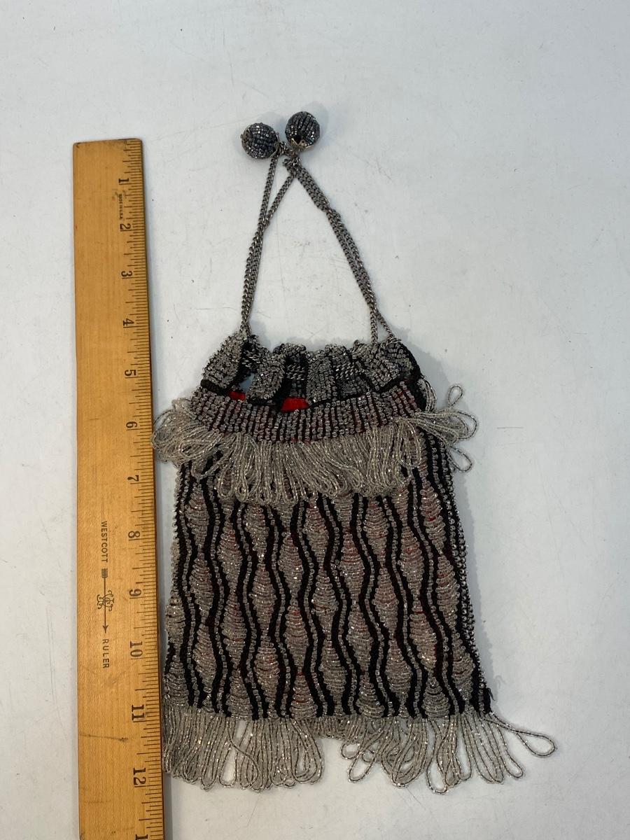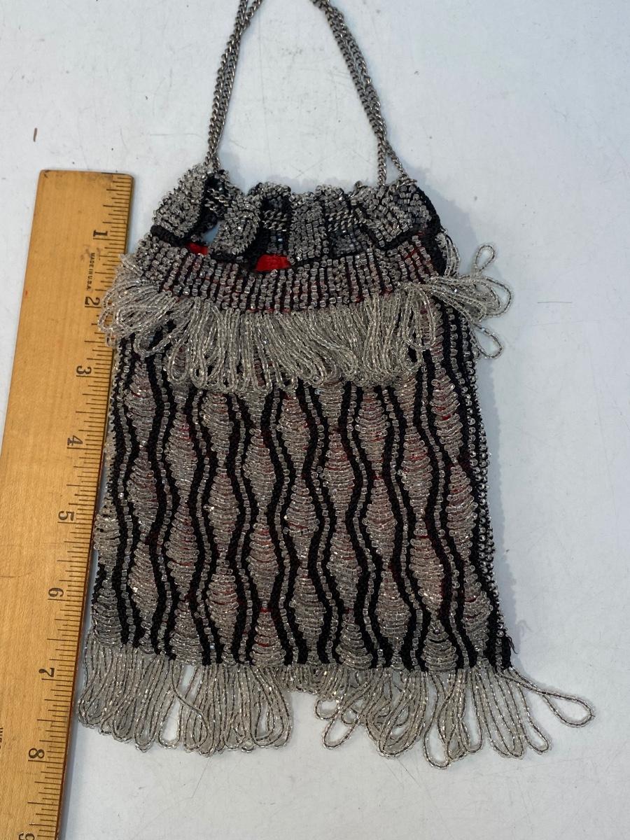 Vintage Antique Microbeaded Drawstring Flapper Purse Handbag. Silver glass beads with geometric design, loop fringe. Red lining. Metal chain drawstring. In good antique condition.