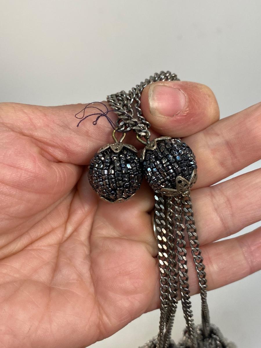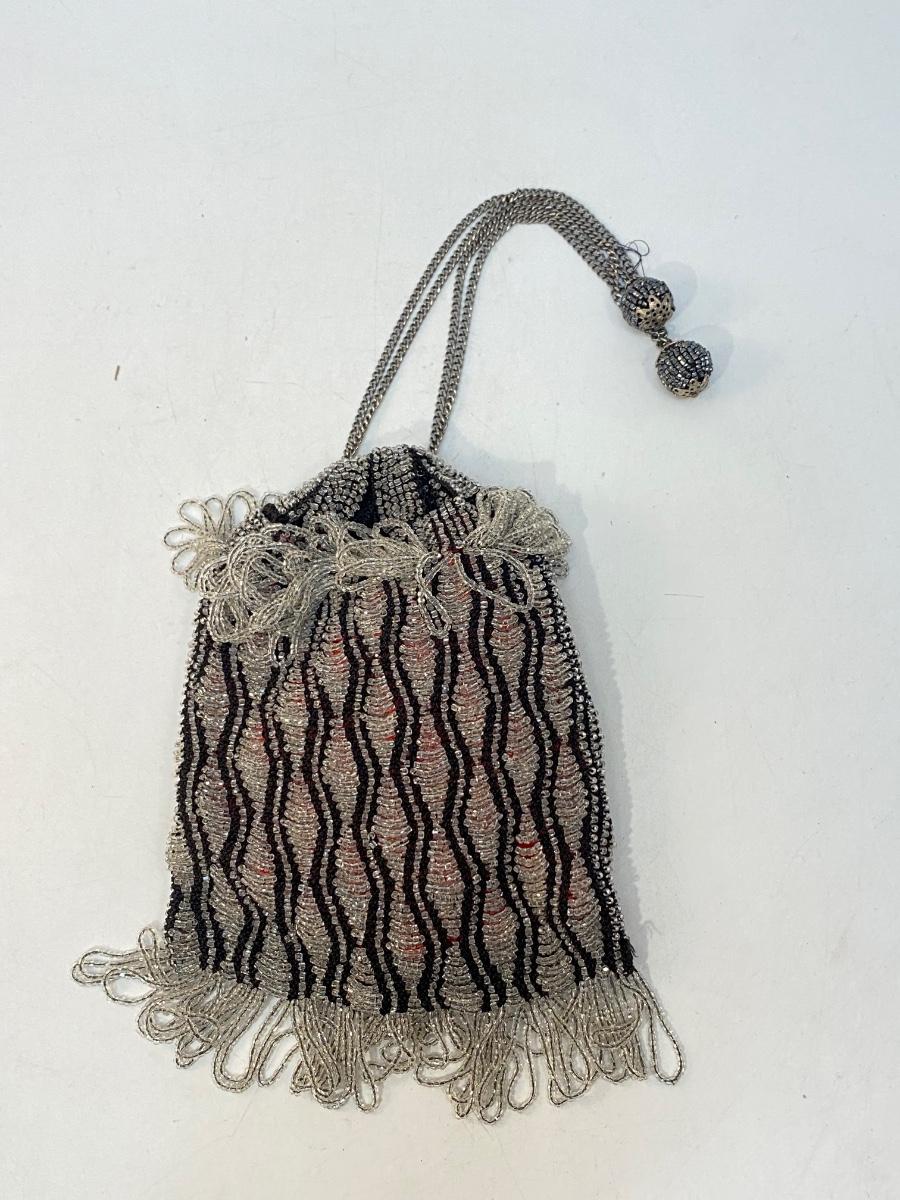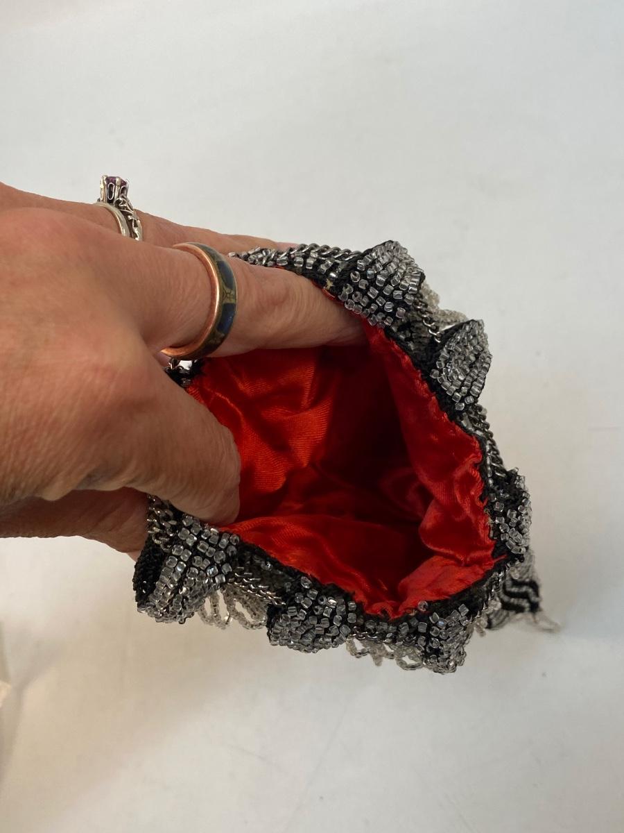 Vintage Antique Microbeaded Drawstring Flapper Purse Handbag. Silver glass beads with geometric design, loop fringe. Red lining. Metal chain drawstring. In good antique condition.