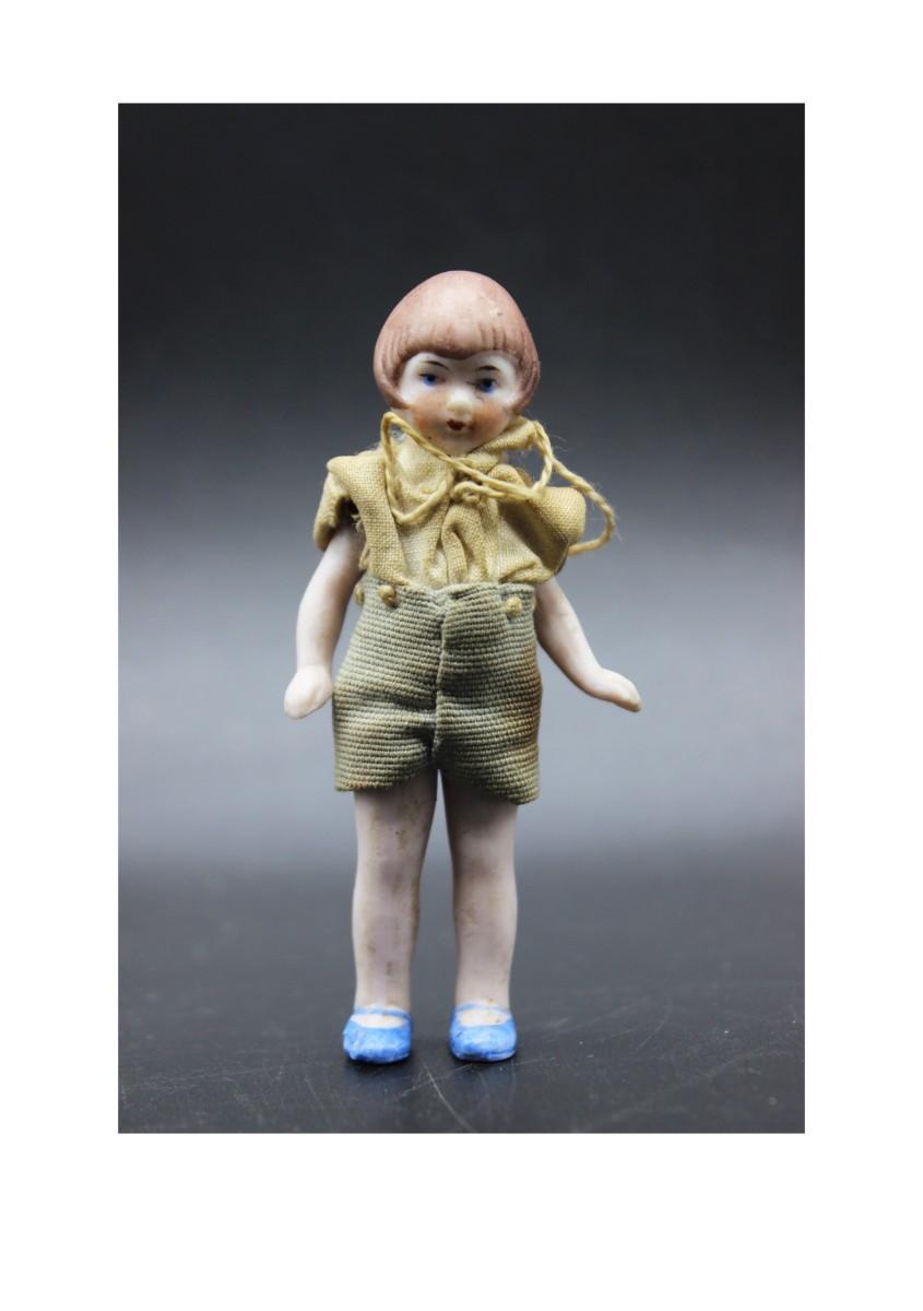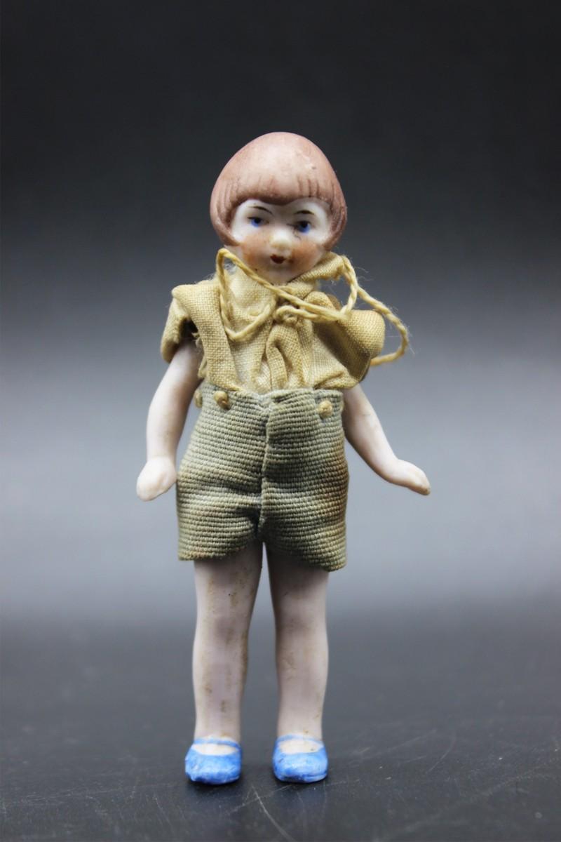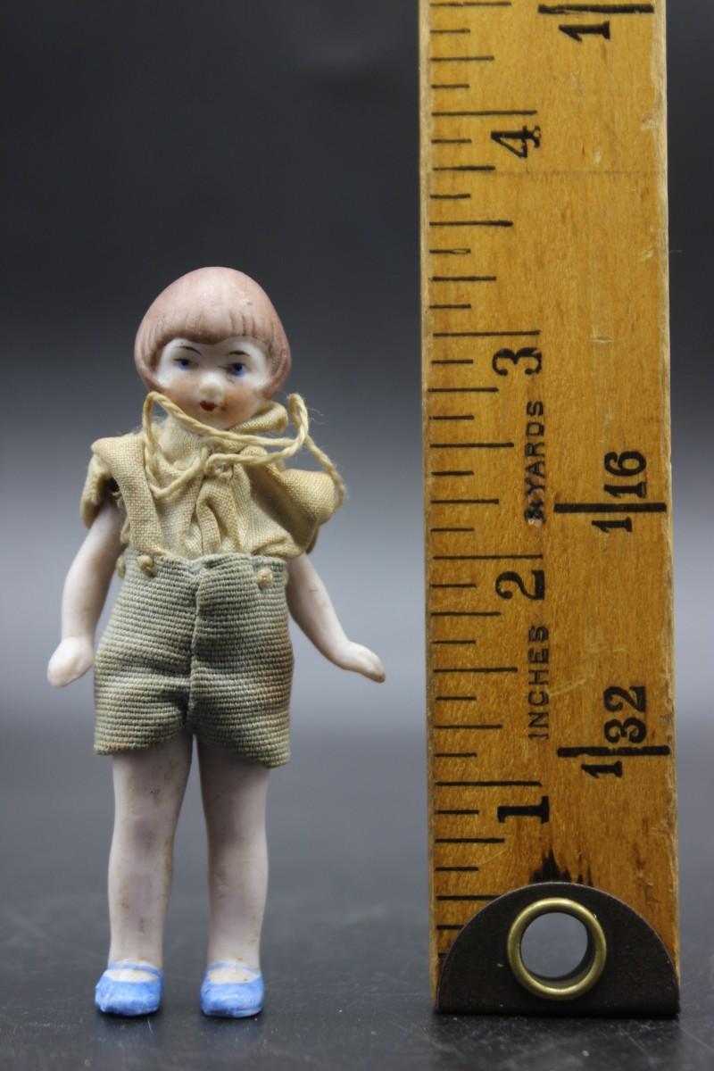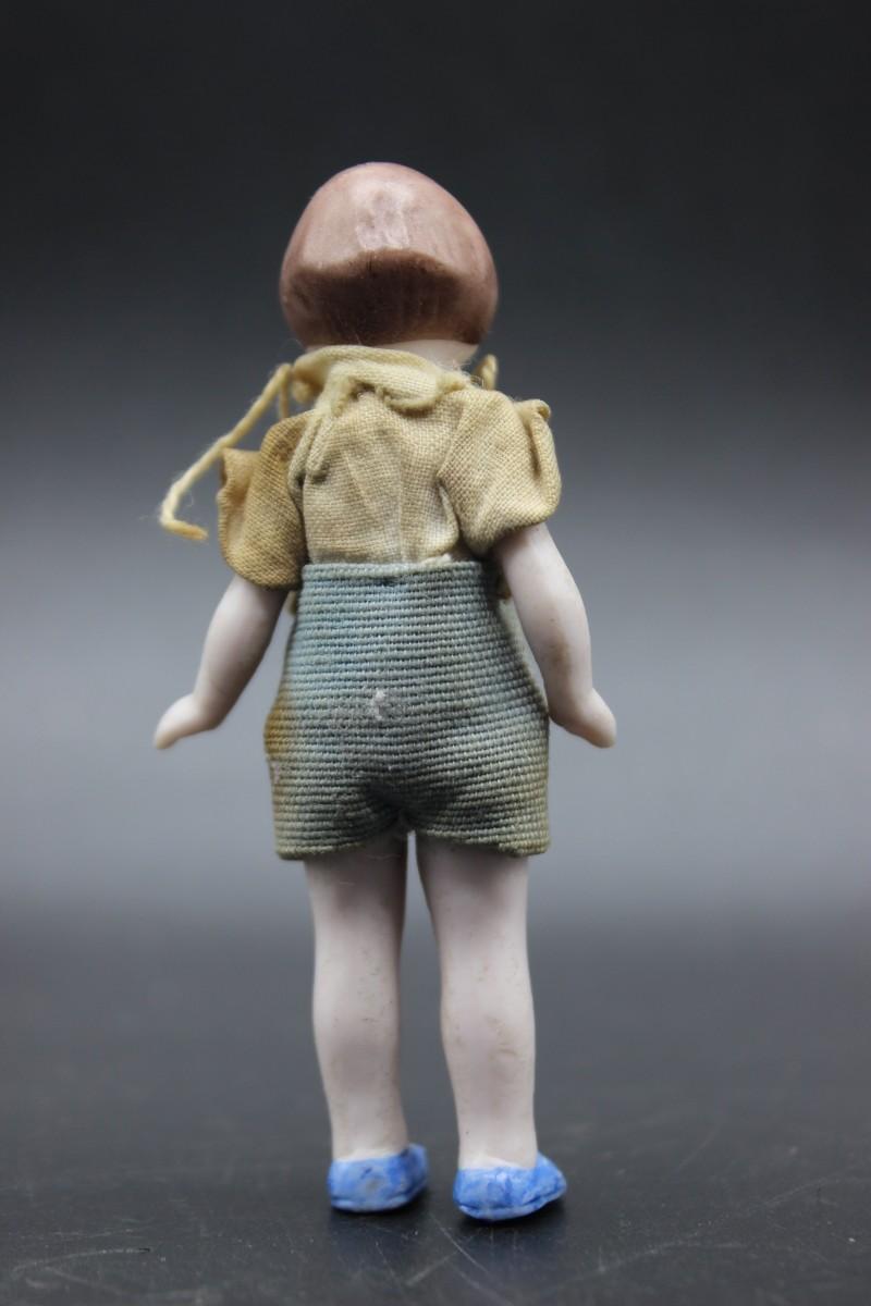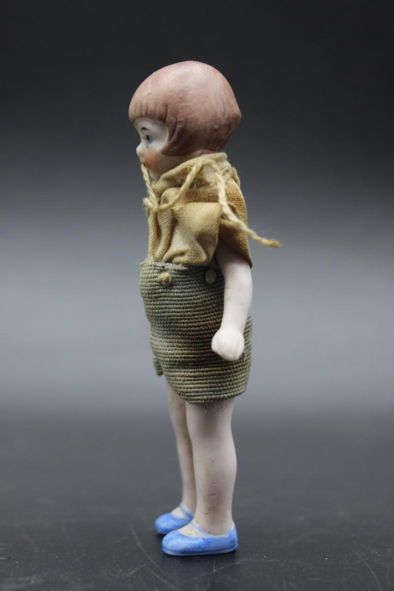Miniature porcelain dollhouse size doll figurine. Painted features handmade clothes. In good, aged condition. About 3" size.