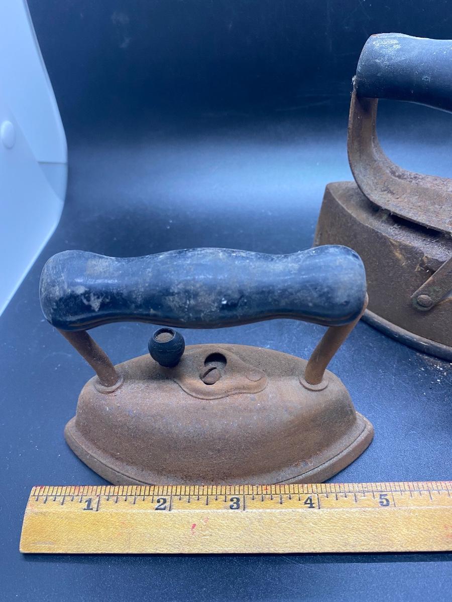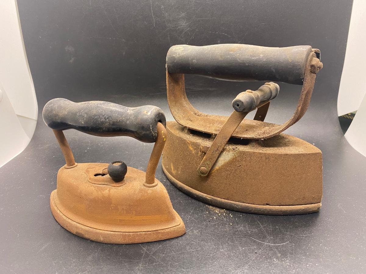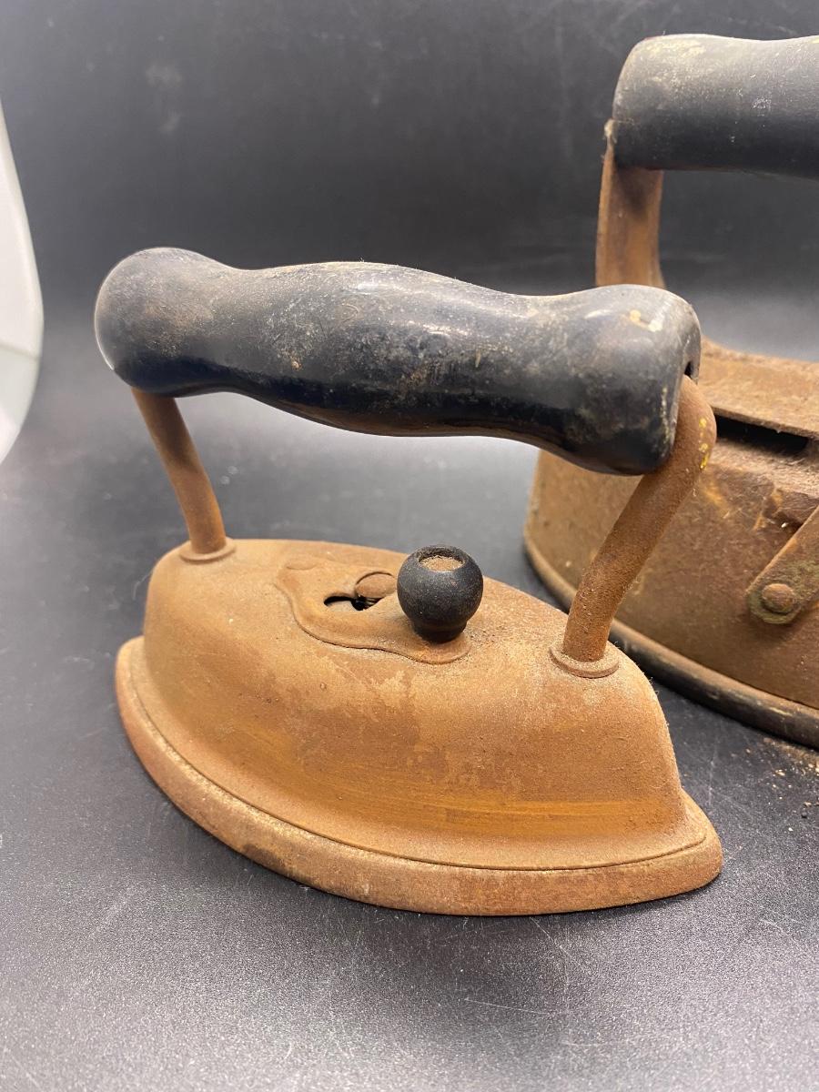 Vintage pair of sad irons. Definitely show their age with the rusty patina, may clean up nicely with a little work. Heavy.