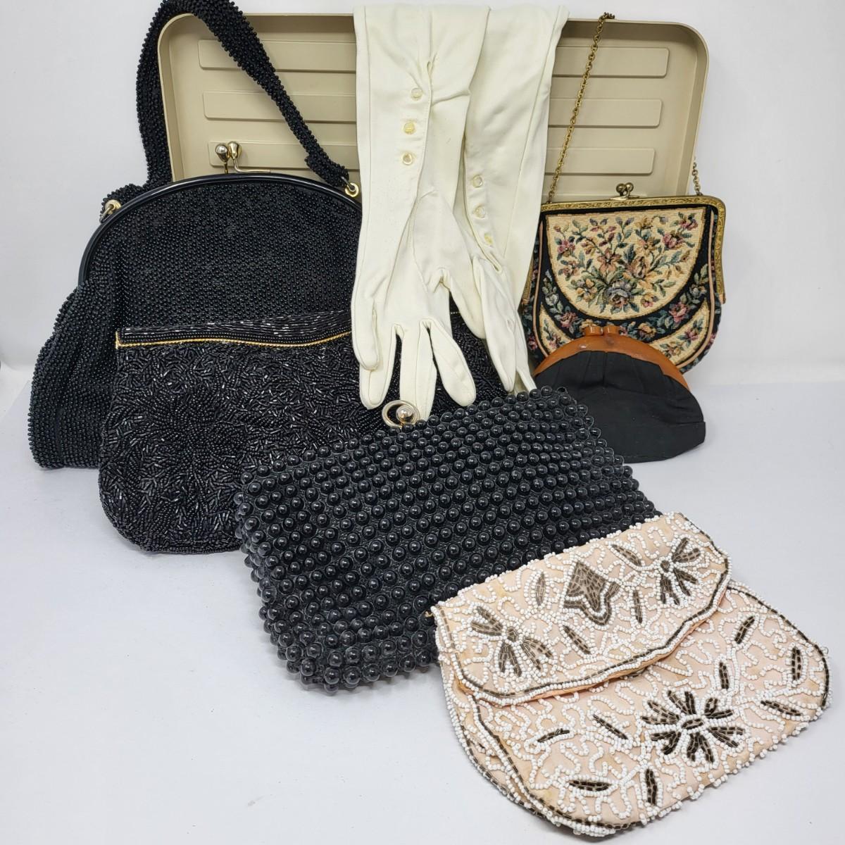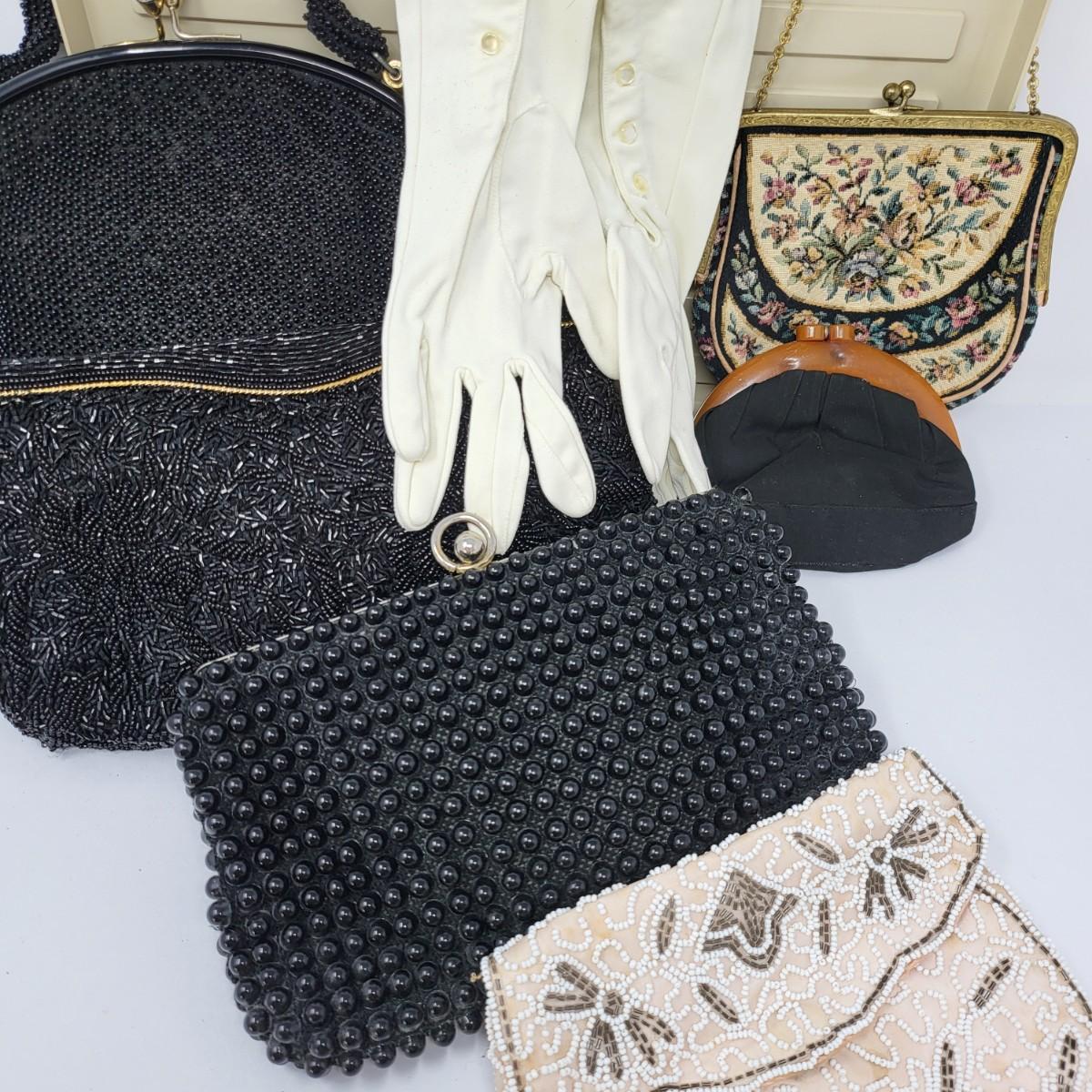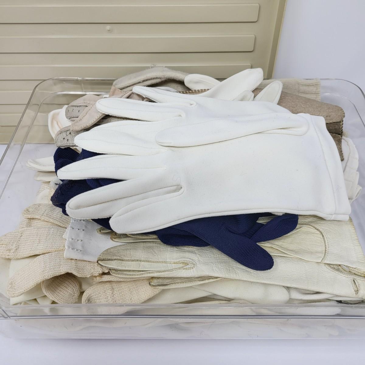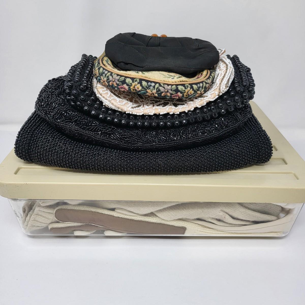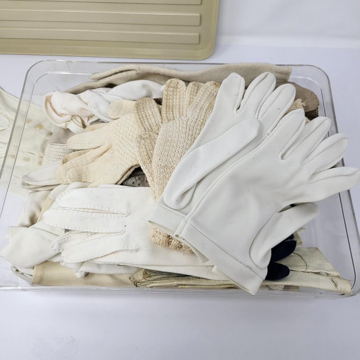 Sizes range from 11.5" long x 9.25" tall to a small coin purse size 5" long x 3.5" tall. Vintage plastic box loaded with vintage gloves, 'opera' length (up to elbow) gloves as well as wrist length.