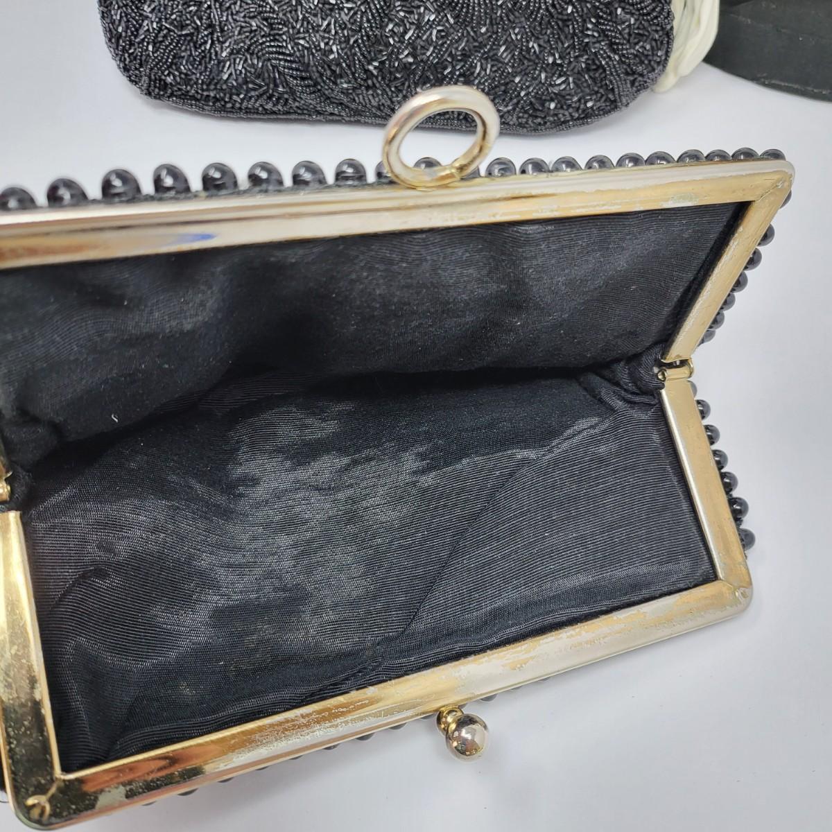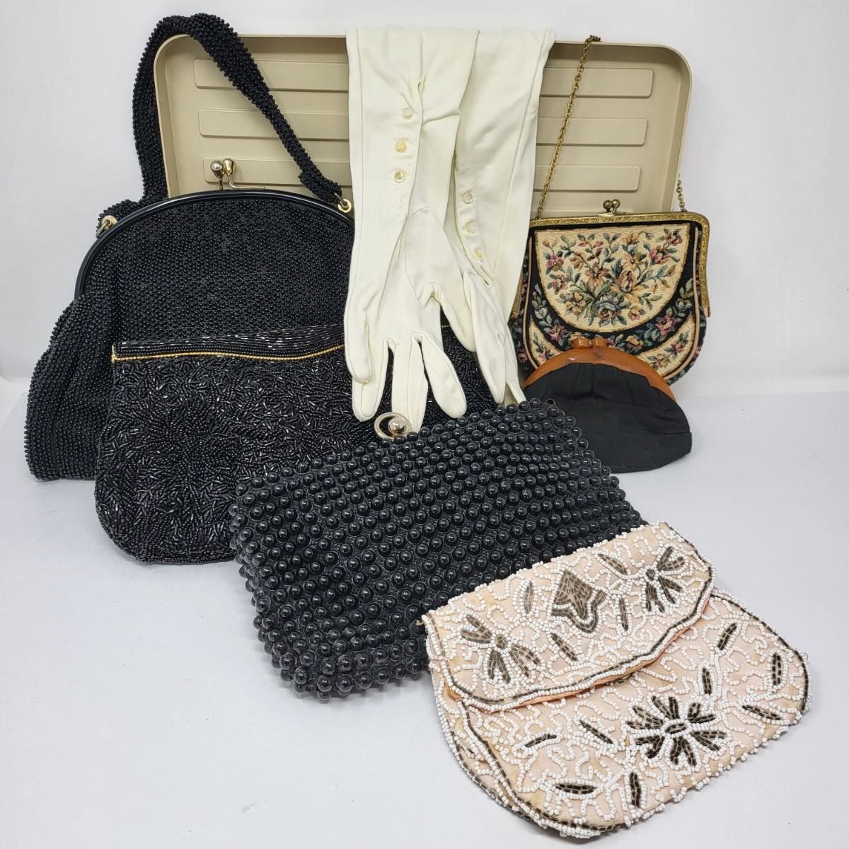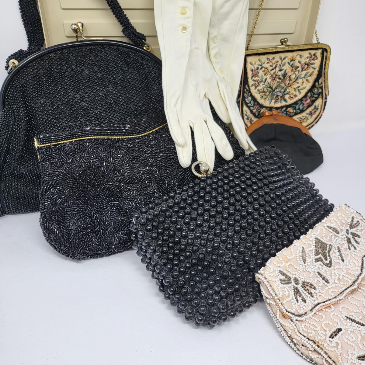 Plastic bead, glass seed bead, micro bead, tapestry and more purses, six total. Walborg, Nordstrom, the White House.