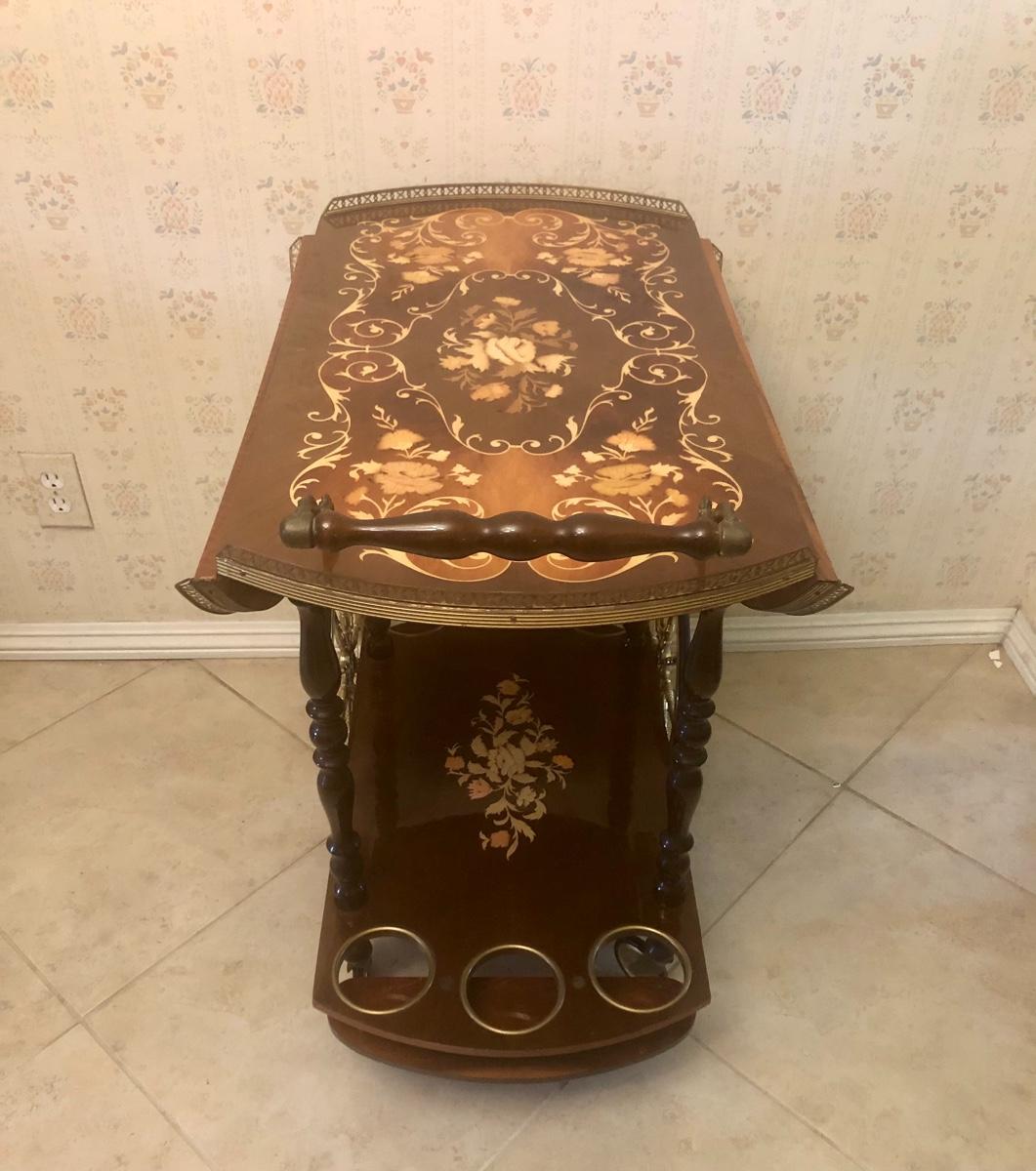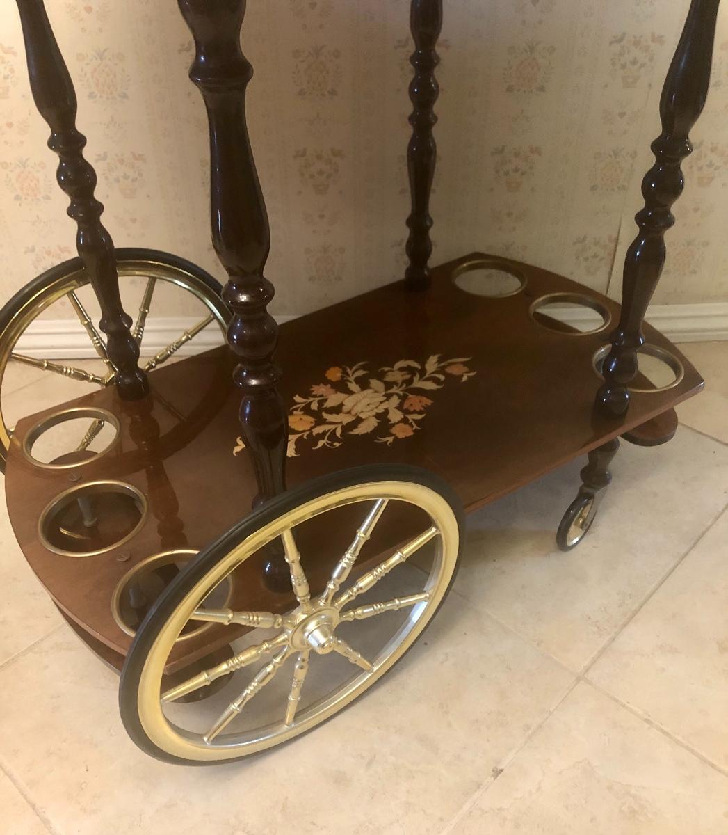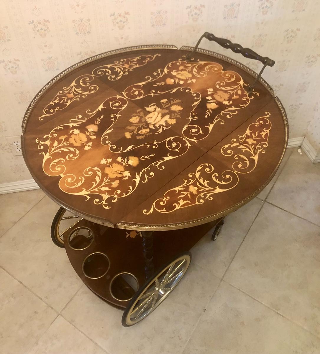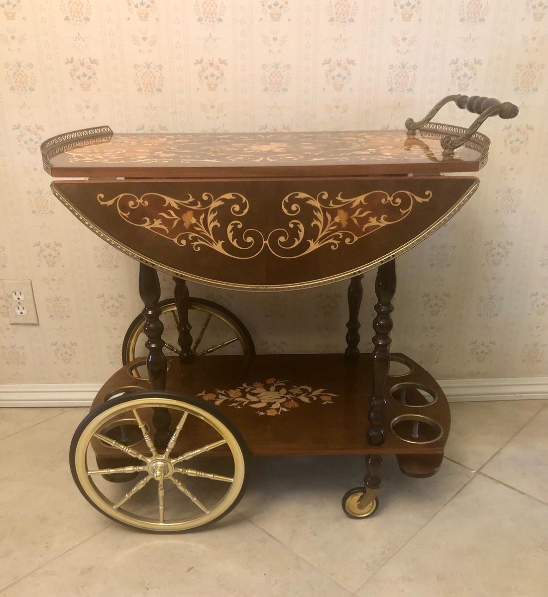 Vintage Antique Italian Marquetry Rolling Bar Tea Cart Wooden Drop Down Leaf