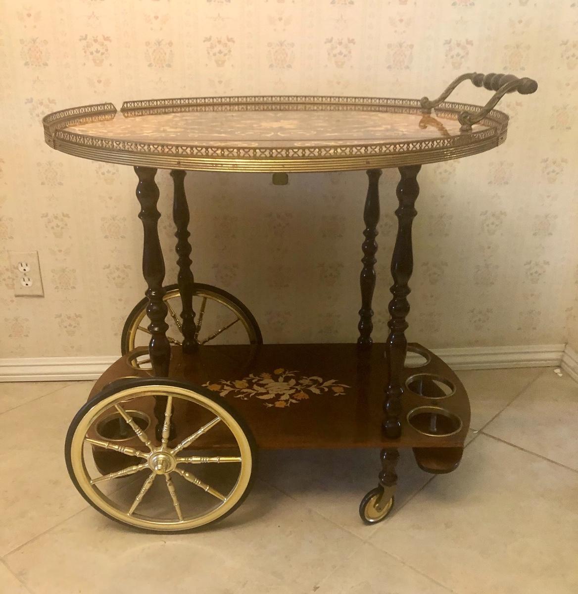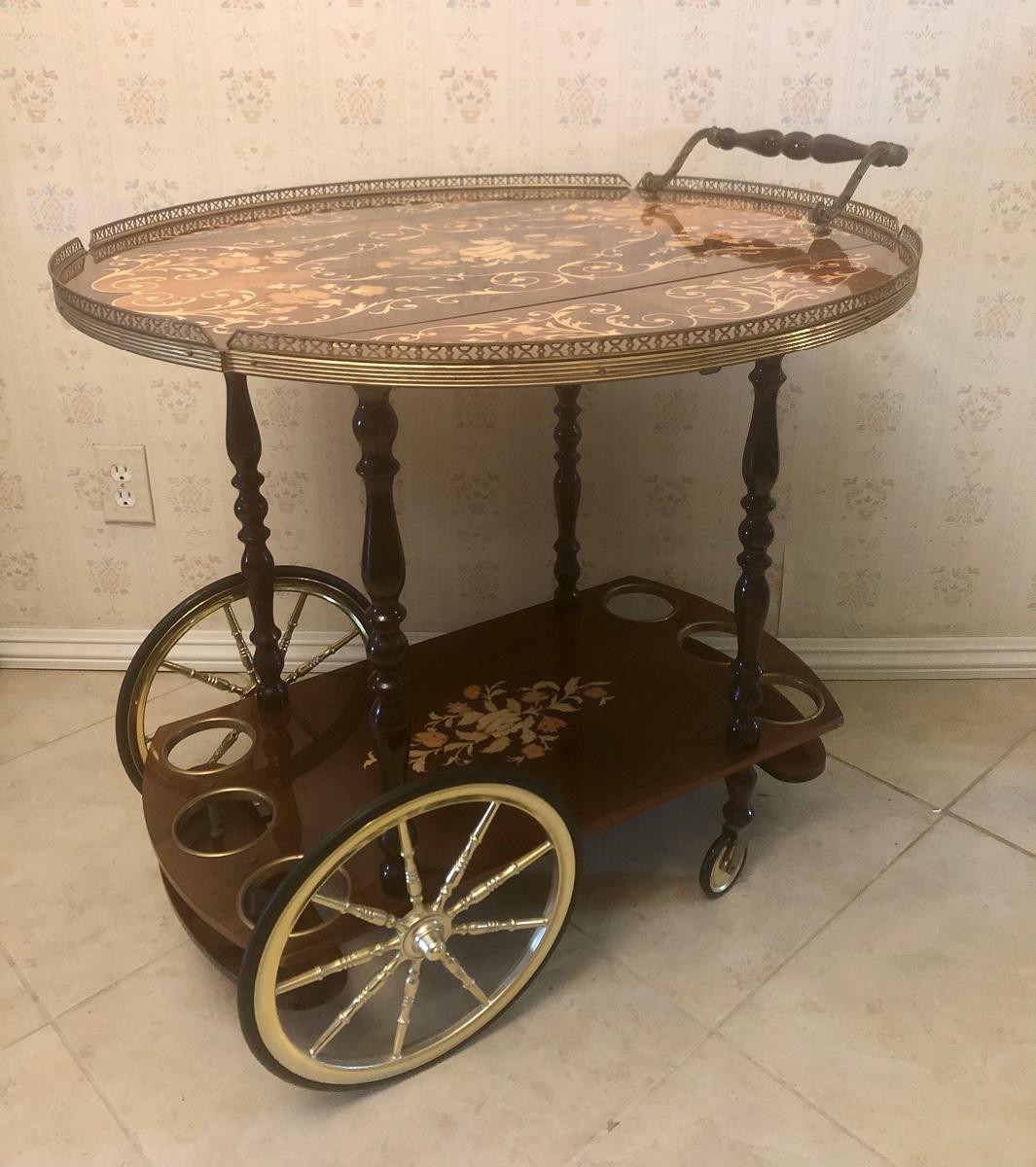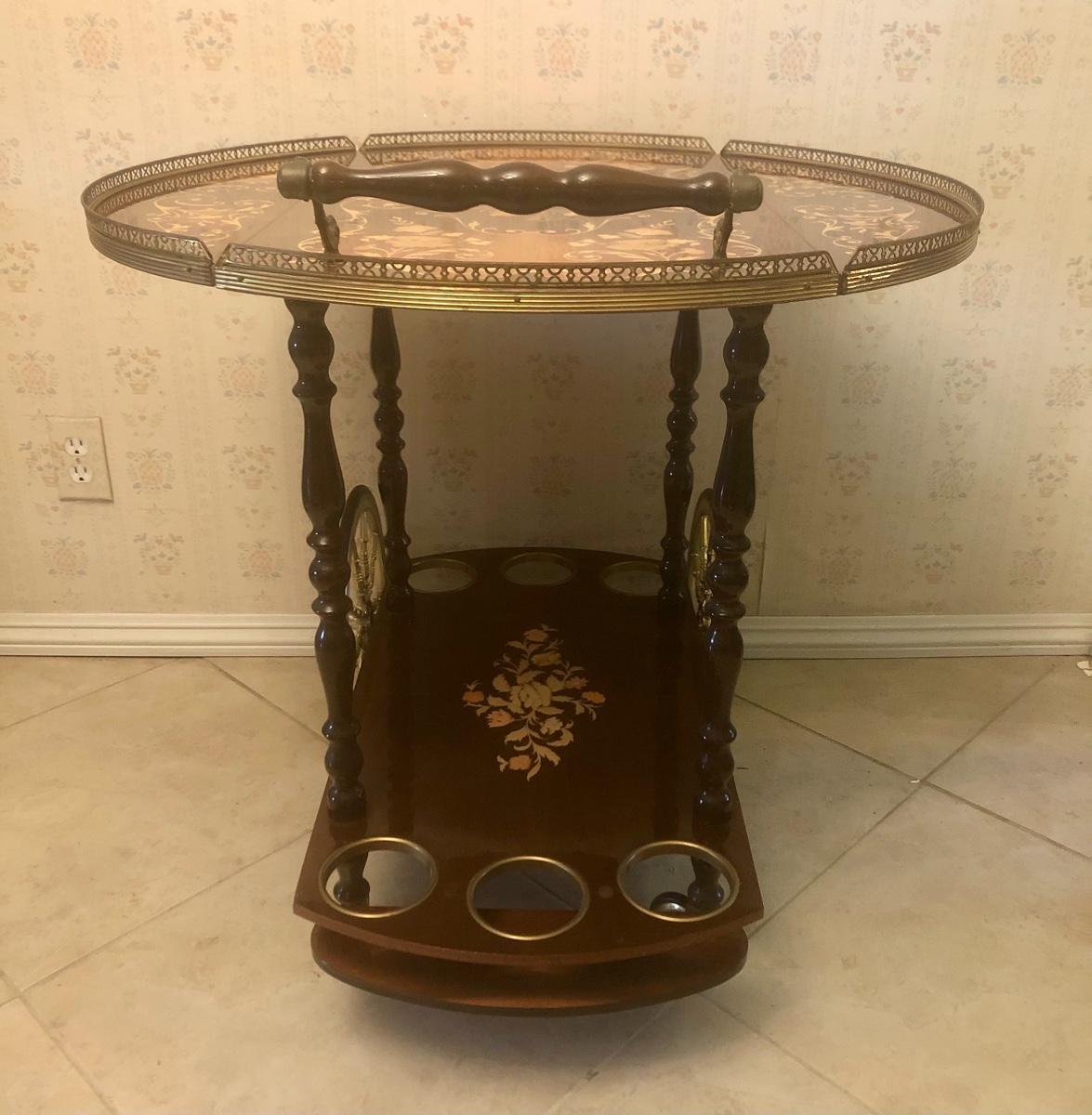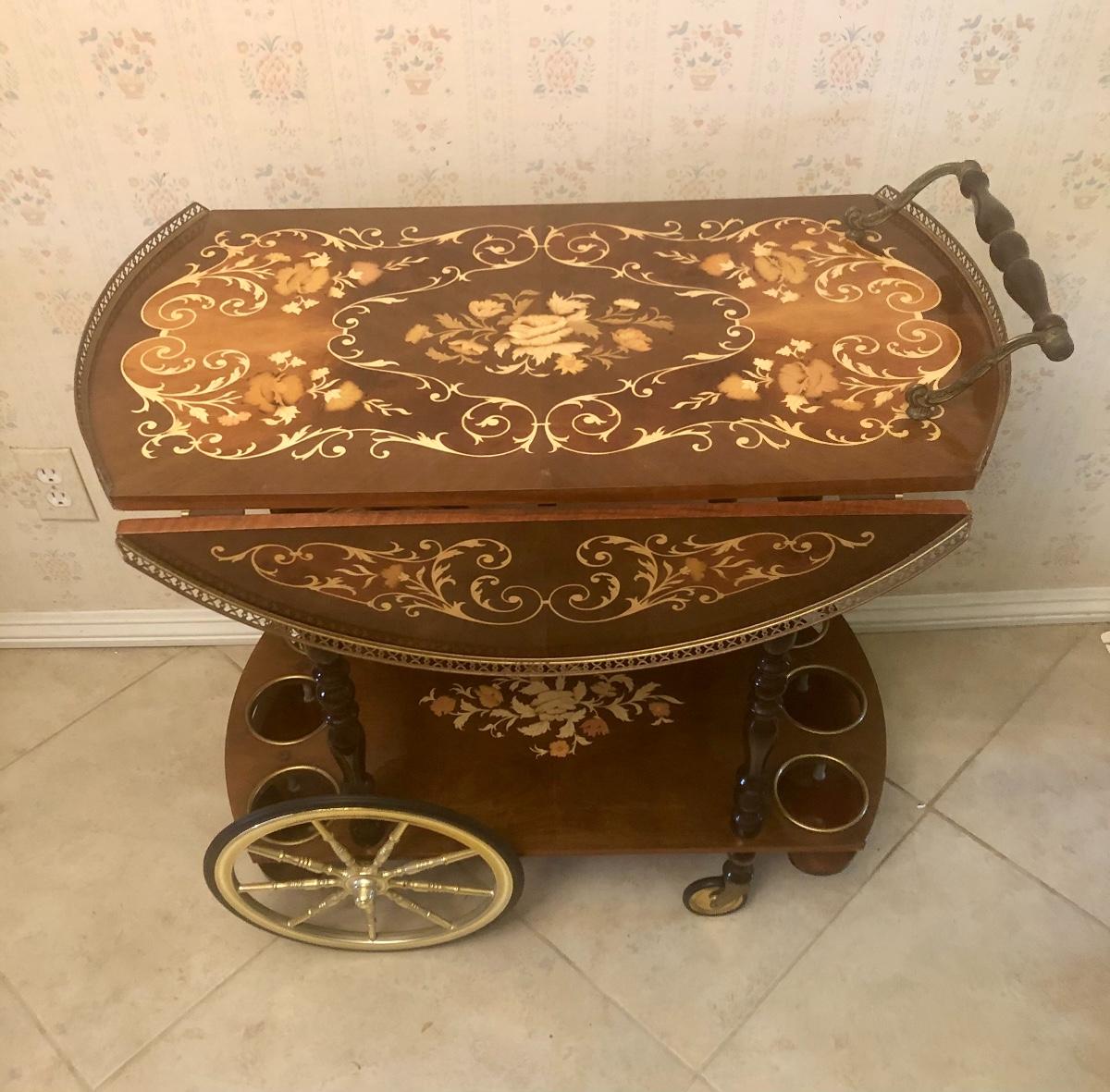 Vintage Antique Italian Marquetry Rolling Bar Tea Cart Wooden Drop Down Leaf