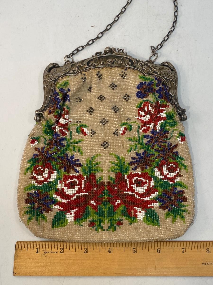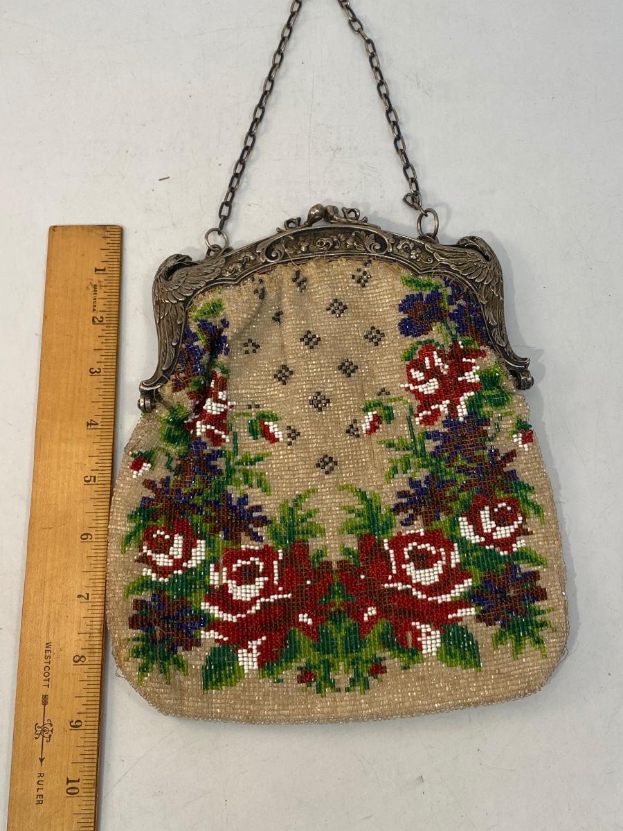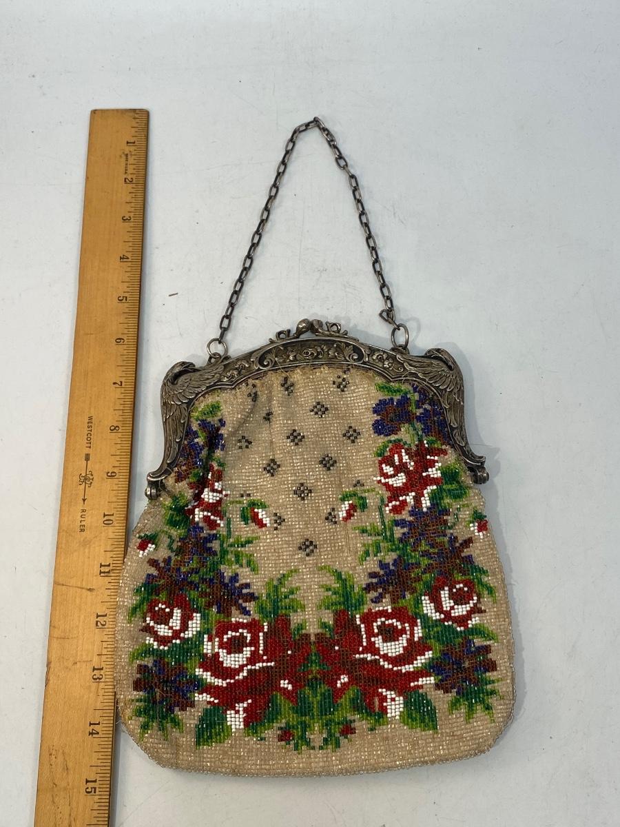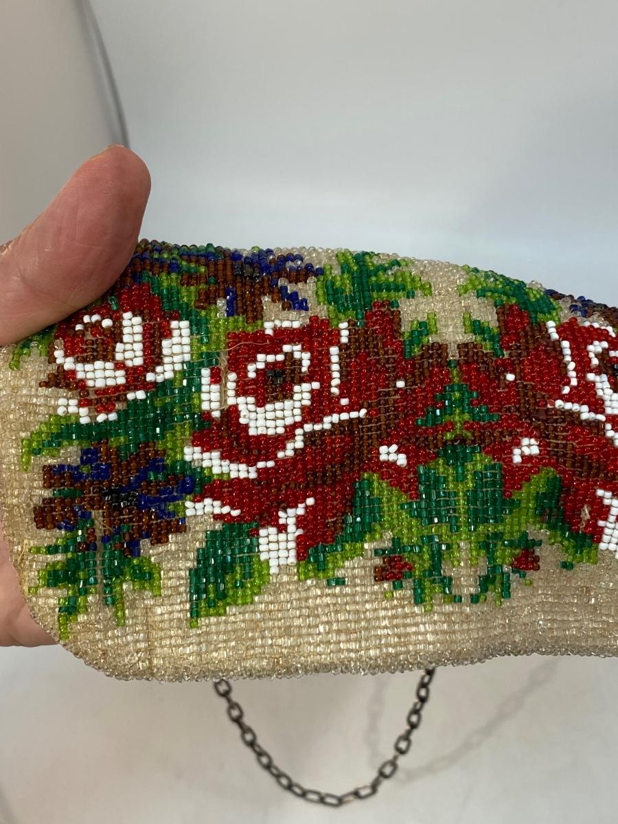 Vintage Antique Rose Pattern Micro Beaded Flapper Purce Clutch Handbag. Beautifully done purse, in good condition. Pattern is the same on both sides. Red lining. No holes found in purse. Detailed metal frame adds to the beauty.