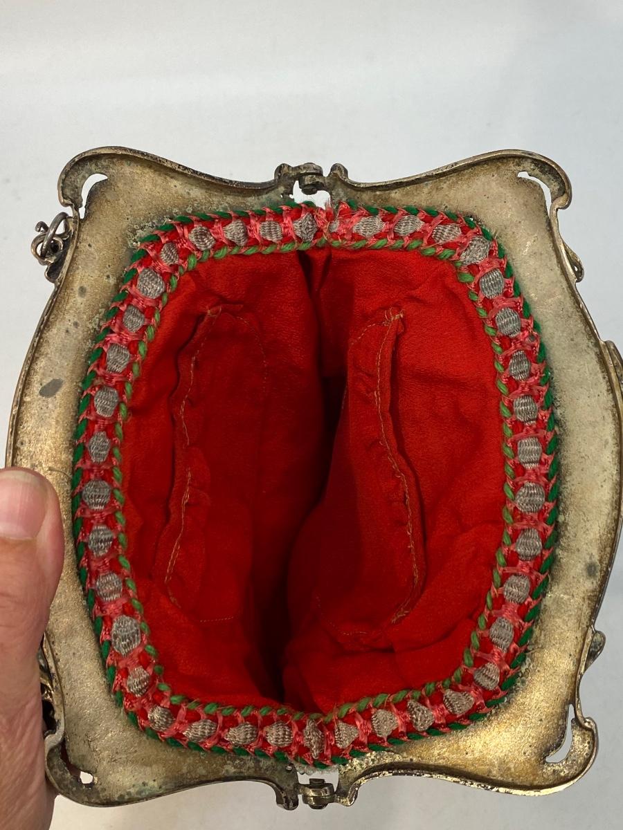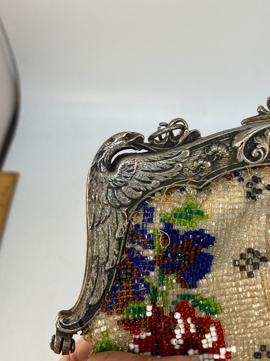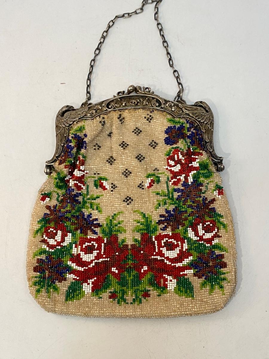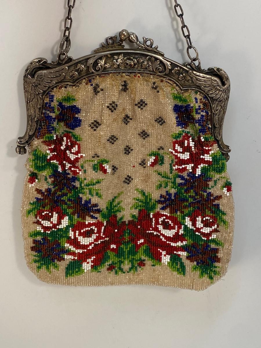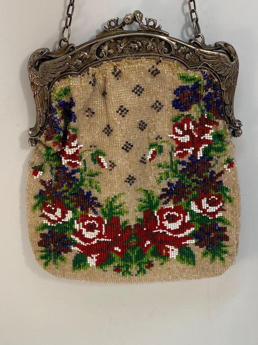 Vintage Antique Rose Pattern Micro Beaded Flapper Purce Clutch Handbag. Beautifully done purse, in good condition. Pattern is the same on both sides. Red lining. No holes found in purse. Detailed metal frame adds to the beauty.
