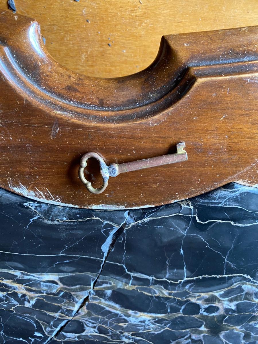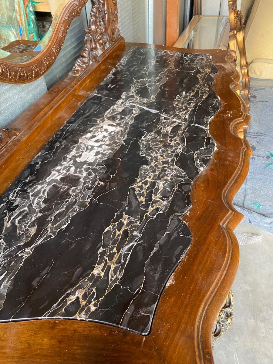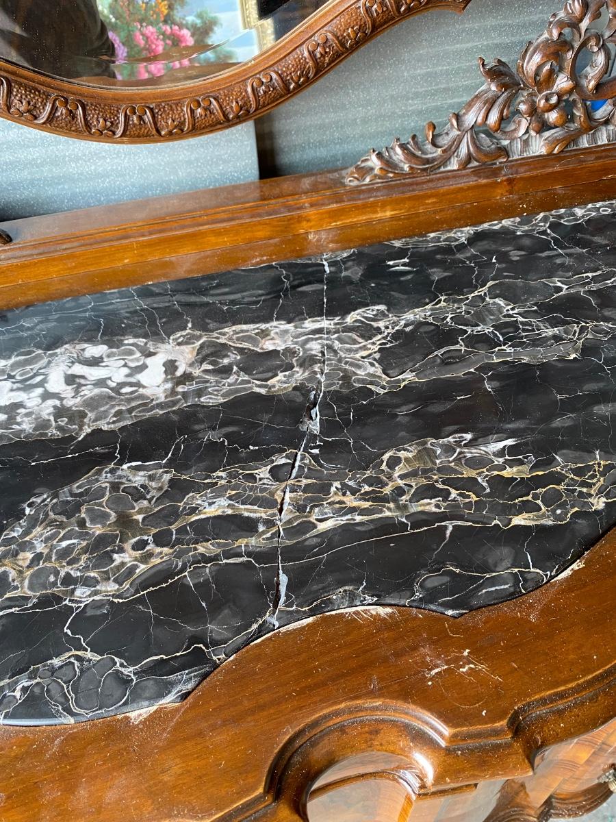 Vintage Antique Serpentine Front Art Nouveau Stone Top Buffet Sideboard Dresser with Tilting Mirror. Four drawers, top with key. Carved floral design around mirror. Black marble inlaid top has been cracked. Other than stone damage, the piece is in good condition. 55"x22"x79" approximate size including mirror. Mirror can easily be removed.