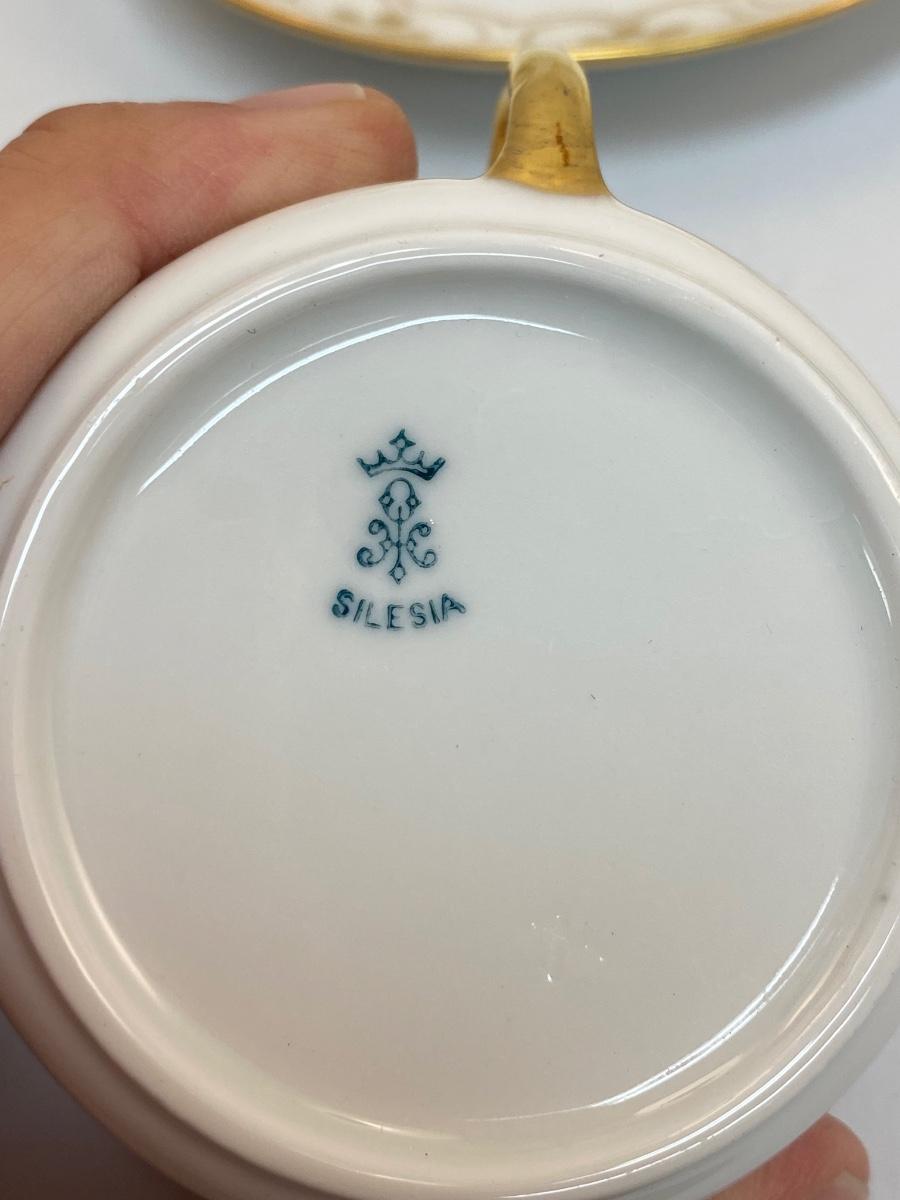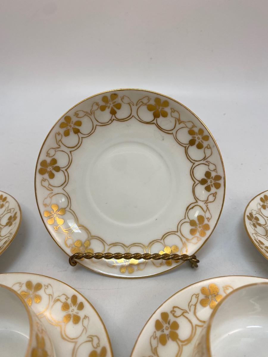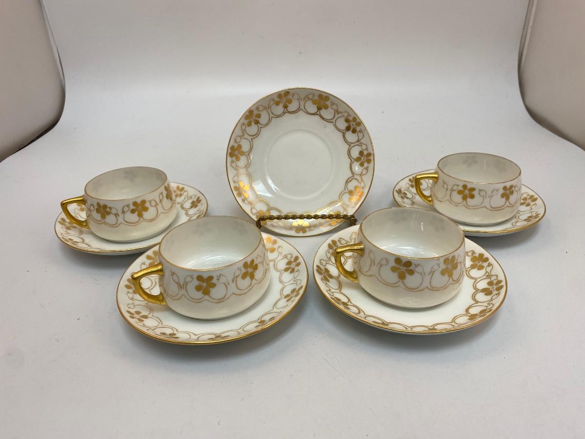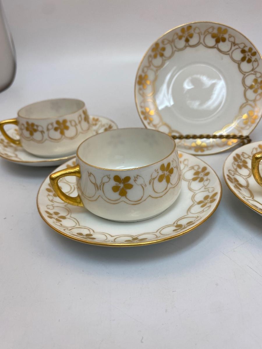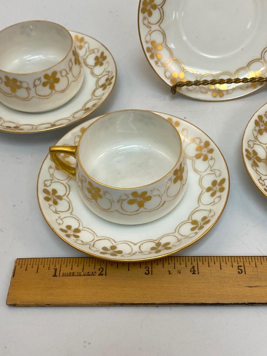 Vintage Antique Silesia White with Gold Gilt Demitasse Teacup & Saucer Set. 4 pairs and an extra saucer plate. Light wear to the gold pattern, no chips.