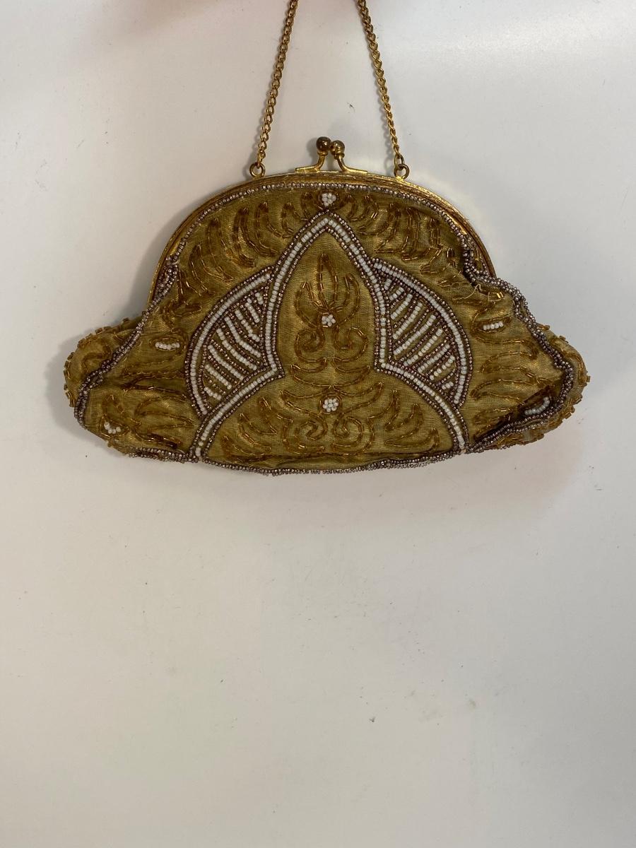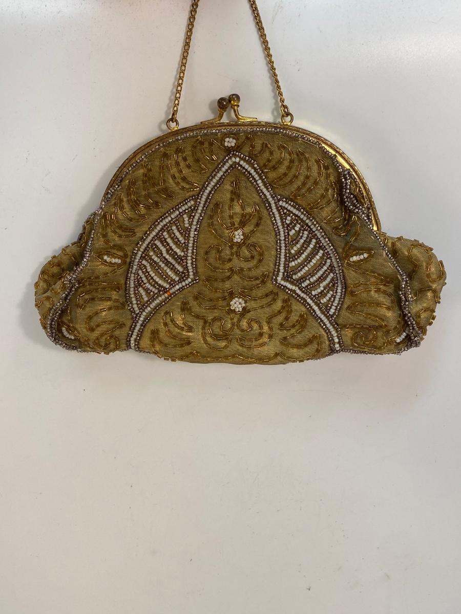 Vintage Antique Small Scalloped Shaped Gold Beaded Handbag Clutch Purse. Gold fabric with gold and white beading. Some discolor from age but in overall good condition.