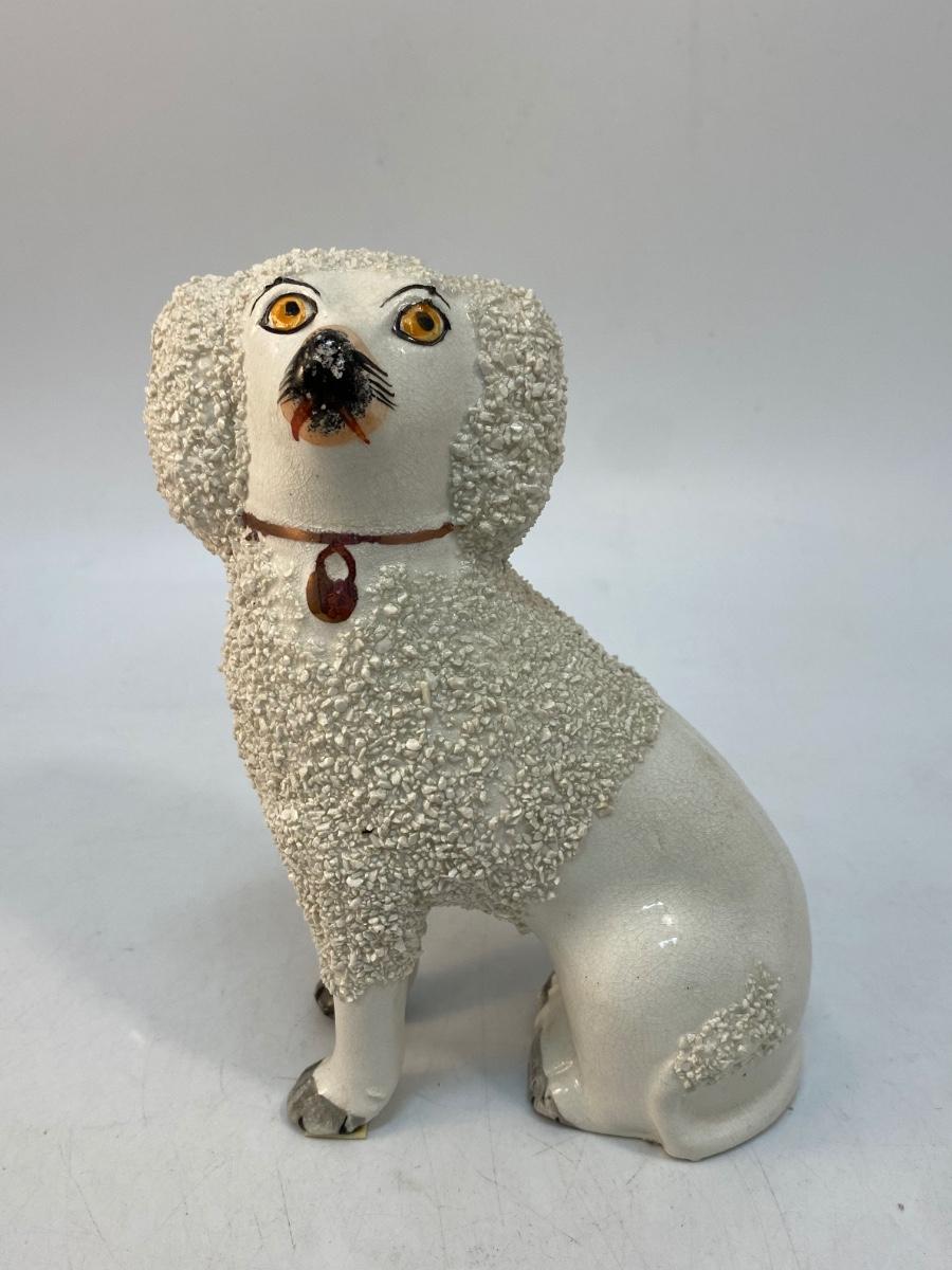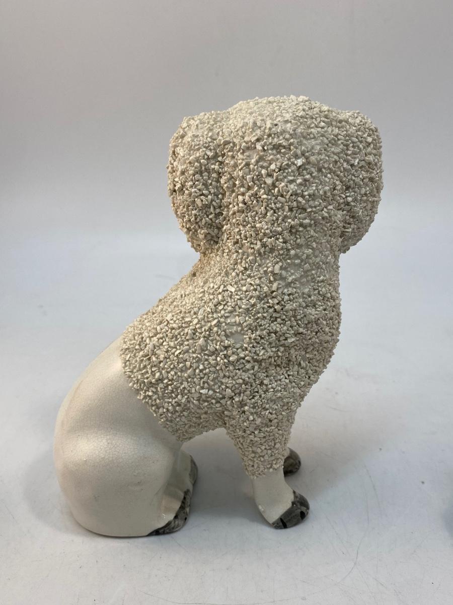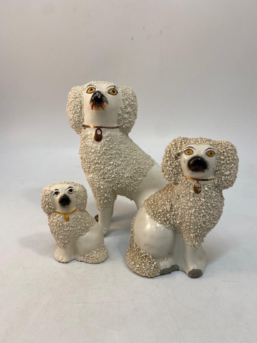 Vintage Antique Staffordshire England Confetti Poodle Dog Figurines Set of 3. Ceramic dog figurines, two are stamped on the bottom. Textured "Fur" coat. All are in good vintage condition. From just over 6" to under 3" size.