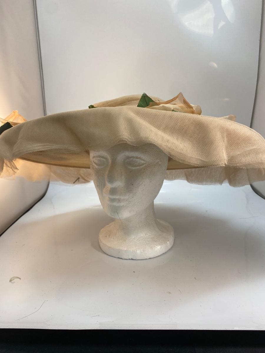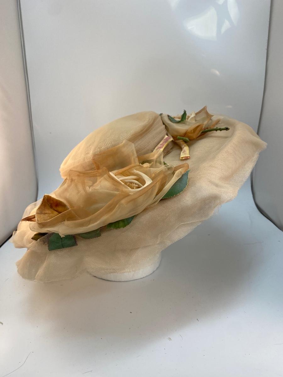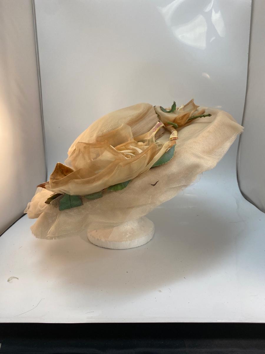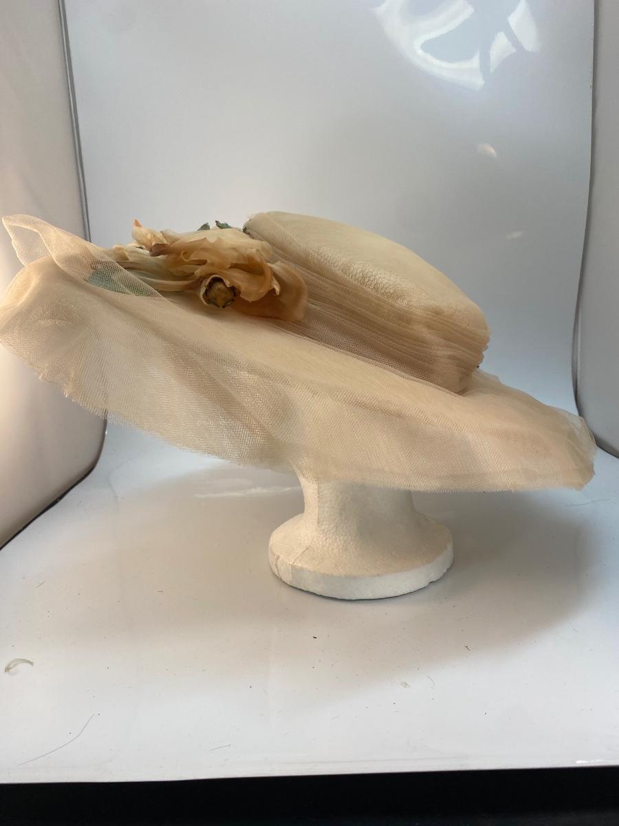 Vintage Antique Starched Lace Wide Brim with Flowers by Collette Cathay California. Light colored starched lace hat with sheer frill and faux flowers. Wide brim. Good vintage condition.