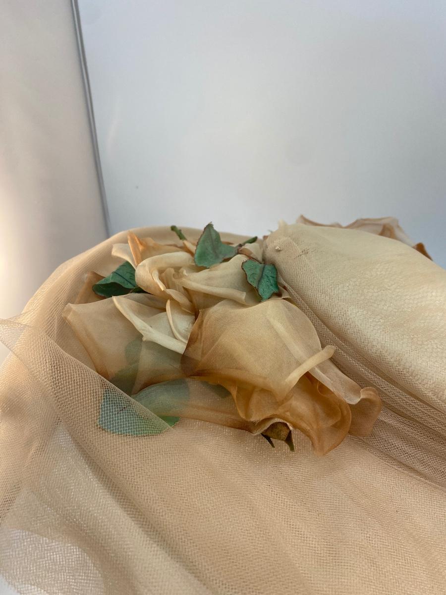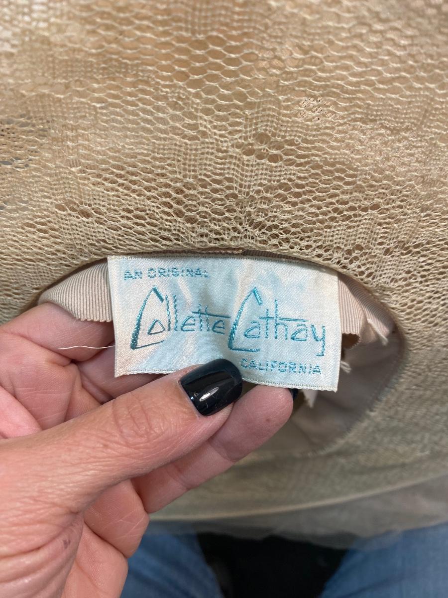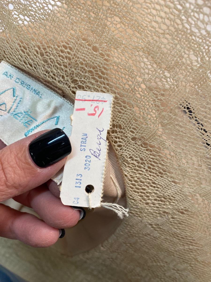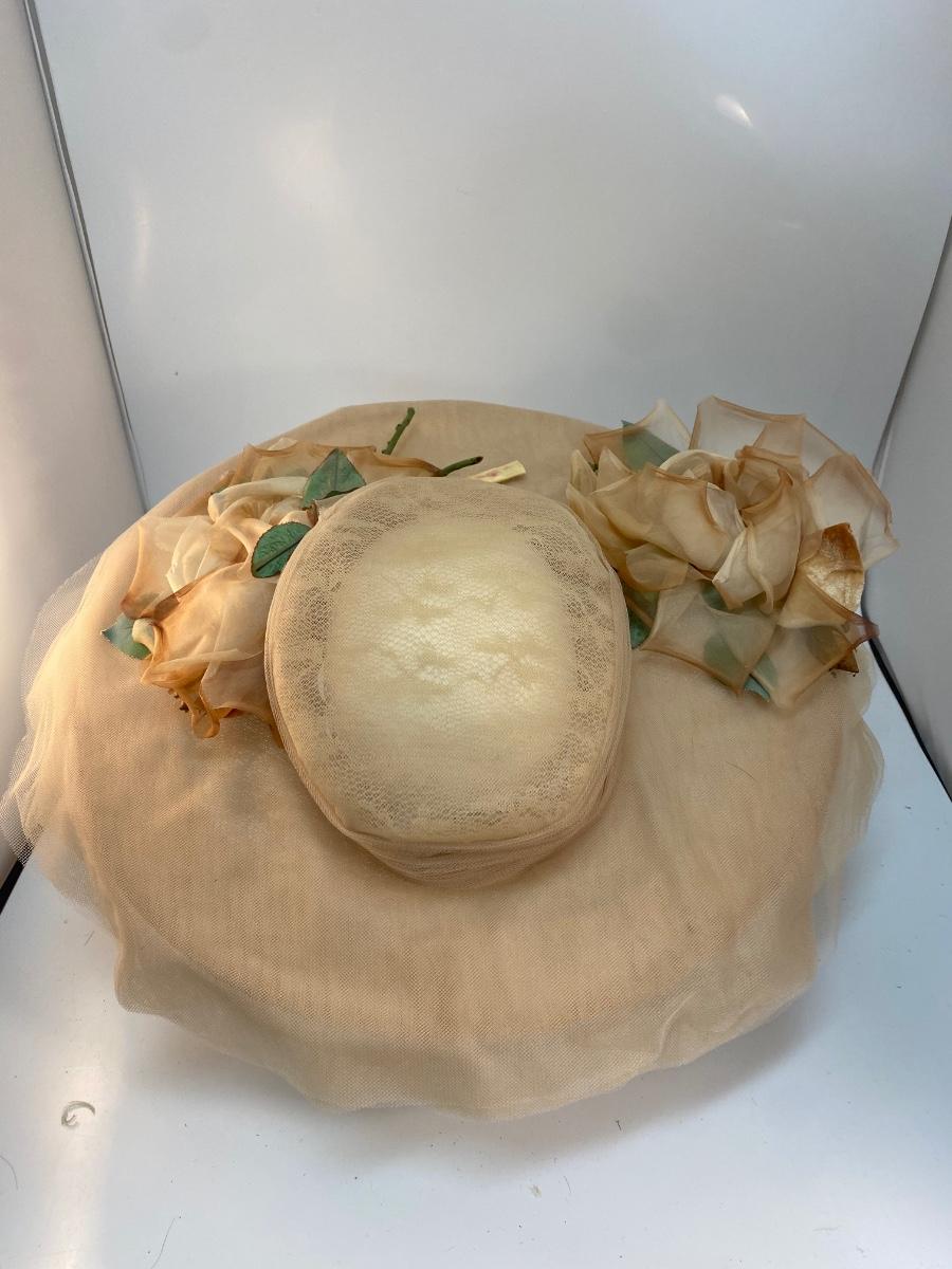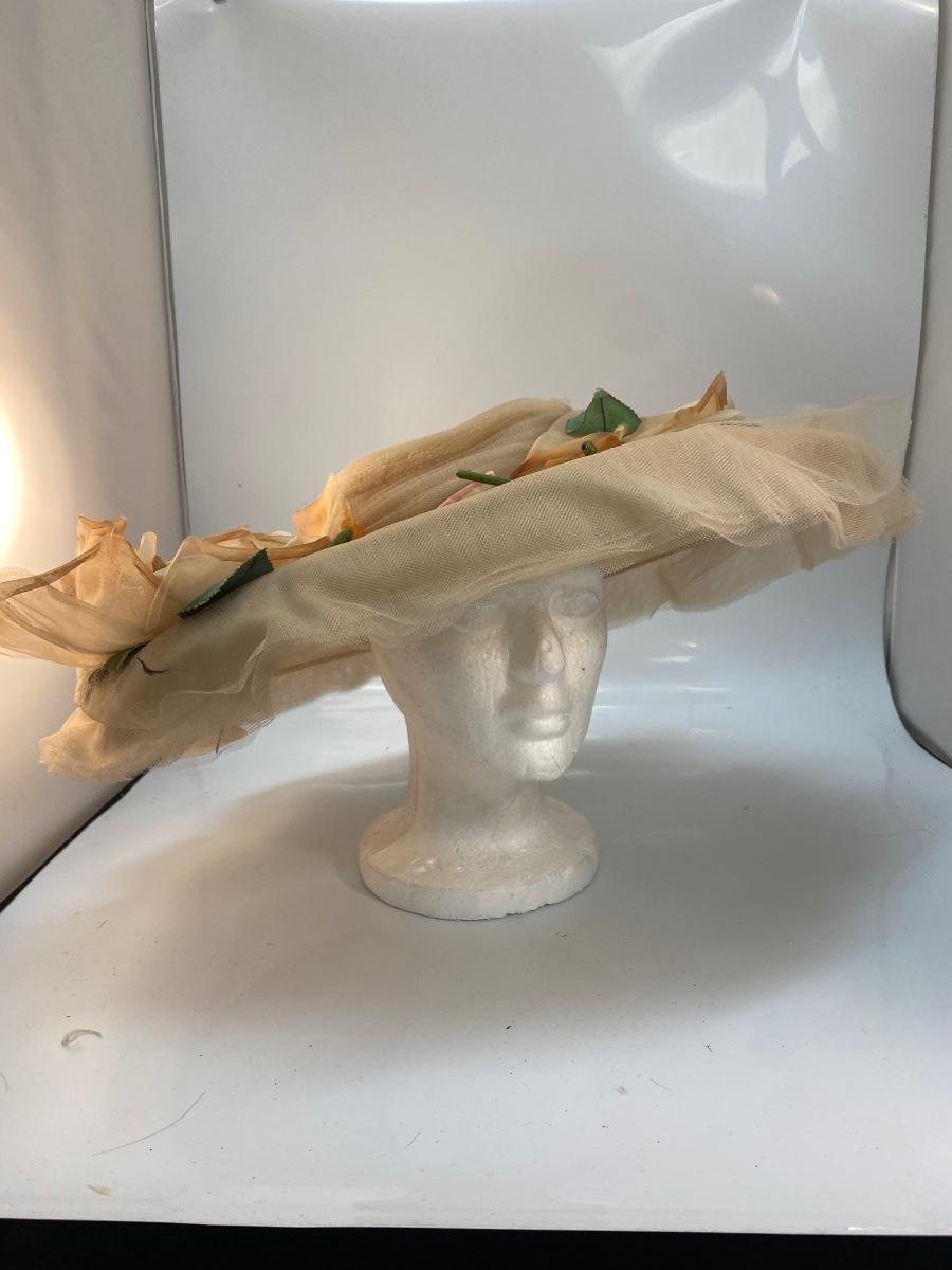 Vintage Antique Starched Lace Wide Brim with Flowers by Collette Cathay California. Light colored starched lace hat with sheer frill and faux flowers. Wide brim. Good vintage condition.