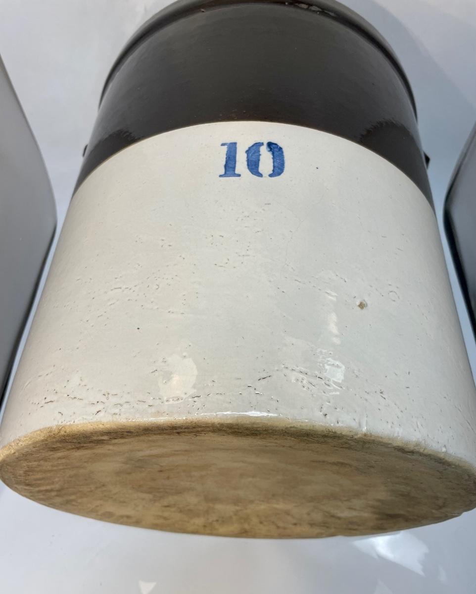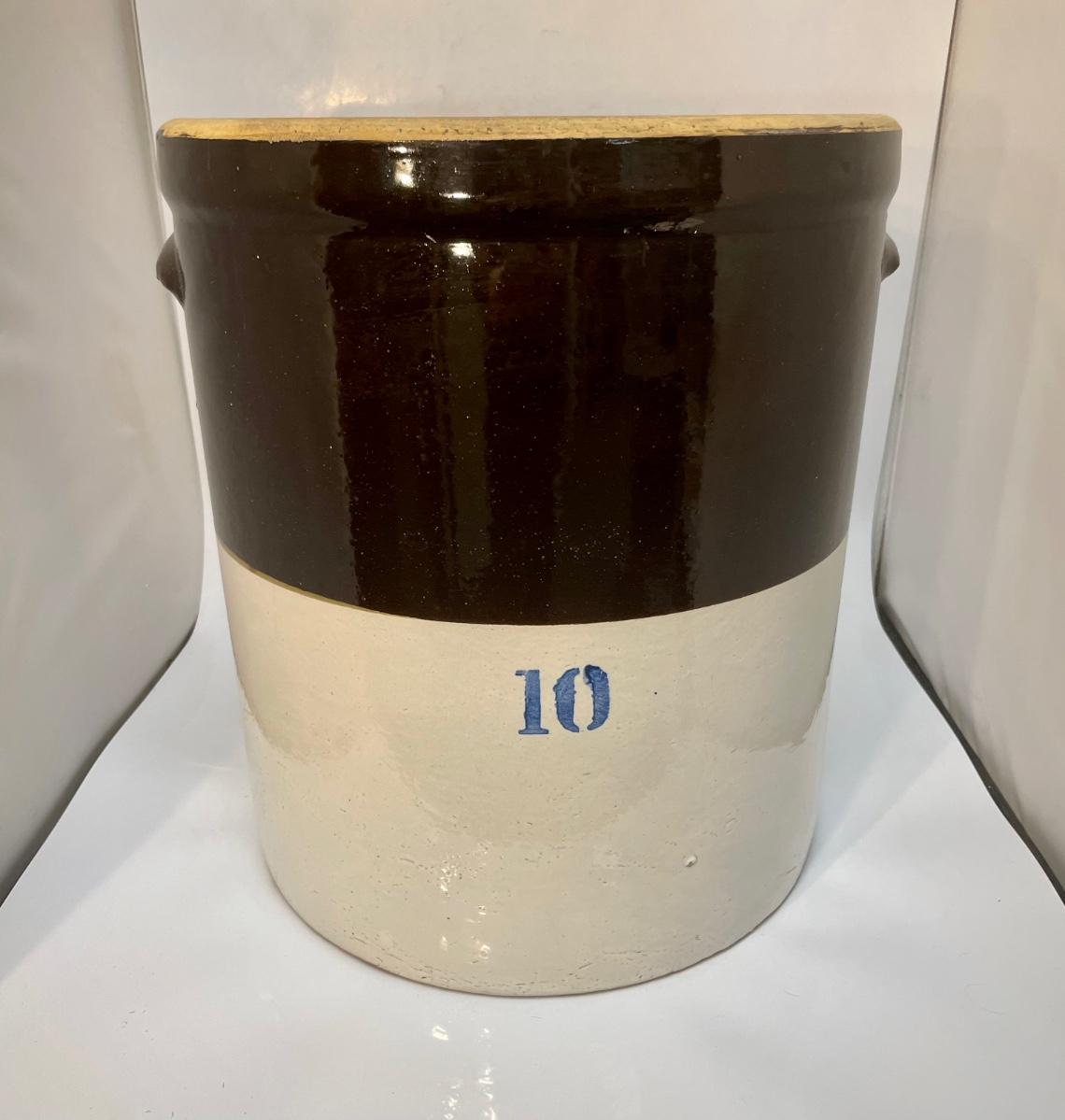 Vintage Antique Stoneware Salt Glaze Two Tone 10 Gallon Stub Handle Crock. Marking indicates 10-gallon size. No maker mark on the bottom. In good vintage condition.