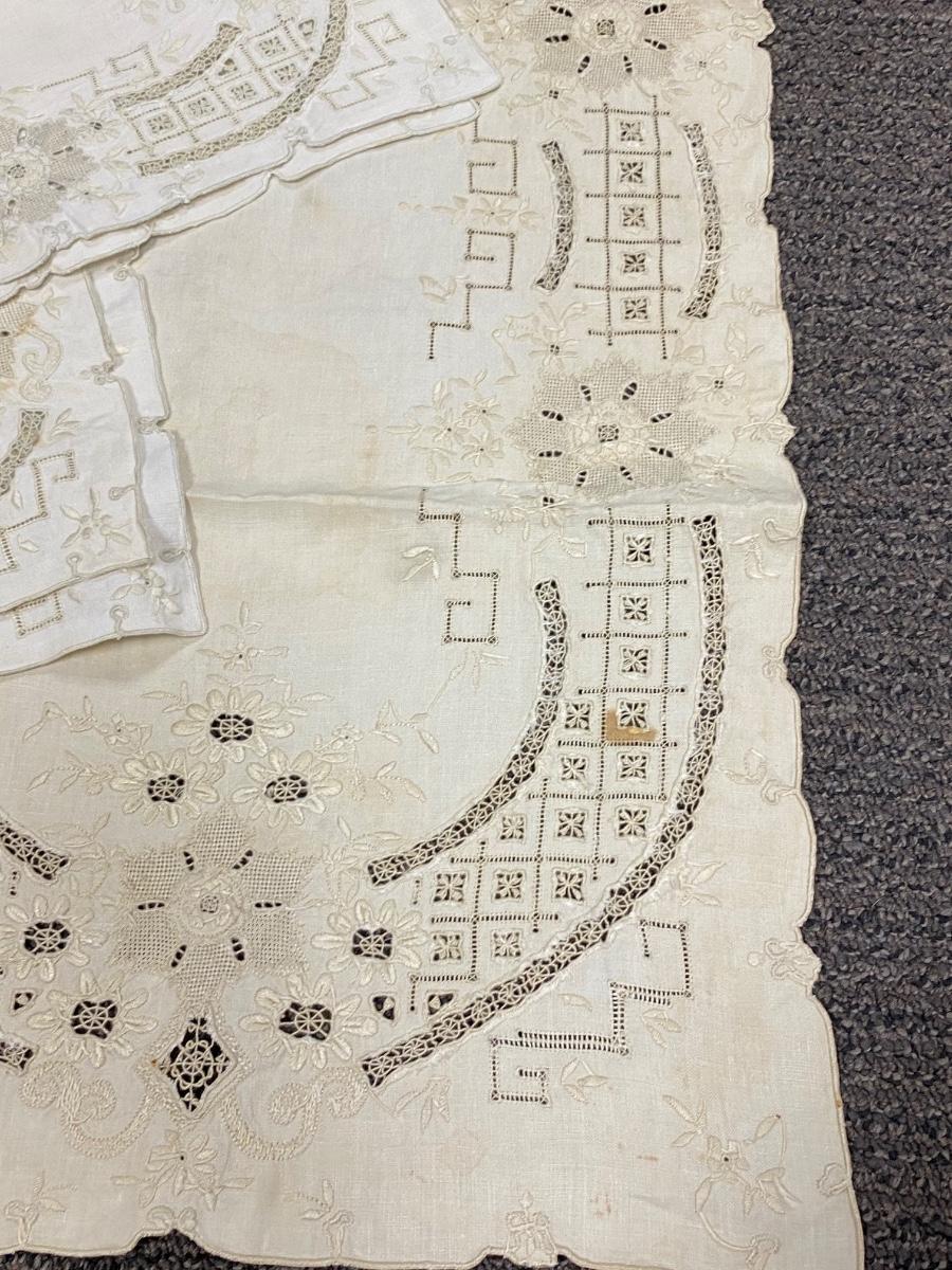 Vintage Antique Table Linen Set - Runner with 6 Placemats. In used vintage condition. Beautiful open work embroidered pattern. There is some discolor and light spots.