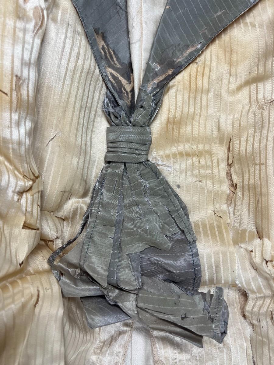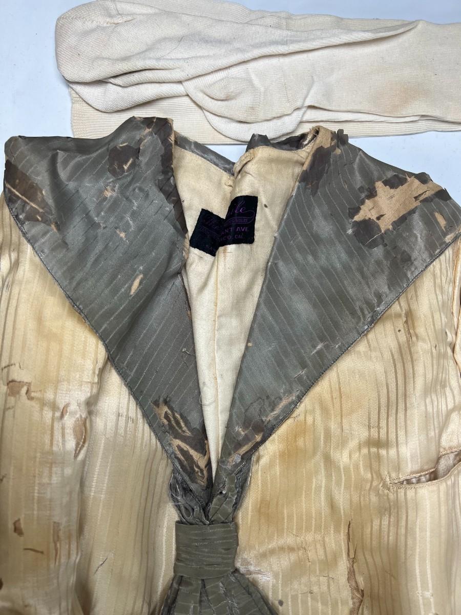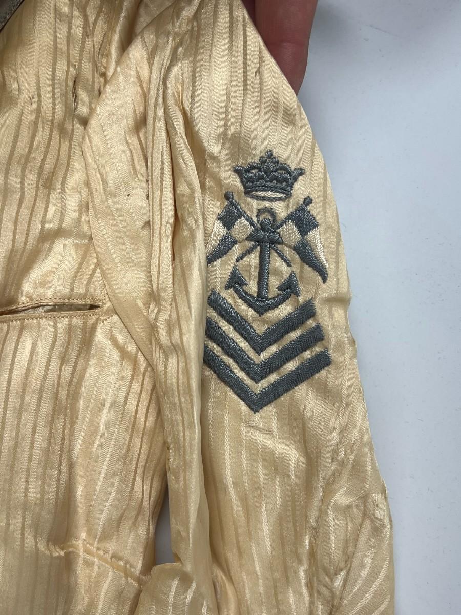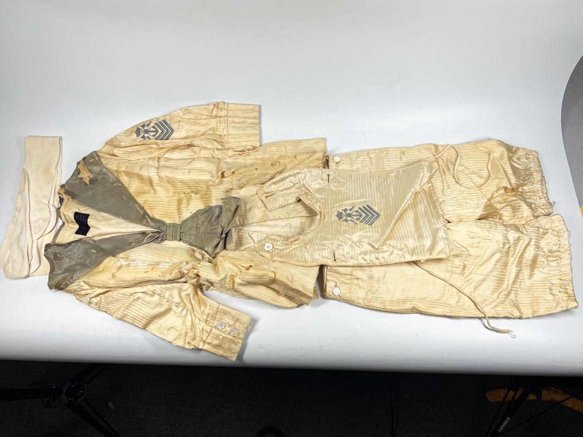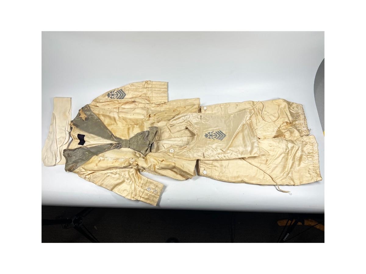 There is antique wear to the entire uniform piece, and there is some brittle parts of the shirt and is crackling. Check pictures for more details and for sizing.