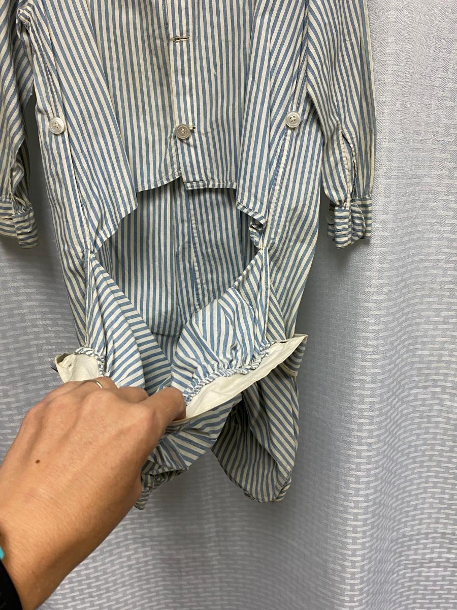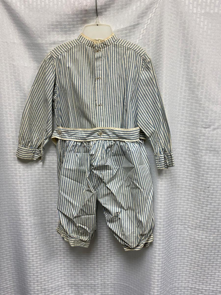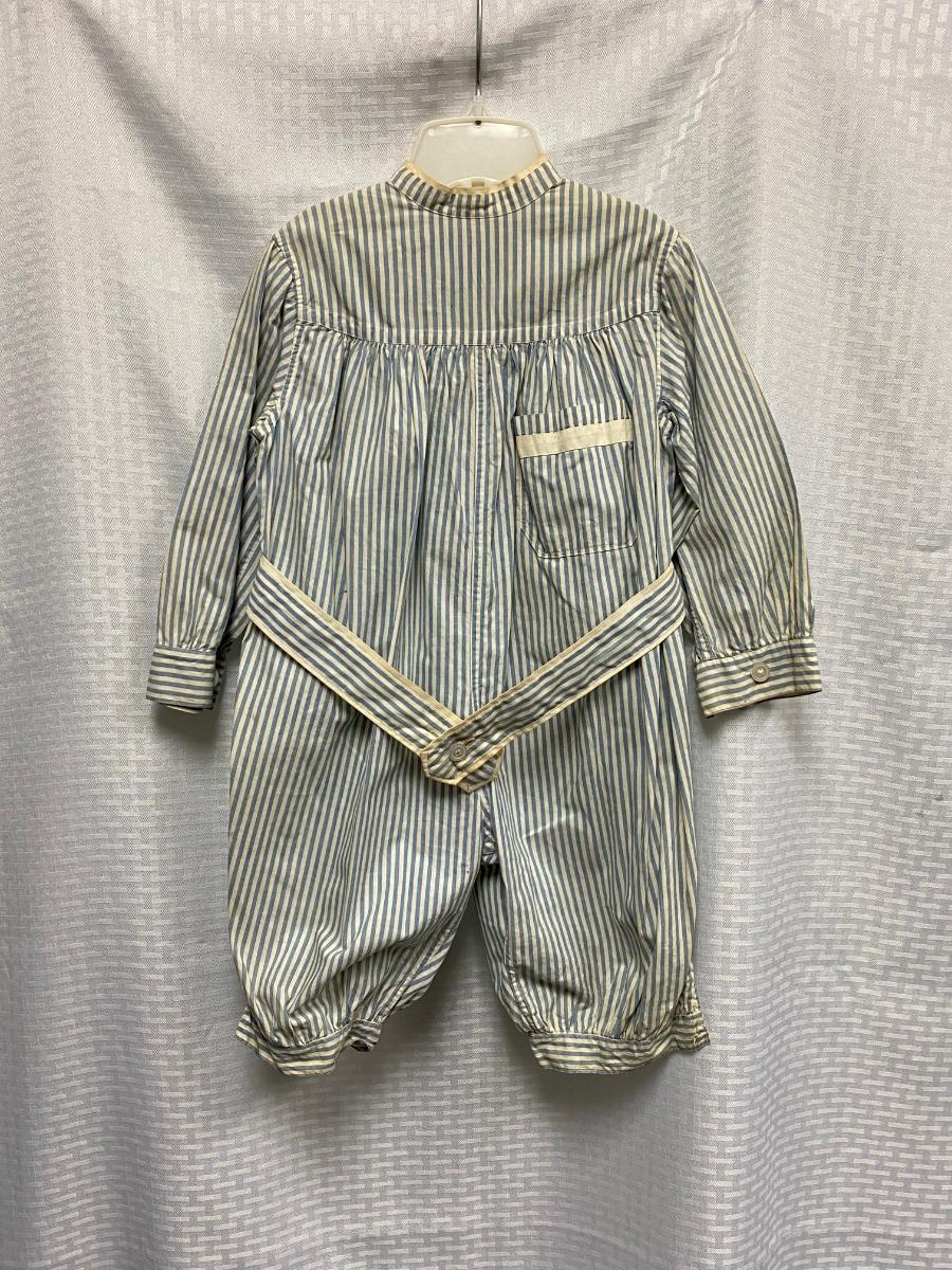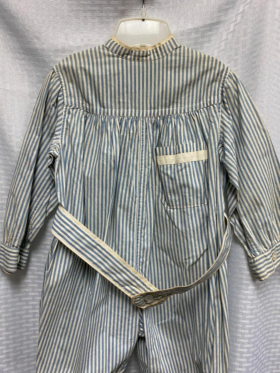Vintage Antique Toddler Blue & White Pin Striped Union Suit Onesie with Back Flap. In vintage condition, a lot of discolor but no holes. Buttons in the back and has a belted flap for diaper changing or using restroom. Toddler or large doll size.