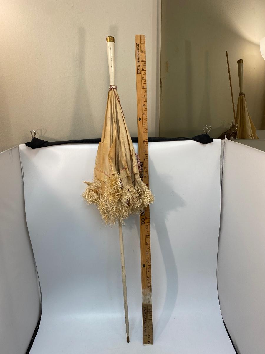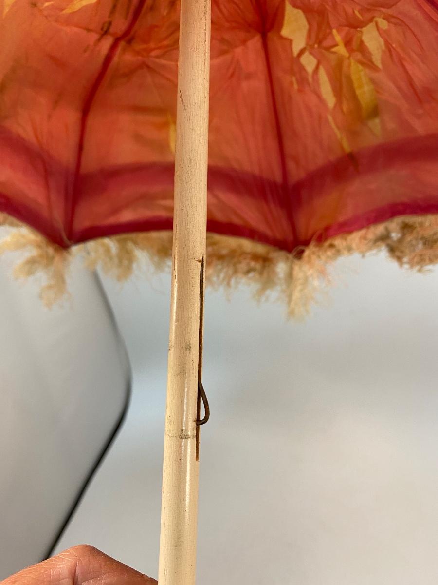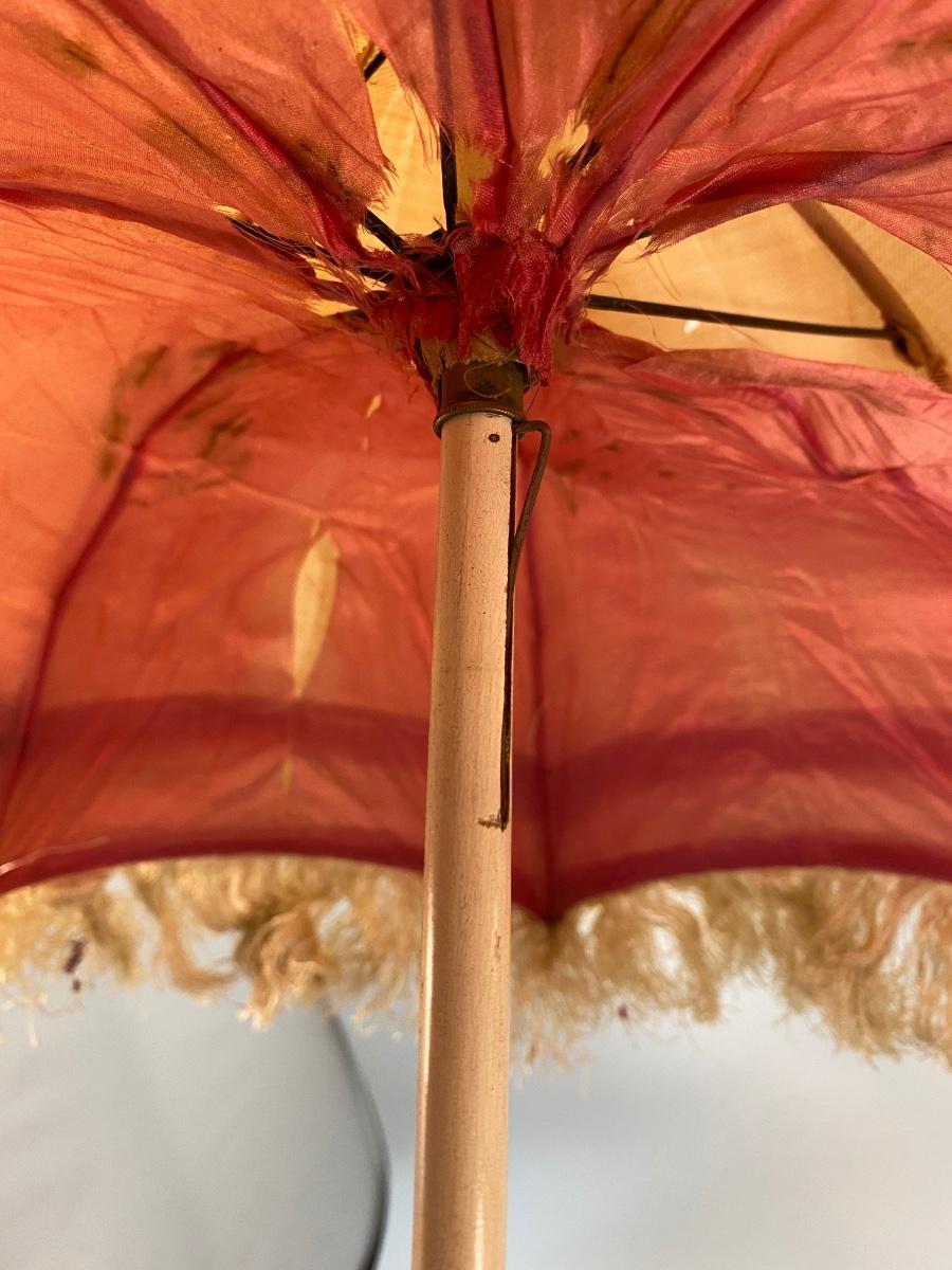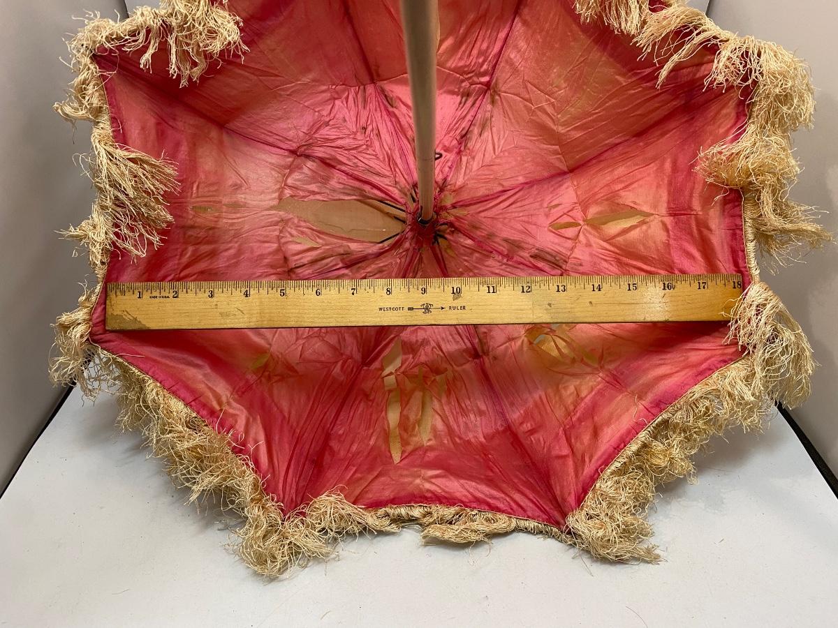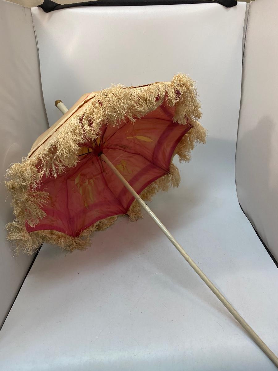 Vintage Antique Fringed Parasol Umbrella White & Pink. Material shows age, has tears and is fragile. Does open and close easily. Smaller parasol with an 18" diameter and about 36" length.