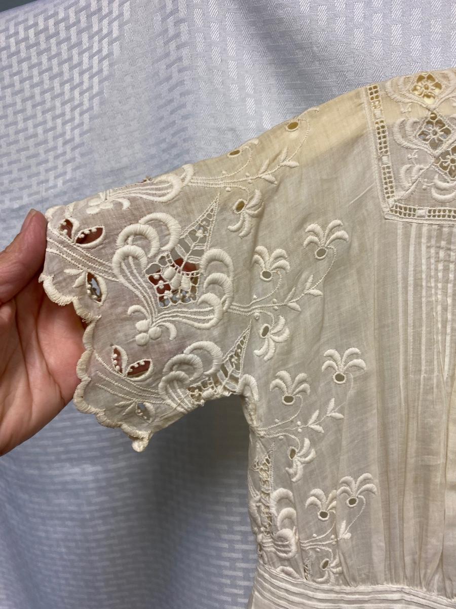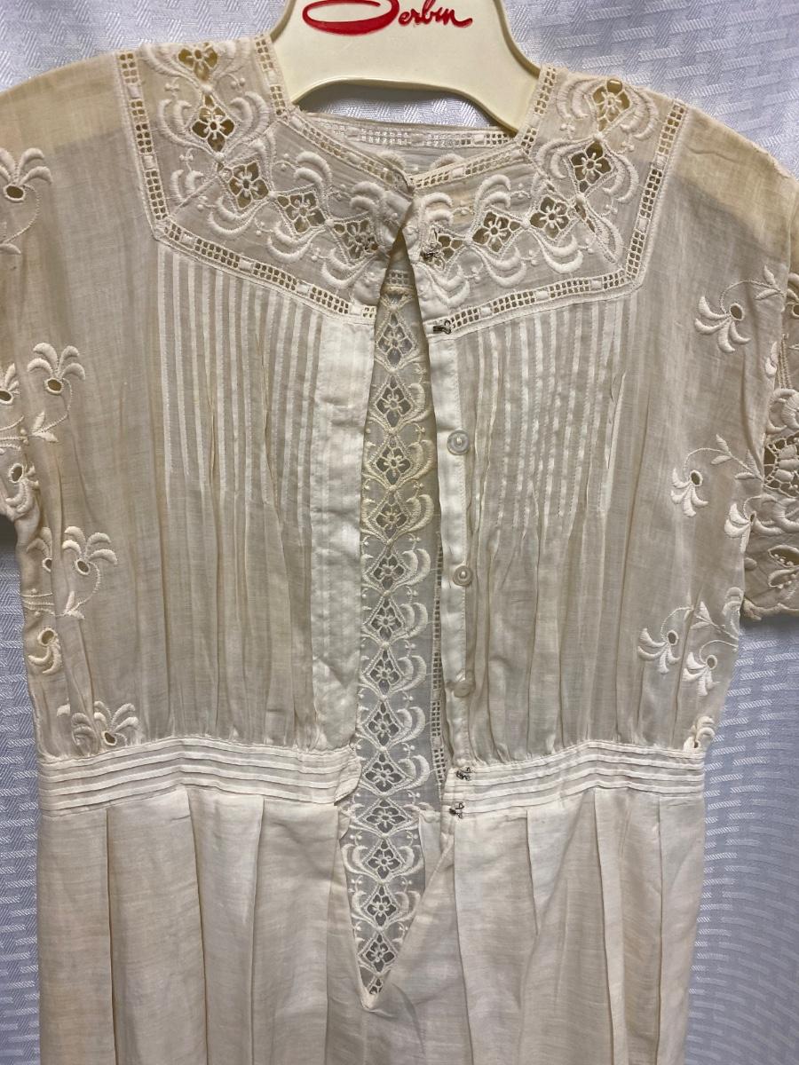 Vintage Antique Victorian Small Child Youth Cotton Sun Tea Dress. Beautifully embroidered details. There is discolor from age but no major spots, stains, or holes. Buttons up the back. In overall good antique condition.