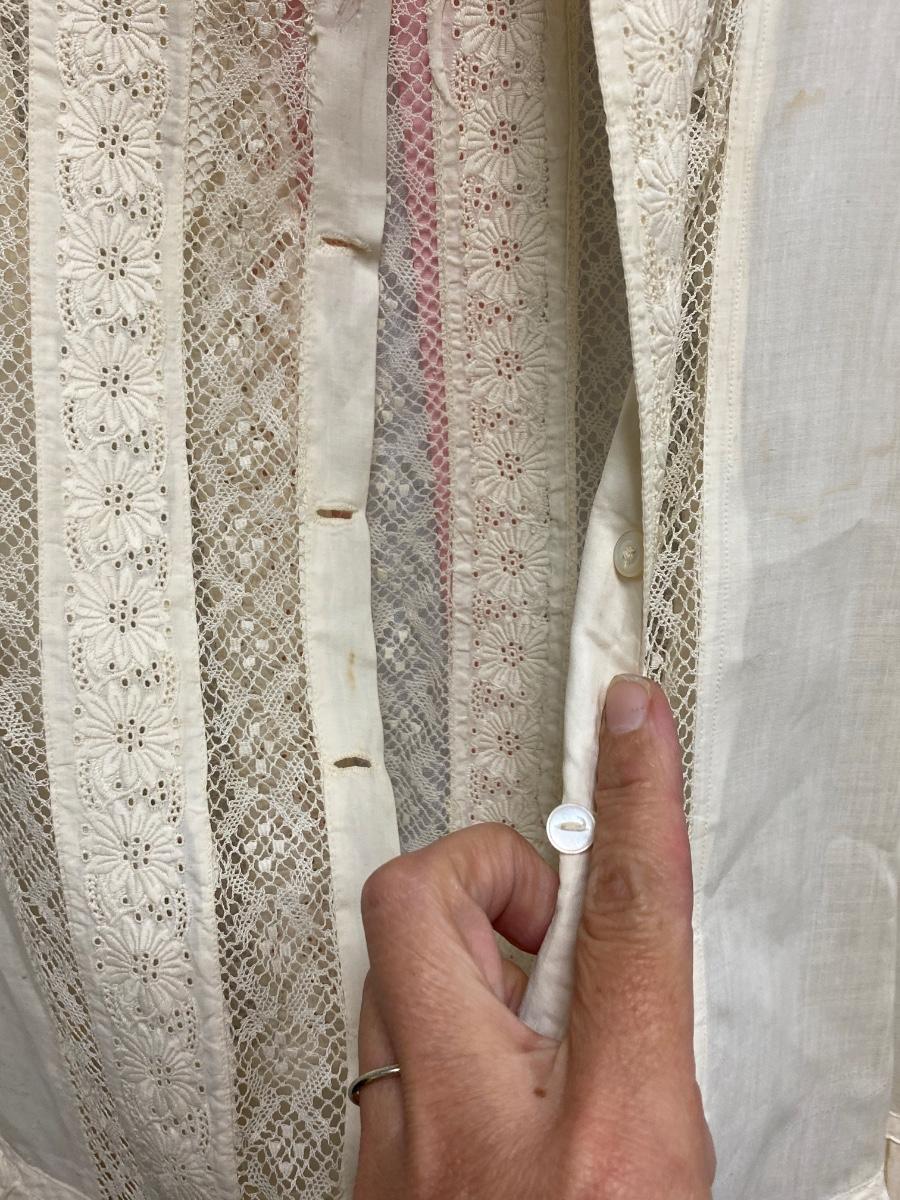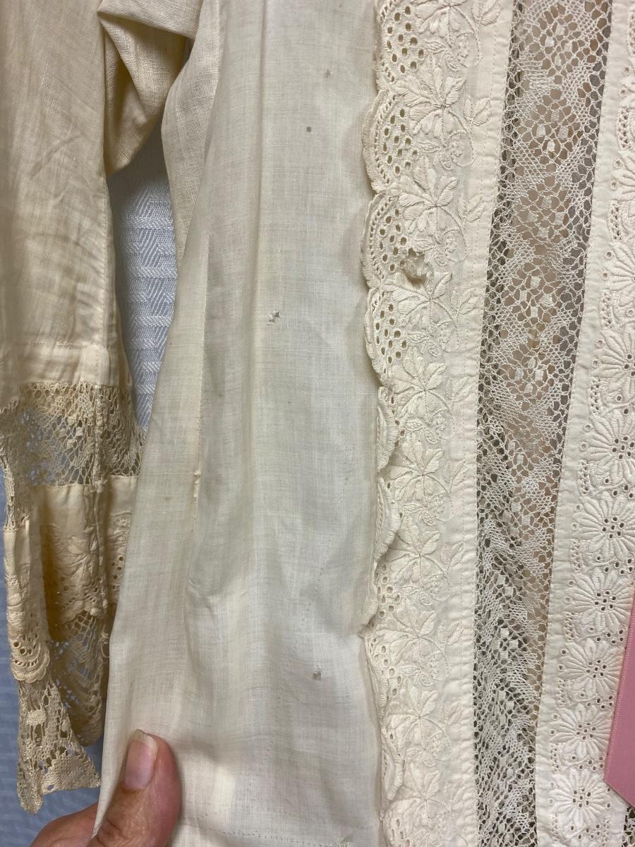 Vintage Antique Victorian Youth White Cotton & Lace Tea Sun Dress. White cotton with tatted lace and eyelet lace. Pink ribbon at the neck. Buttons up the back, offset to follow lace pattern. There is discolor and a couple small holes from age, no major issues. Young child/small youth size.