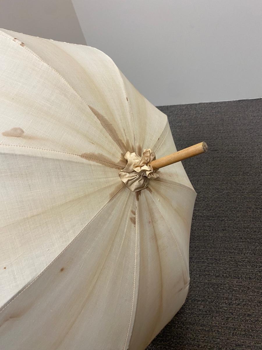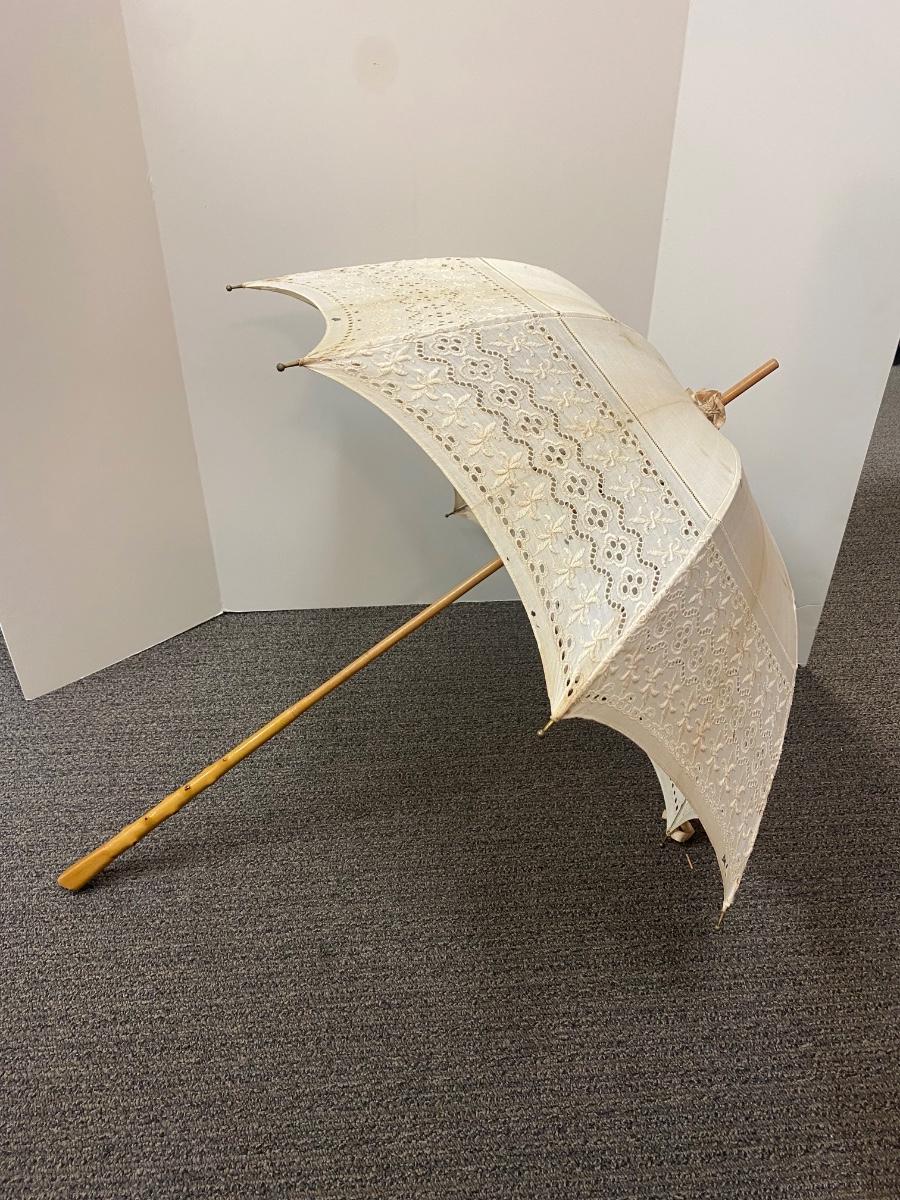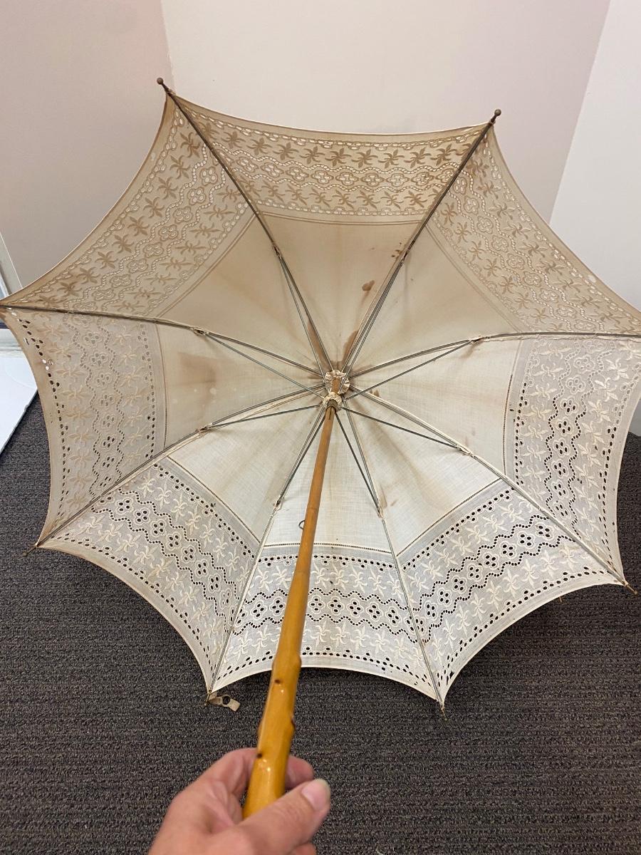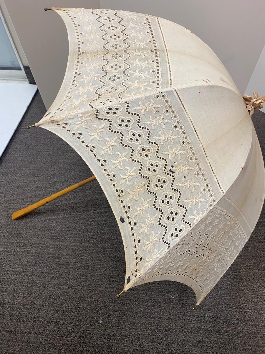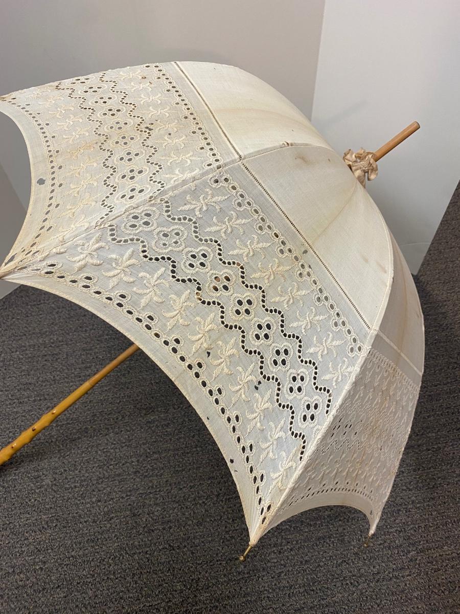 Vintage Antique White Cotton Embroidered Eyelet Parasol Umbrella. In good vintage condition. There is discolor from age and some small holes. Opens and closes nicely but there is a little tension from fabric, open slowly or it may rip. Natural wood style handle.