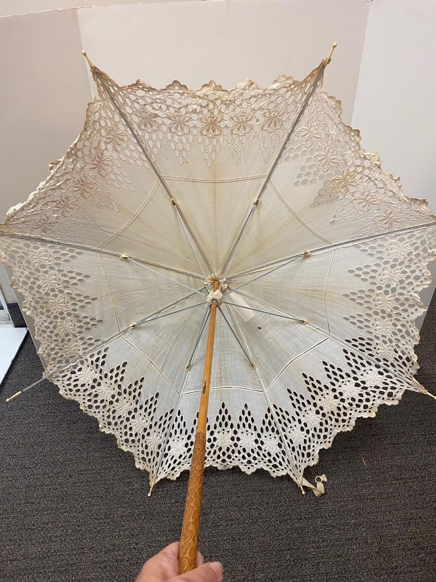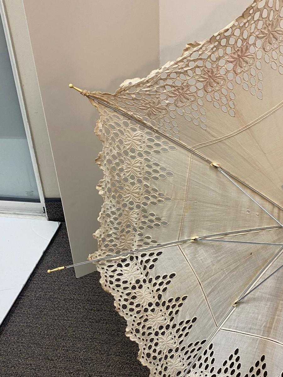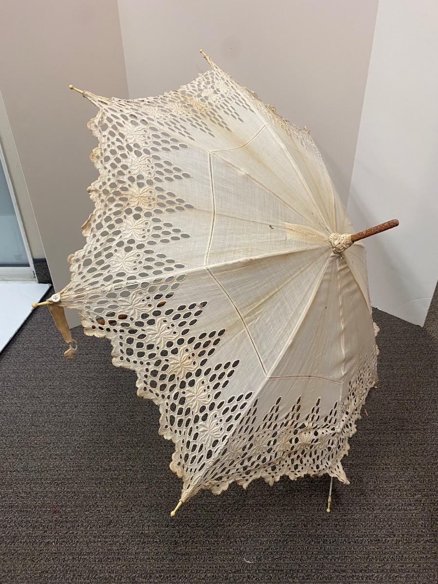 Vintage Antique White Cotton Eyelet Edge Parasol Umbrella. Cotton is discolored from age and has pulled from a couple of the umbrella frame ends. A few small holes. Opens and closes with ease but you can feel the stretch to fabric when opening. Nice carved handle.