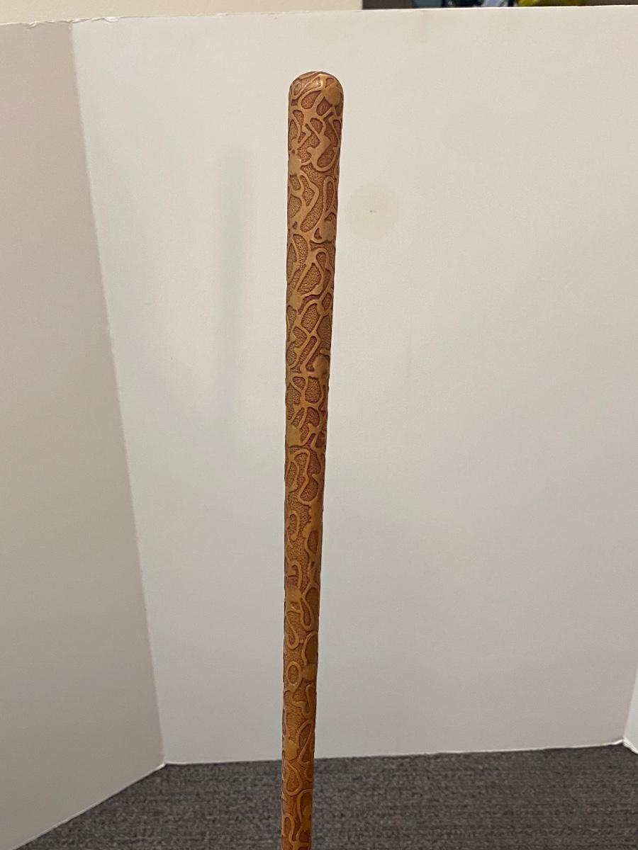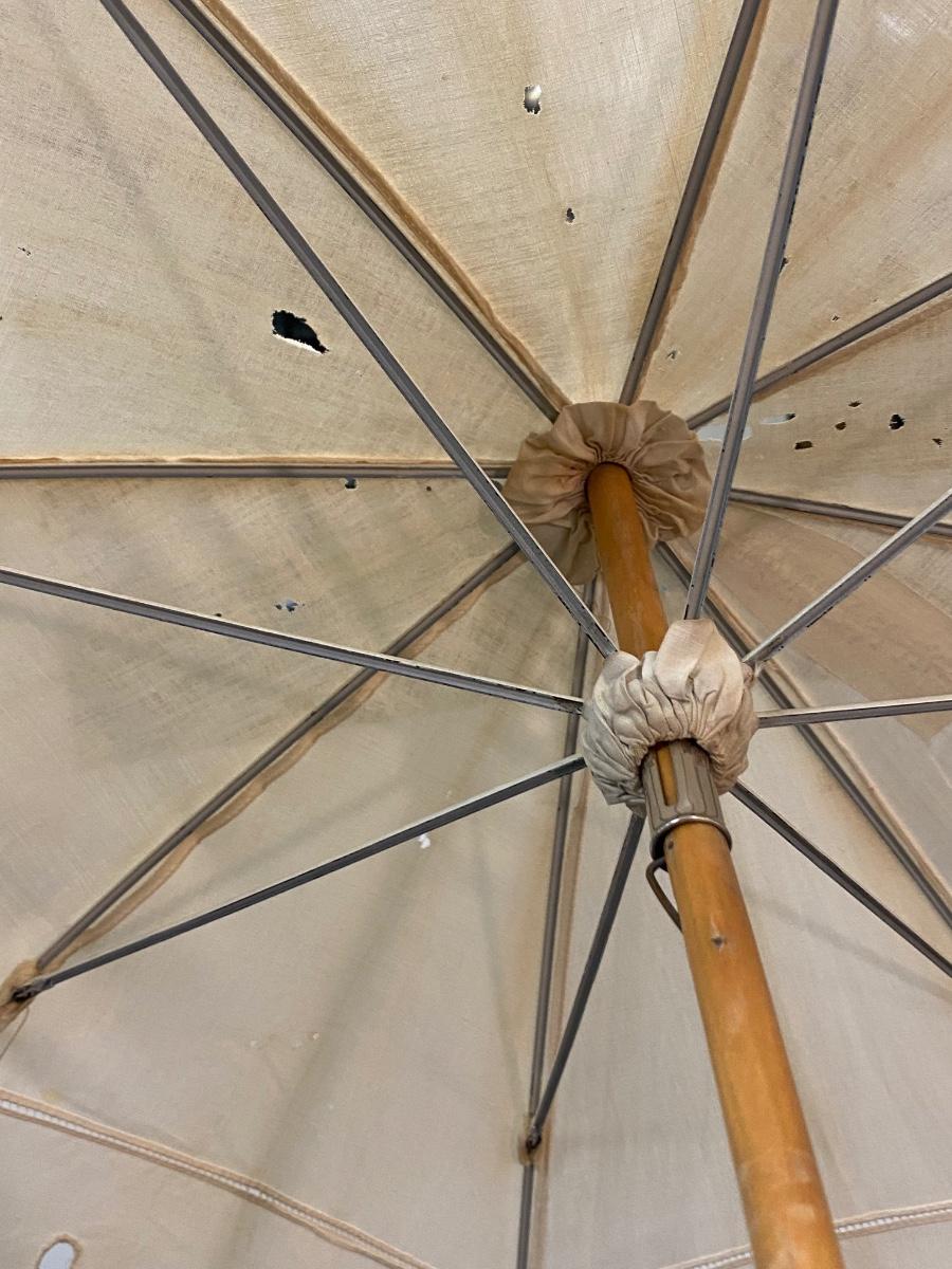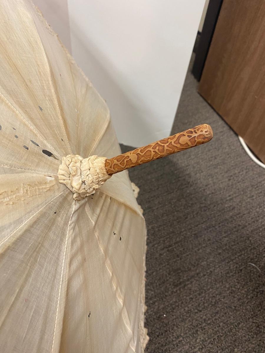 Vintage Antique White Cotton Eyelet Edge Parasol Umbrella. Cotton is discolored from age and has pulled from a couple of the umbrella frame ends. A few small holes. Opens and closes with ease but you can feel the stretch to fabric when opening. Nice carved handle.