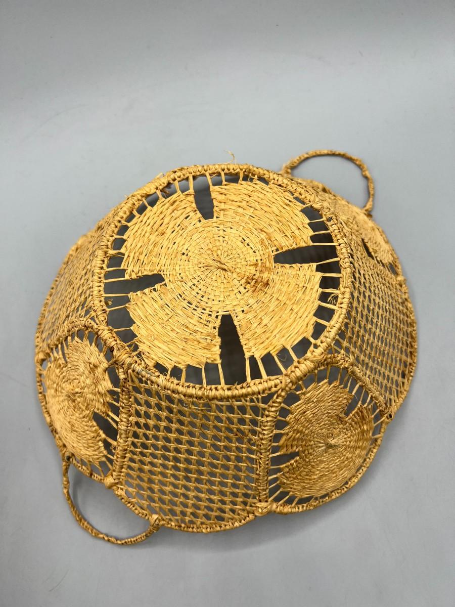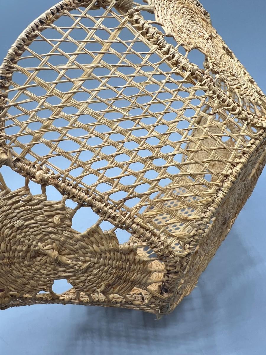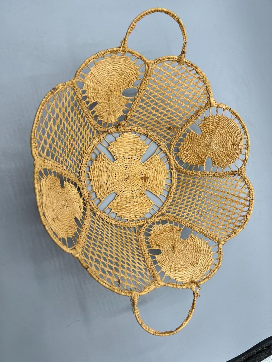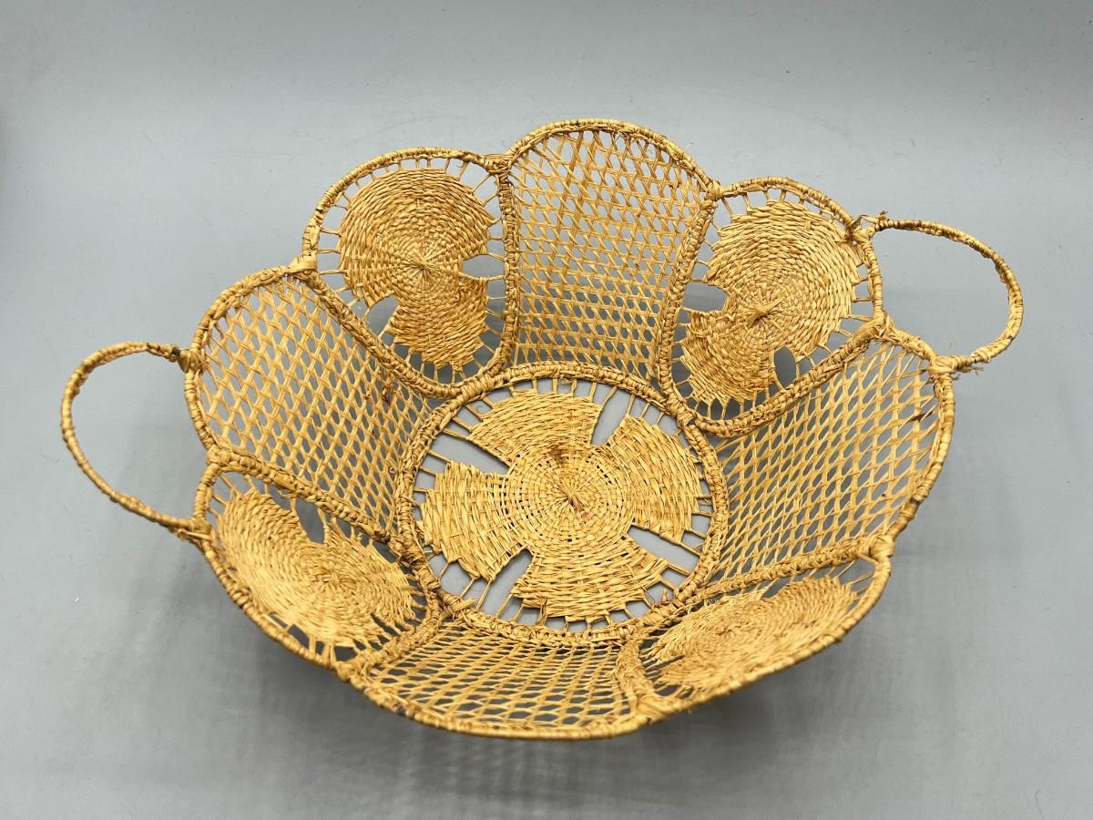 Vintage Antique Woven Rattan Straw on Wire Basket with Handles. Dainty lace like design. In good antique condition. About 10" size.