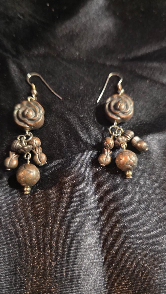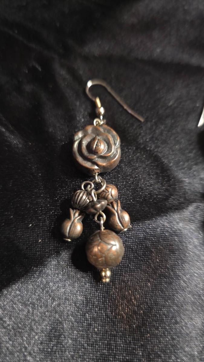 There’s something undeniably enchanting about jewelry that carries the warmth of age—metal softened by time, details mellowed into a dusky glow. These vintage earrings capture that feeling perfectly. Each piece begins with a beautifully sculpted rose, its petals curled as if frozen in mid-bloom, cast in an antiqued brass tone that feels both earthy and romantic.