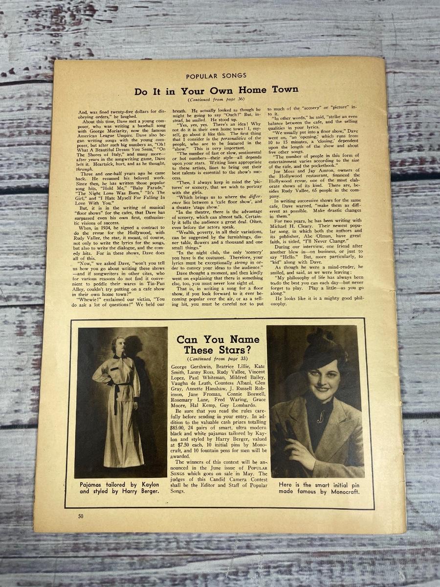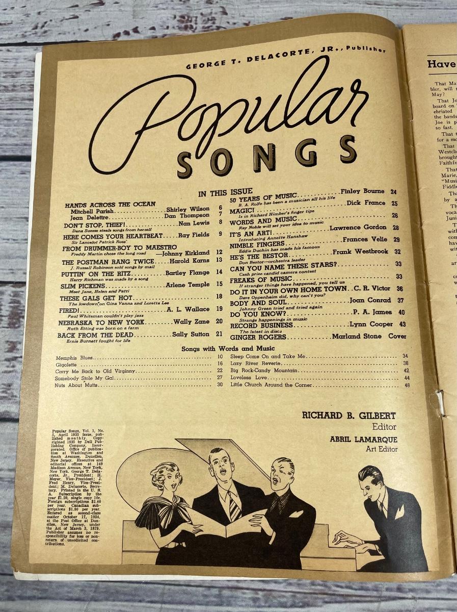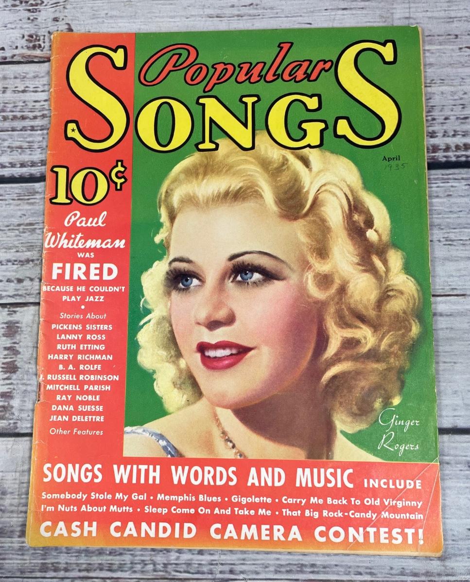 This item is in good condition considering how old it is. The front cover is close to ripping off. This magazine is from April 1935 and contains stories about famous singers and songs with words and music.