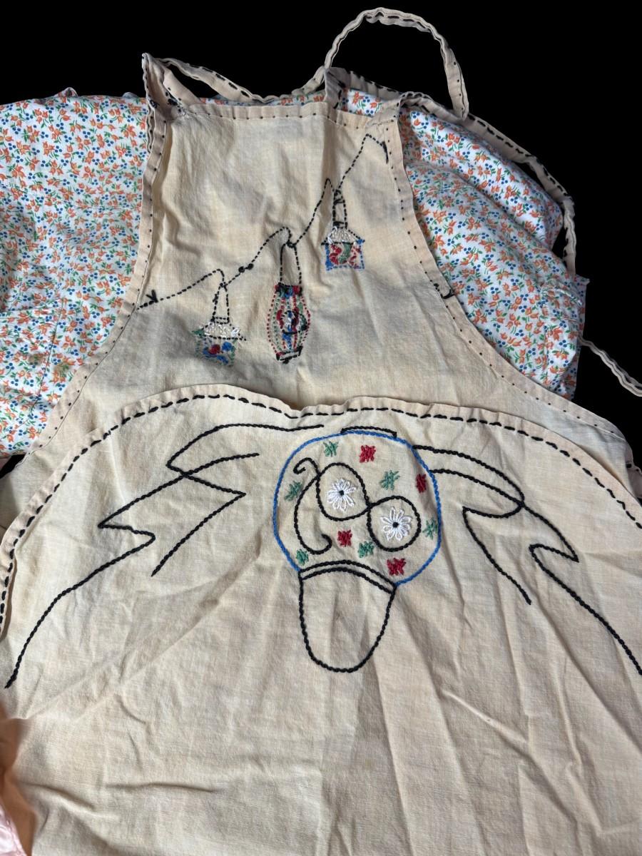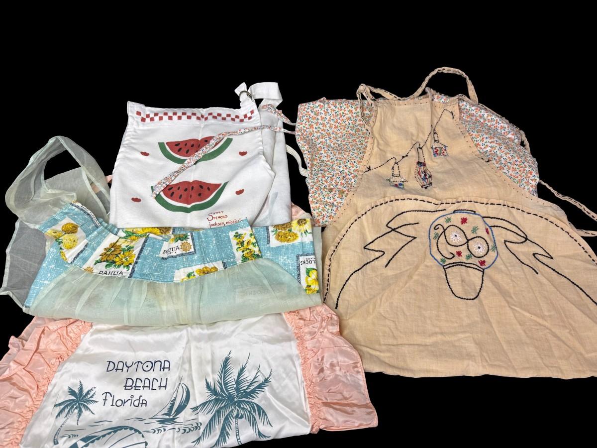 Includes a silk Daytona Beach apron, a floral seed apron, and more. Total of four pieces. There is age related wear, including some stains. [BK]