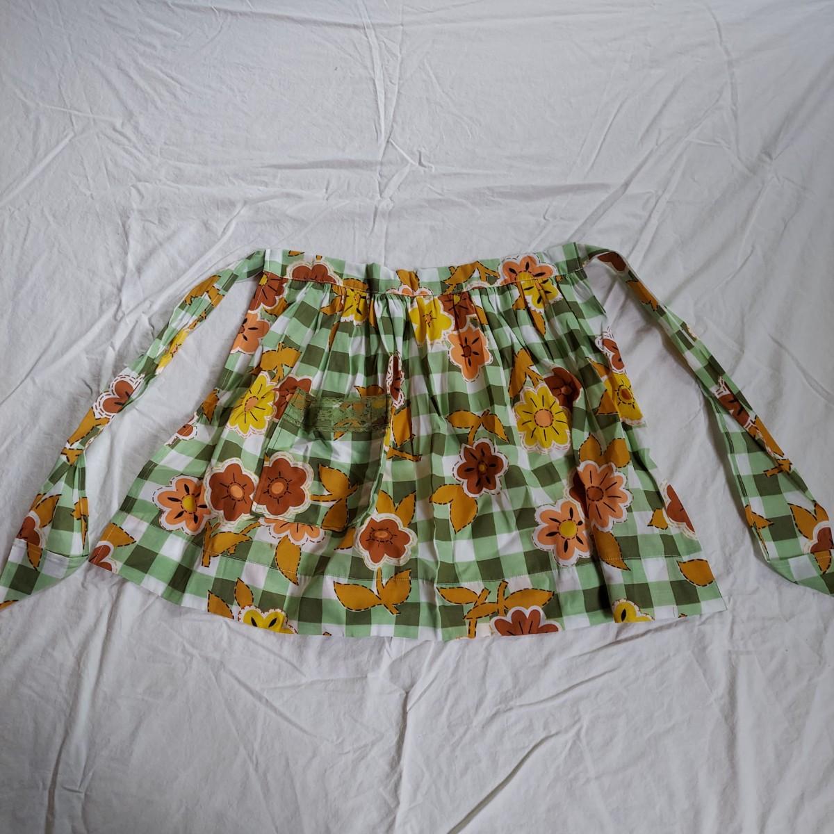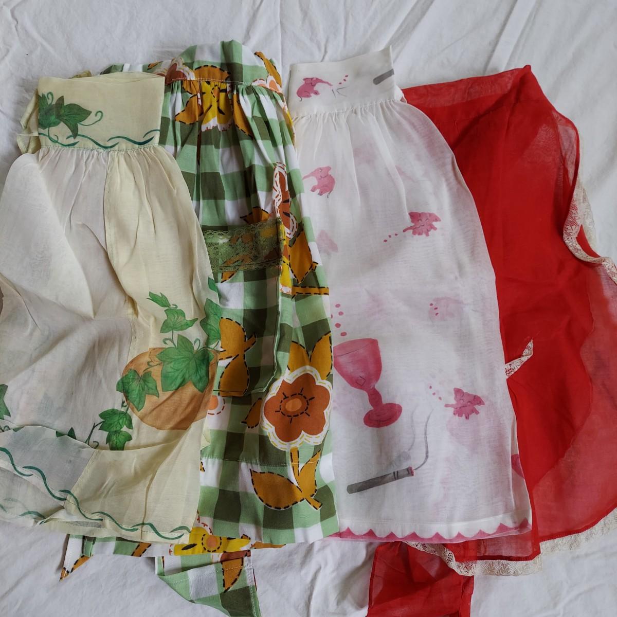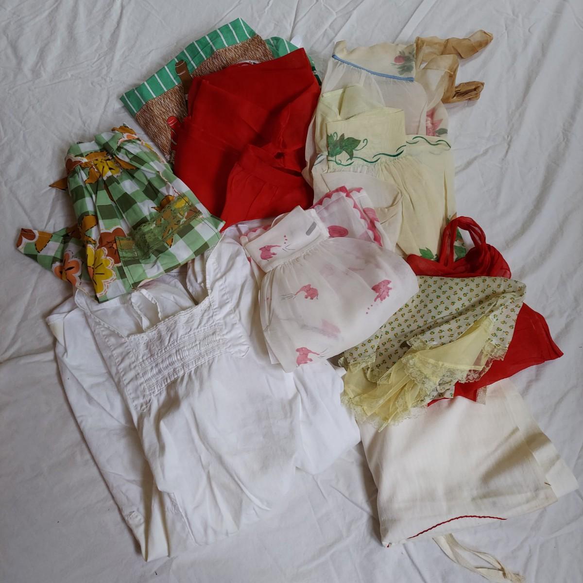 Seven vintage half aprons with a few full aprons. Some stains due to age of items. Shipping available.