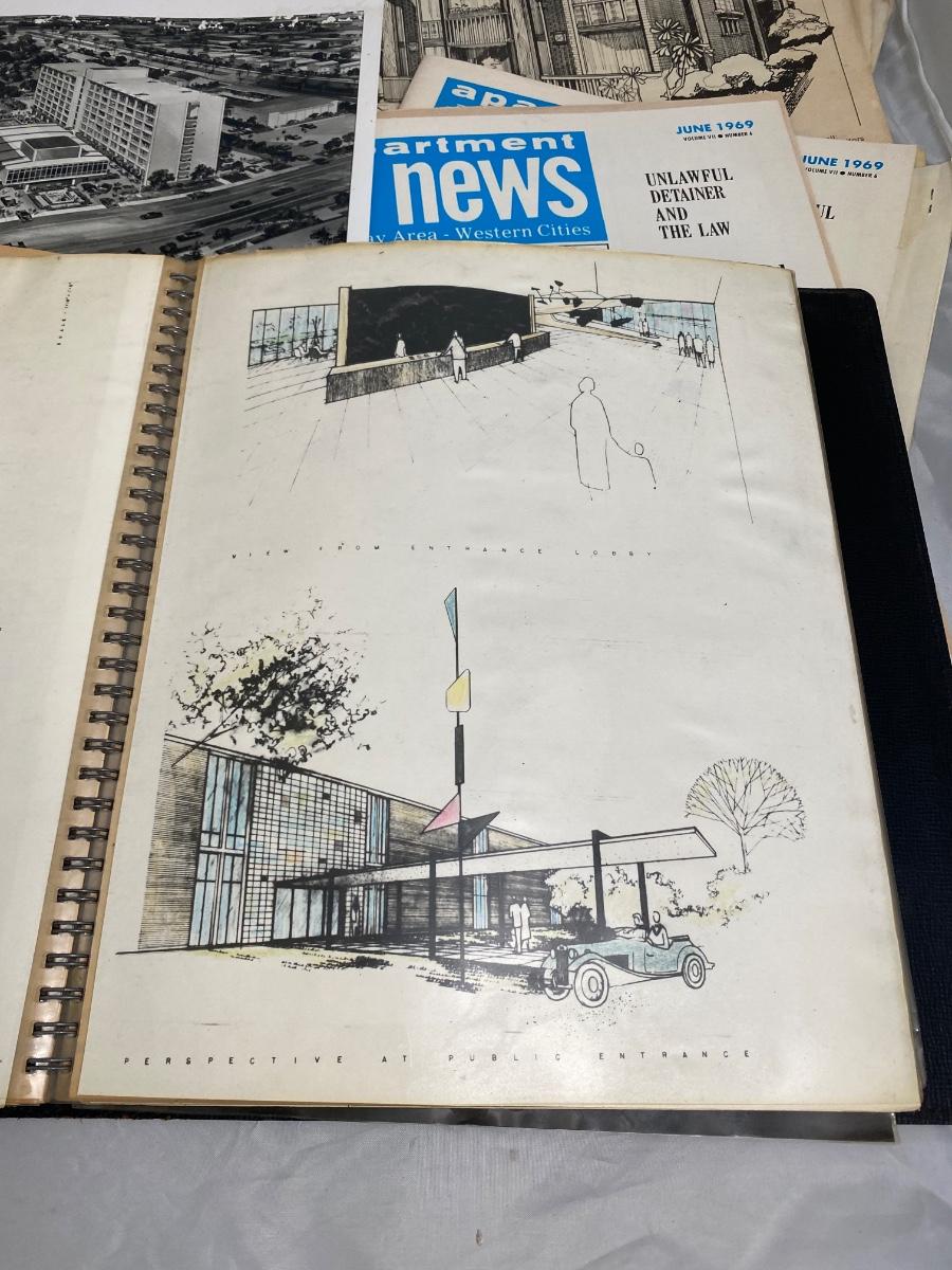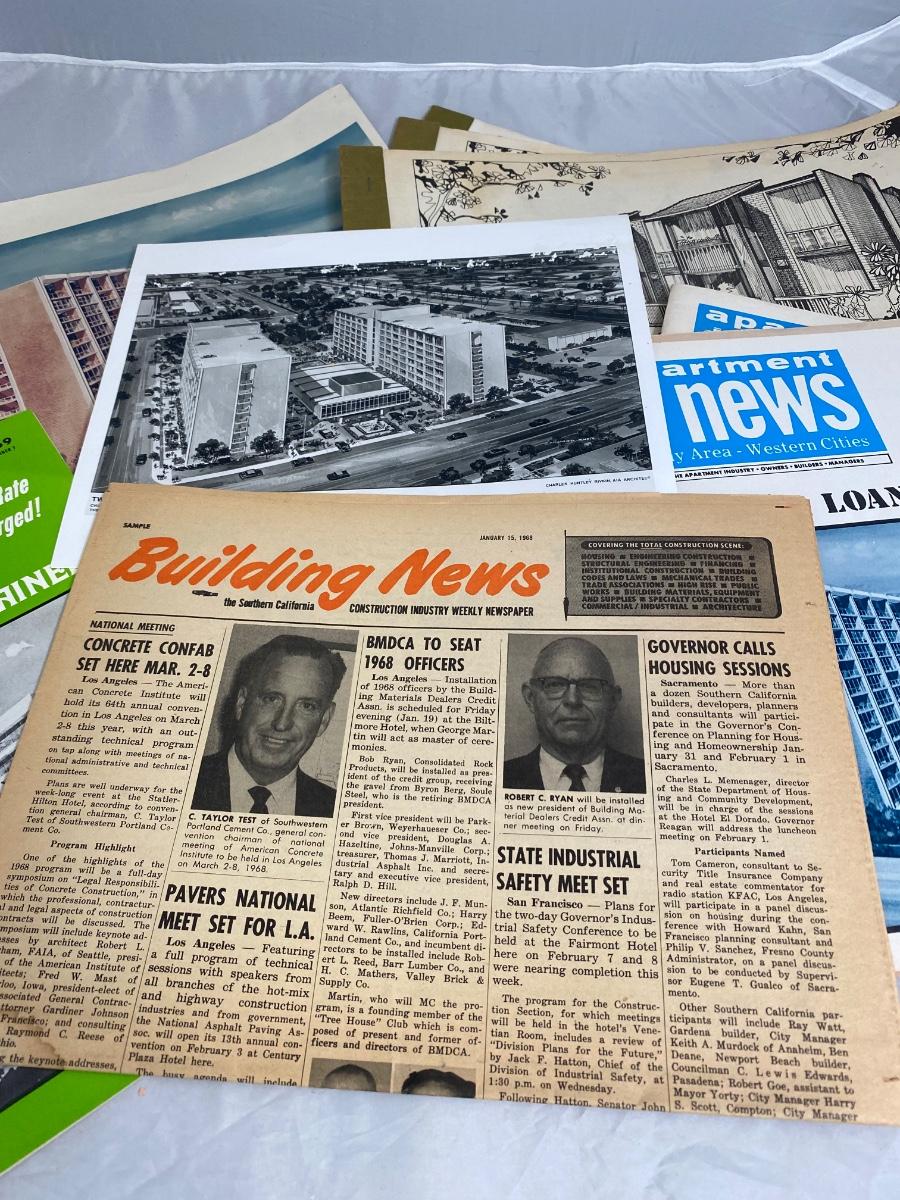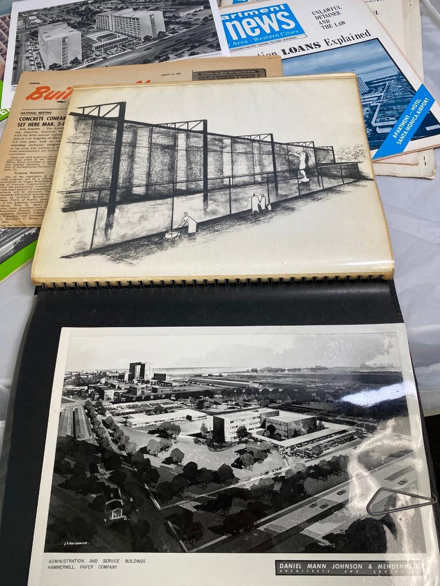 Vintage architecture lot. Includes a couple magazines, photos, building plan booklets, and a college thesis from a future architect. Great midcentury designs.