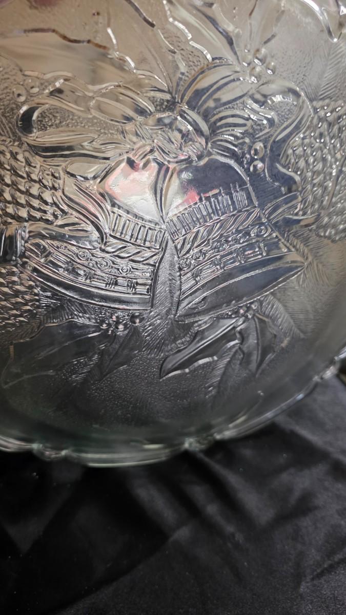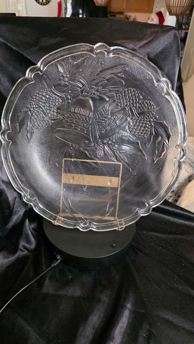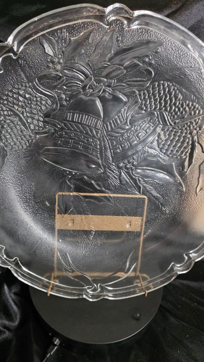 In the soft glow of winter's embrace, where the air carries the faint chime of distant carols, a crystal-clear masterpiece emerges from the shadows of time—a glass platter etched with the symphony of the season. At its heart, twin bells hang in harmonious grace, their forms wrapped in ribbons that flow like silken whispers, flanked by lush holly leaves and clusters of pine cones that evoke the crisp scent of evergreen forests. The scalloped rim, a delicate wave of transparency, frames this tableau, inviting light to dance through its embossed depths, casting subtle shadows that mimic the flicker of candlelight on snow-draped mantles.