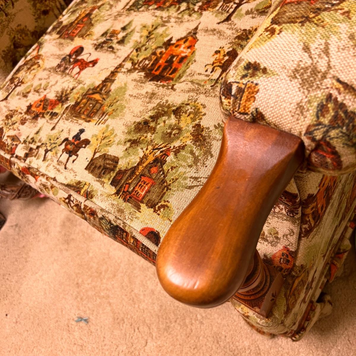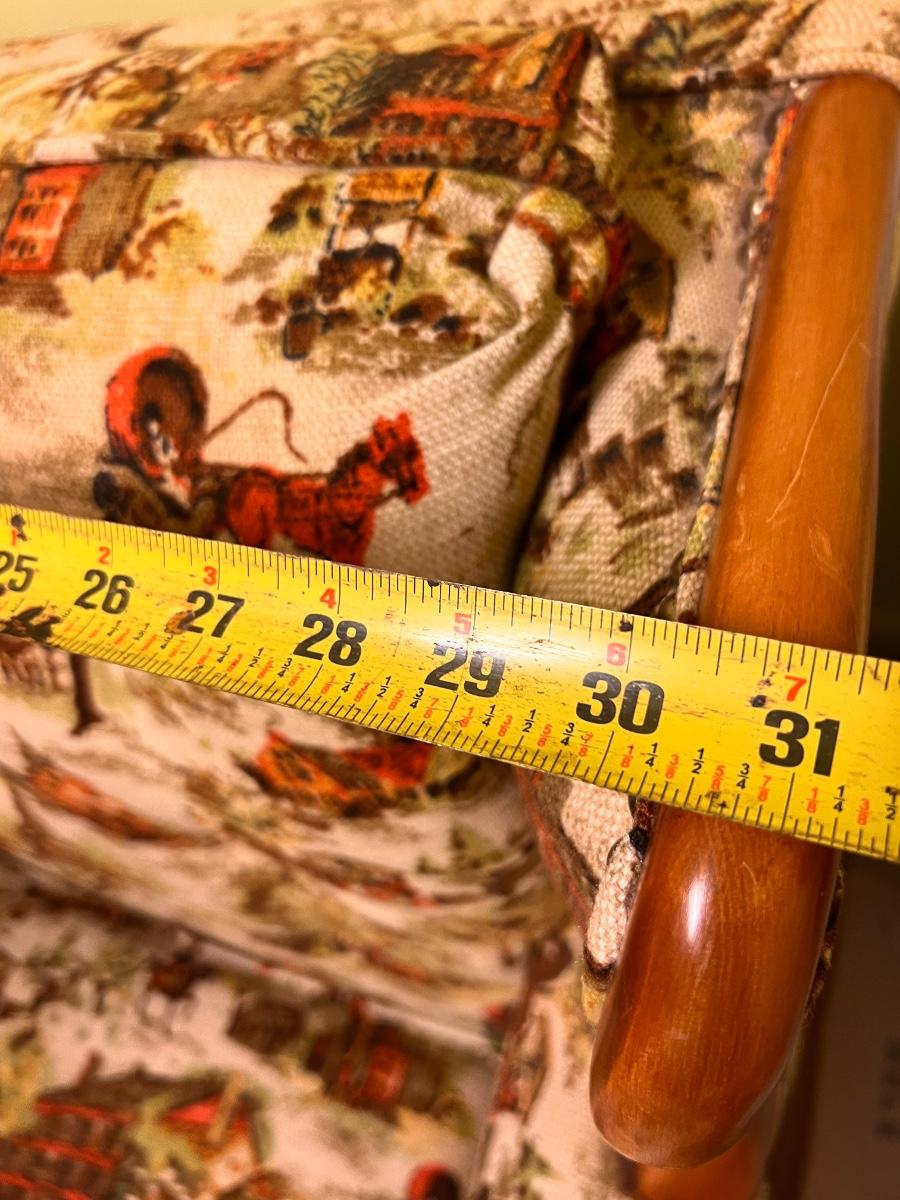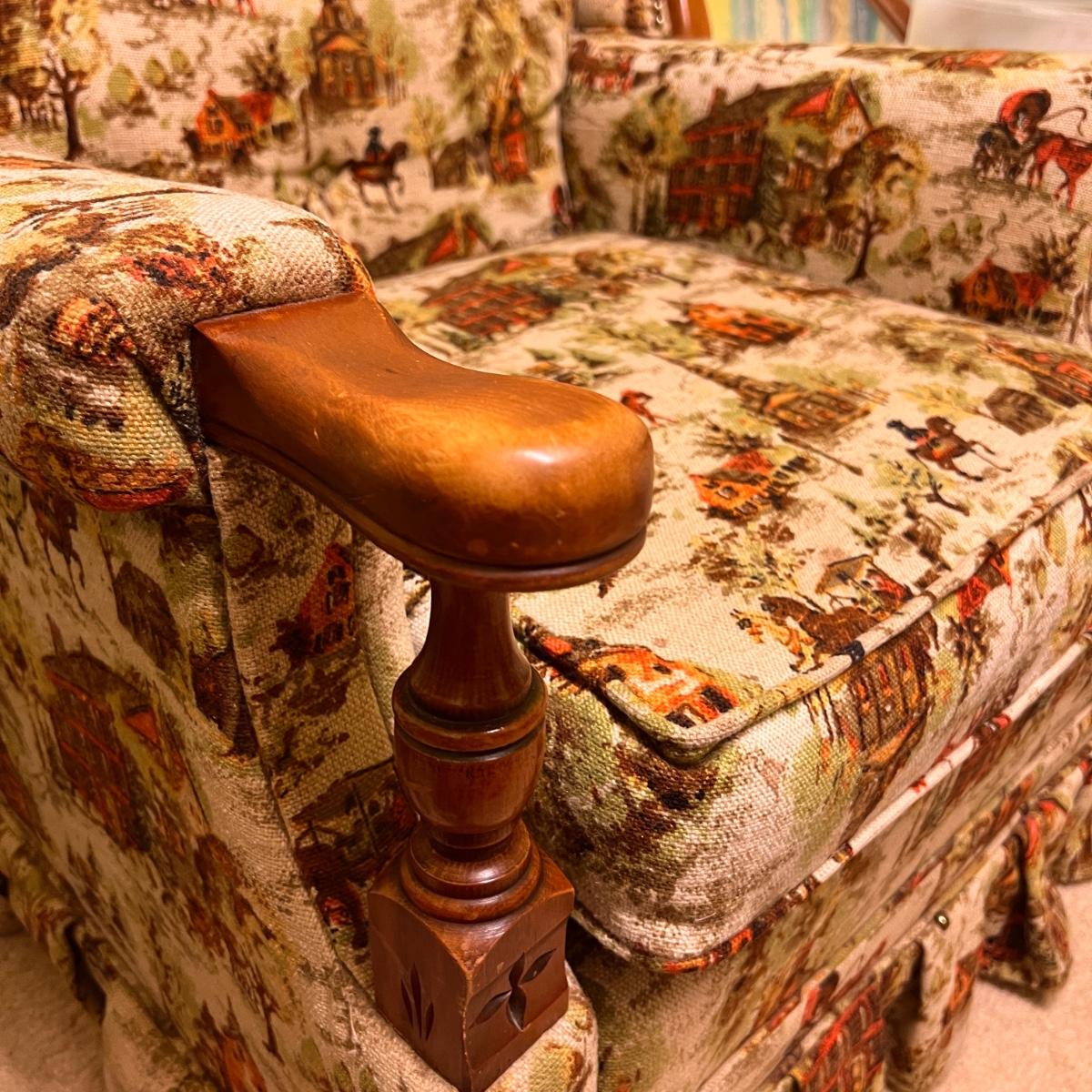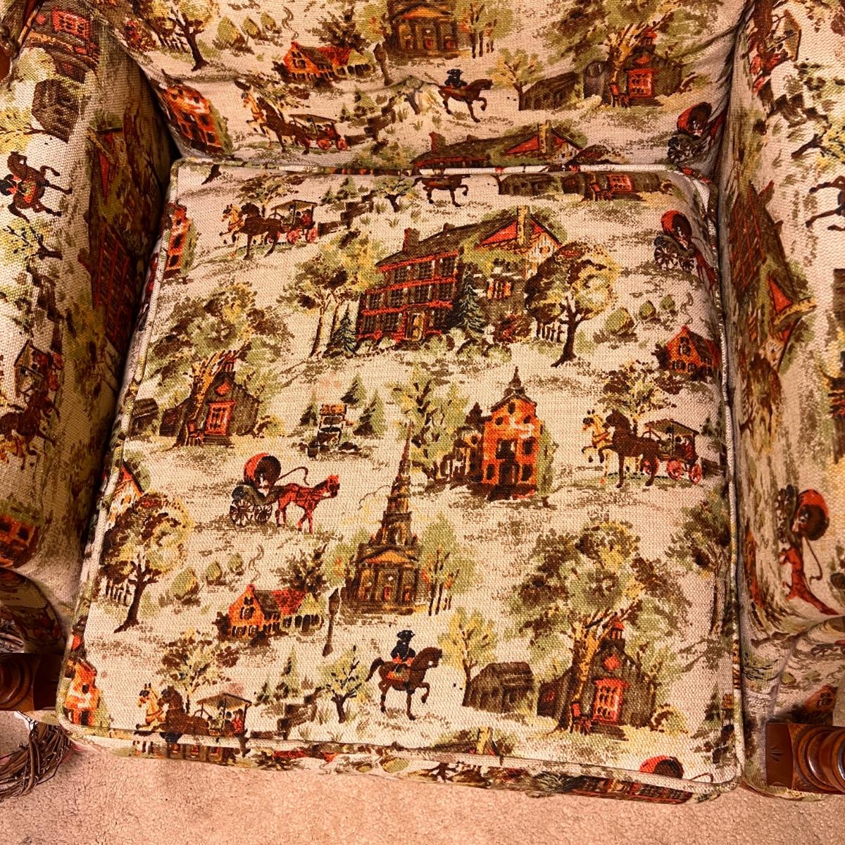 Colonial print. This chair was been covered for years so the fabric is in great condition. Some wear to the wood at the hand rests as shown in pics. Would be perfect for reupholstering. Or keep it just the way it is for a fun vintage decor.