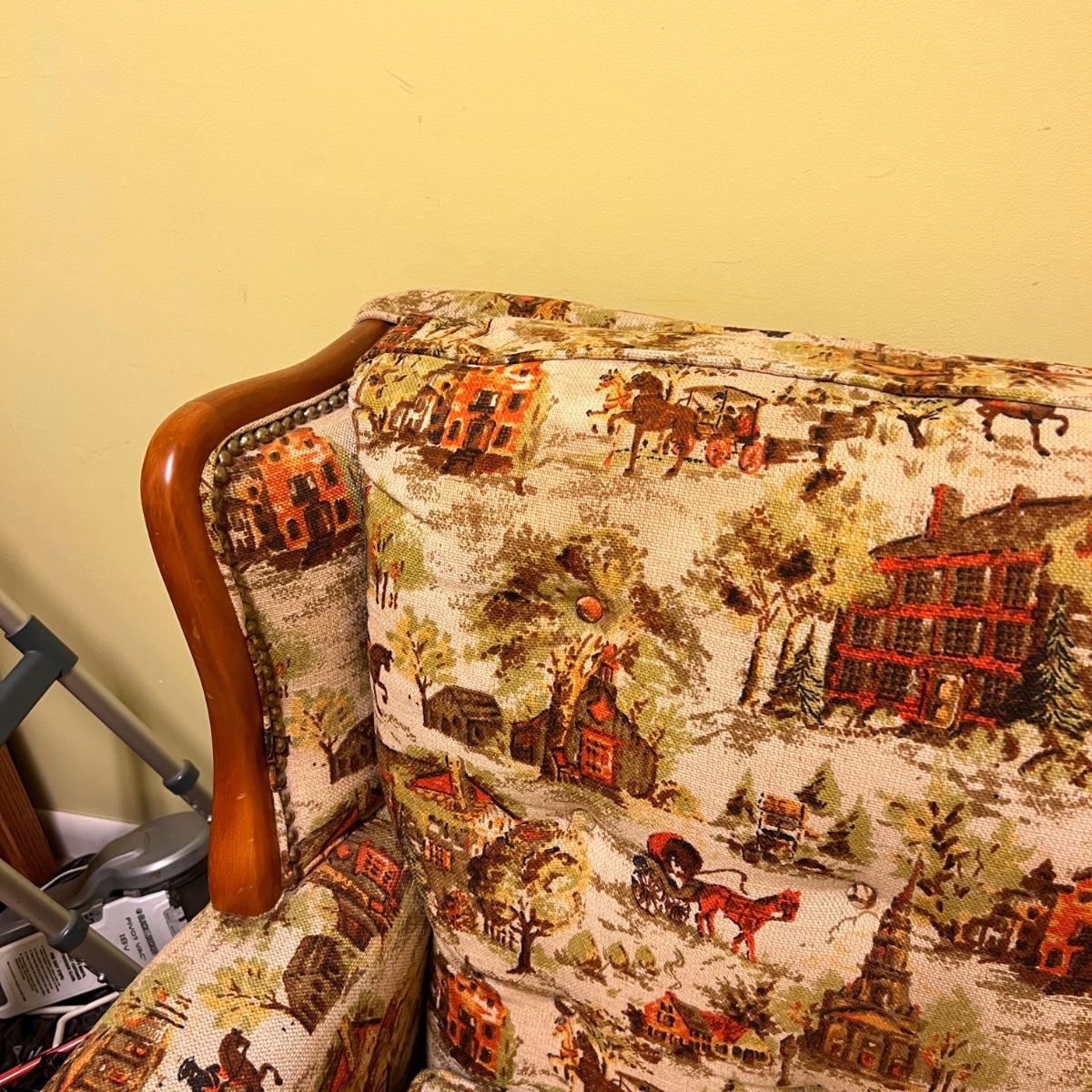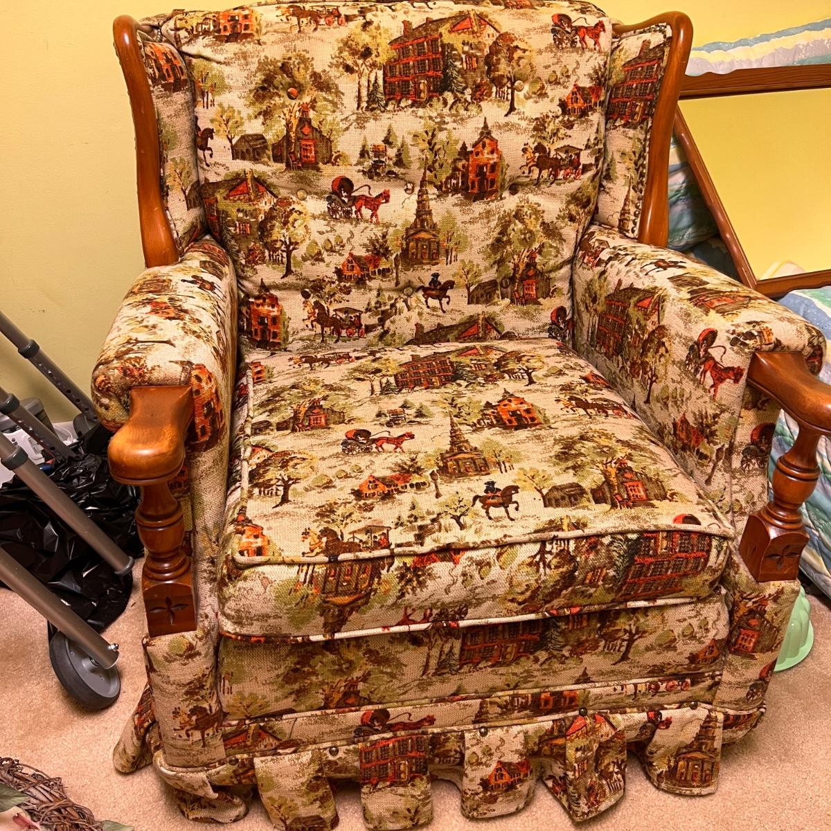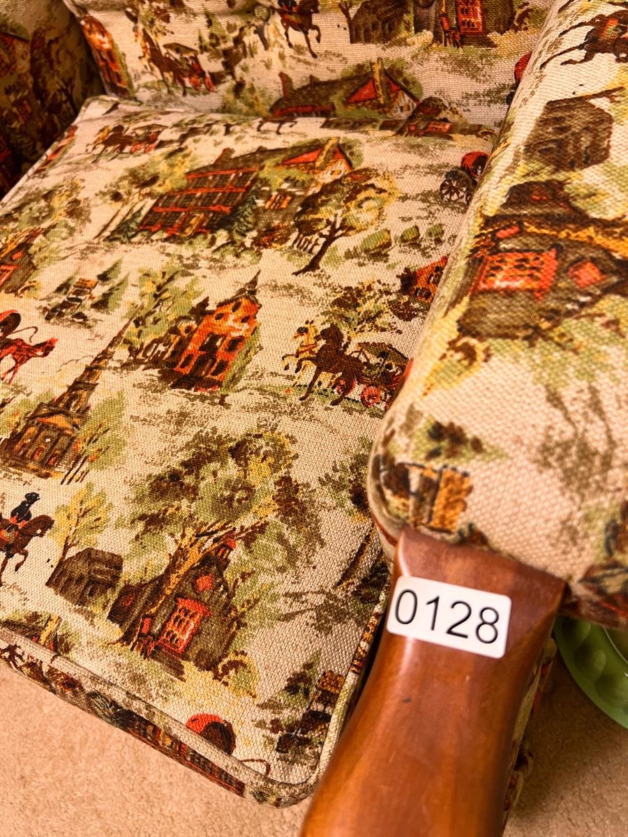 Colonial print. This chair was been covered for years so the fabric is in great condition. Some wear to the wood at the hand rests as shown in pics. Would be perfect for reupholstering. Or keep it just the way it is for a fun vintage decor.