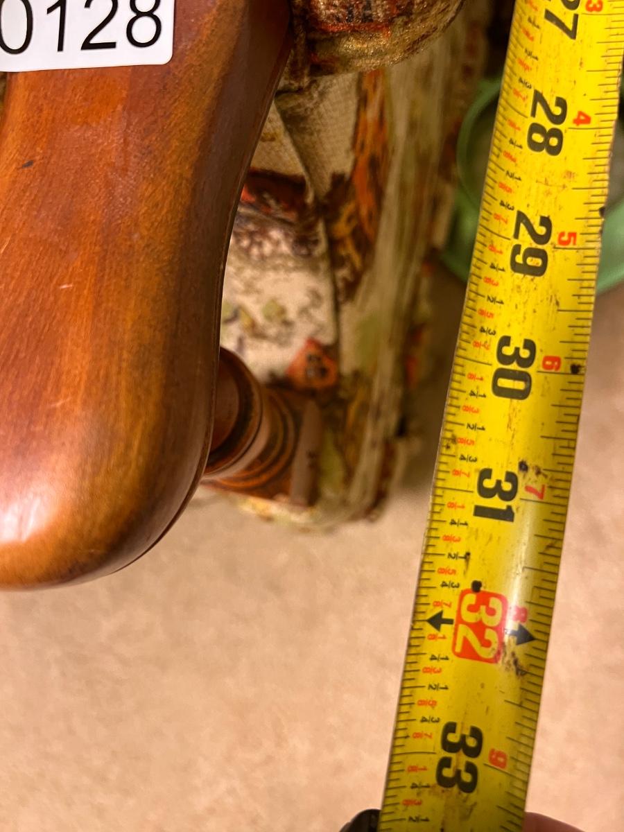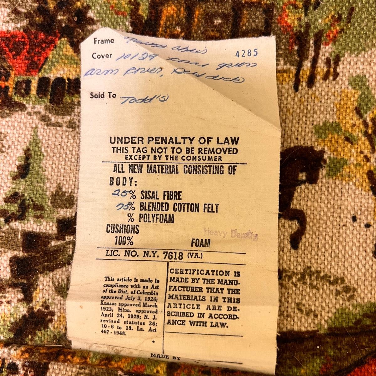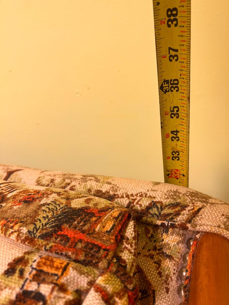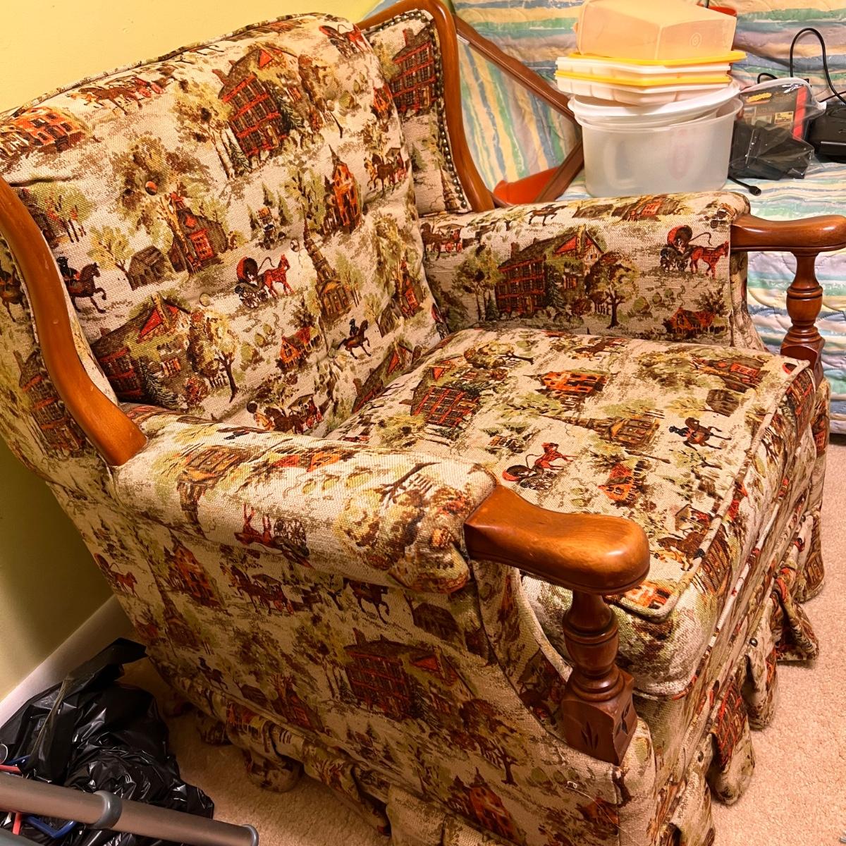 Colonial print. This chair was been covered for years so the fabric is in great condition. Some wear to the wood at the hand rests as shown in pics. Would be perfect for reupholstering. Or keep it just the way it is for a fun vintage decor.