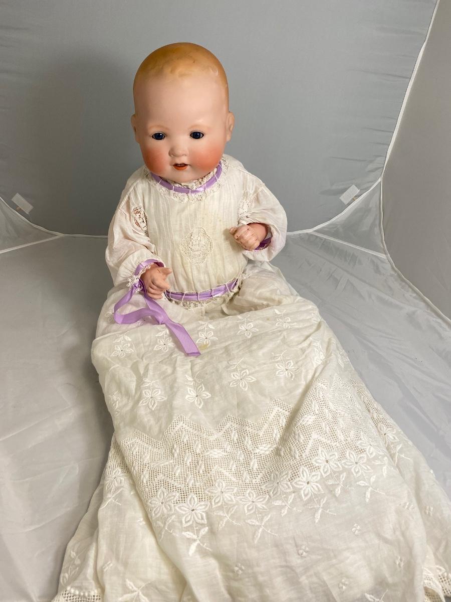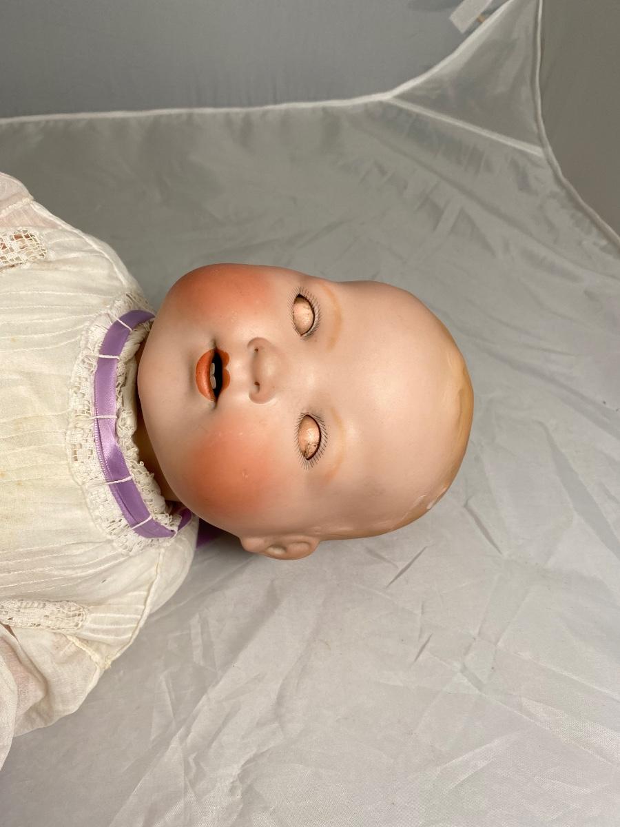 Vintage bisque and composite Armand Marseille sleepy eye baby doll. Bisque head marked AM Germany 351/8 K has sleepy eyes and open mouth with teeth. Composite baby doll body. About 20" size. In vintage condition. Some wear from age to composite and head. Comes in antique gown.