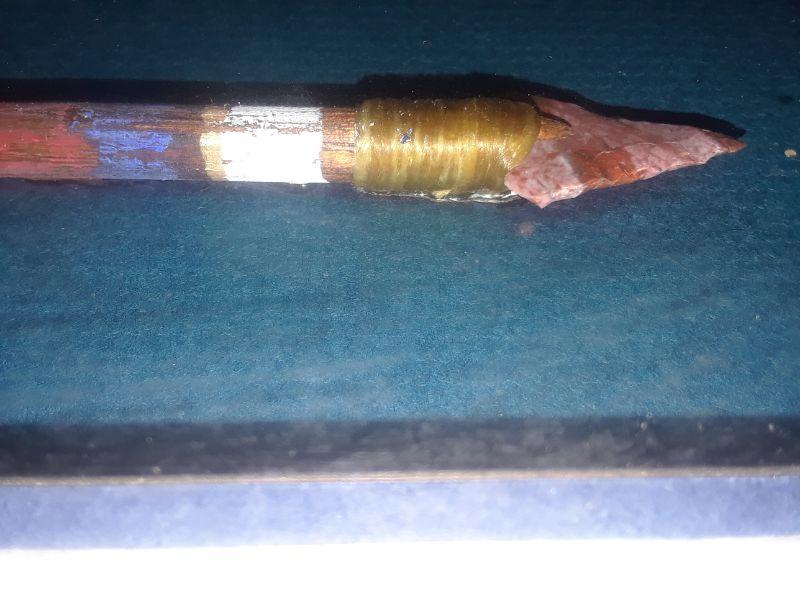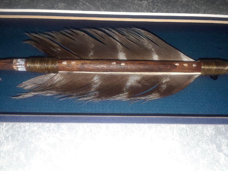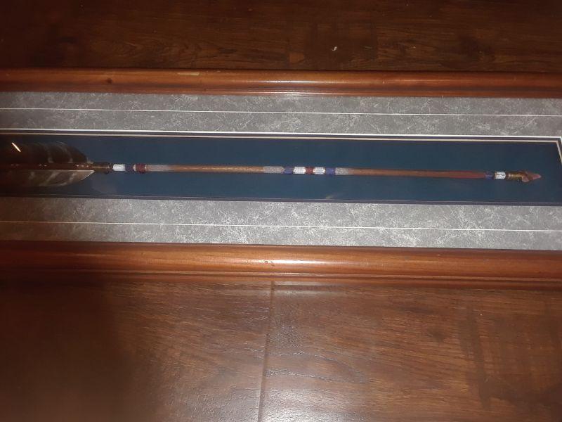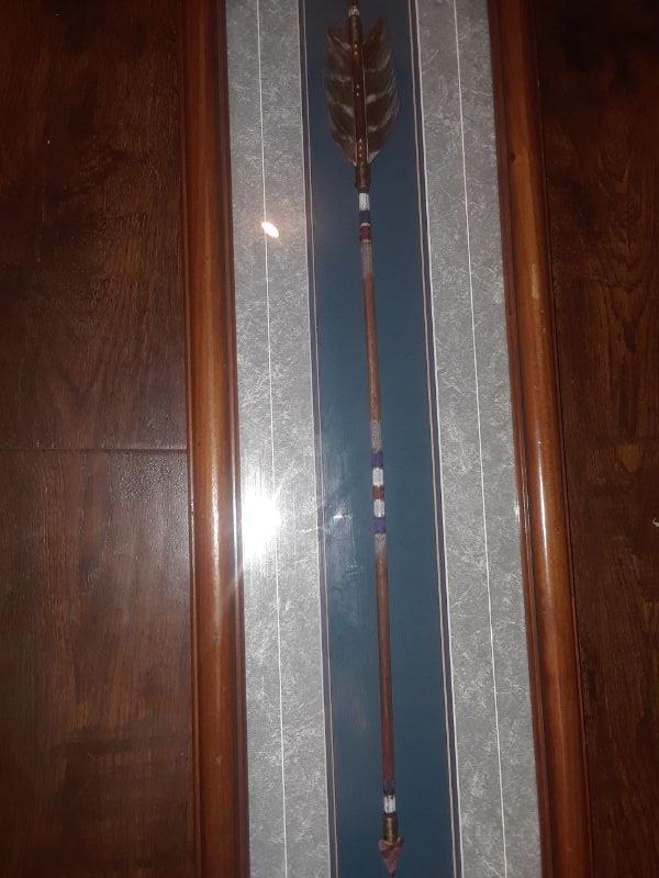 THIS ARROW WAS FOUND IN OKLAHOMA BY FAMILY'S GREAT GRANDFATHER BACK IN EARLY 1900'S AND WAS LATER FRAMED BY THE FAMILY IN 60'S, IT IS BELIEVED TO BE APACHE DUE TO COLORS ON ARROW. VERY NICELY DISPLAYED
