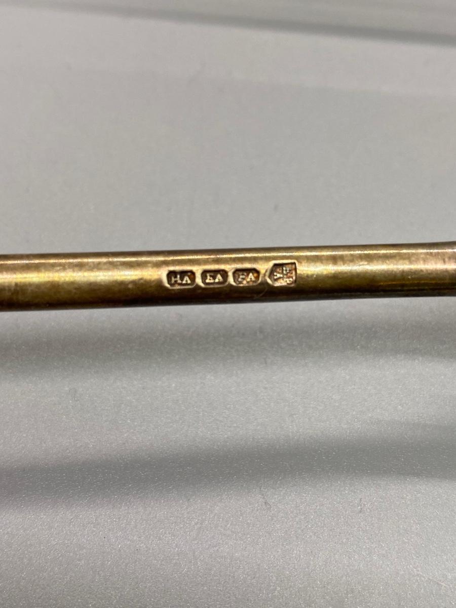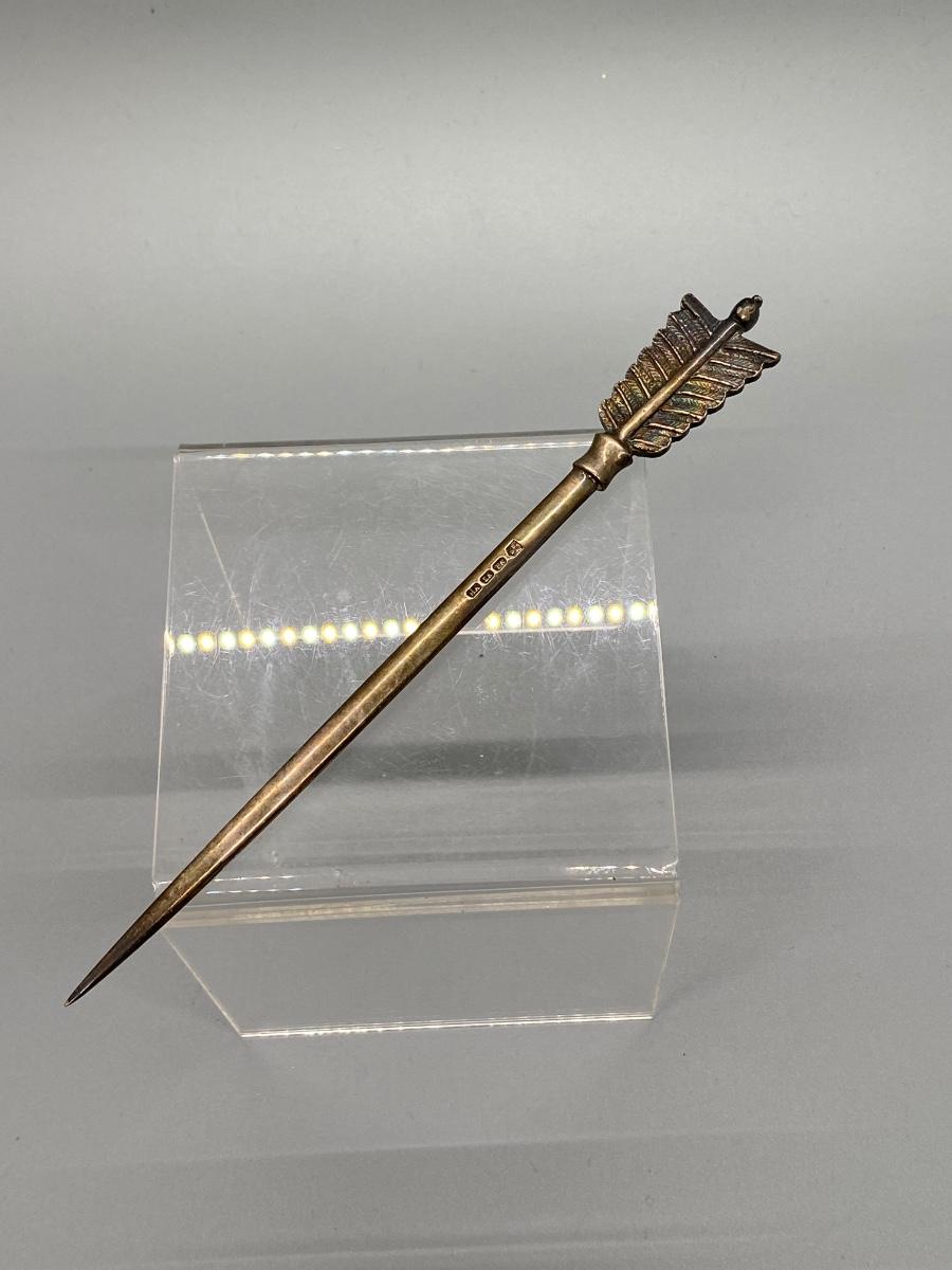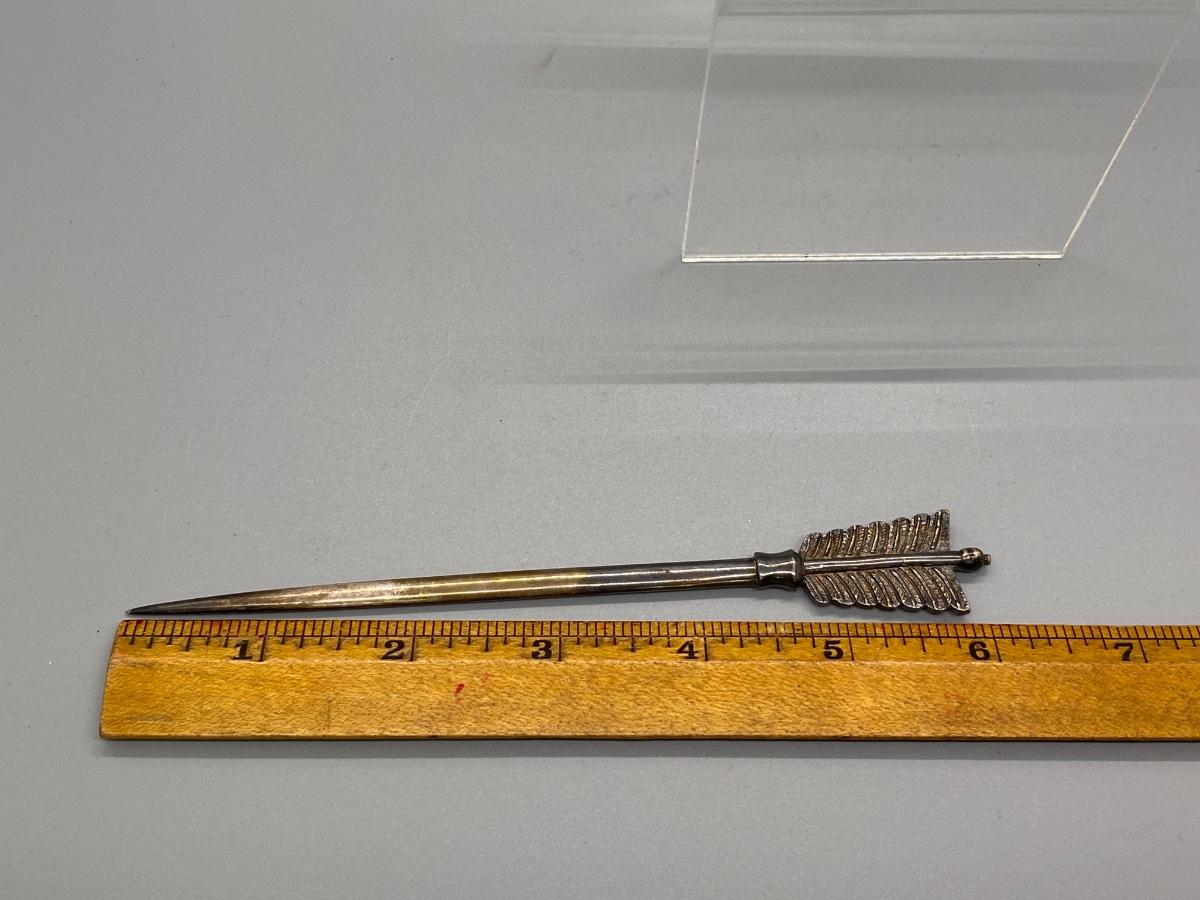 Vintage arrow shaped letter opener/hat pin. The point is quite sharp. There is hallmarks on oneside but not sterling hallmarks, looks like silver though. About 6" size.