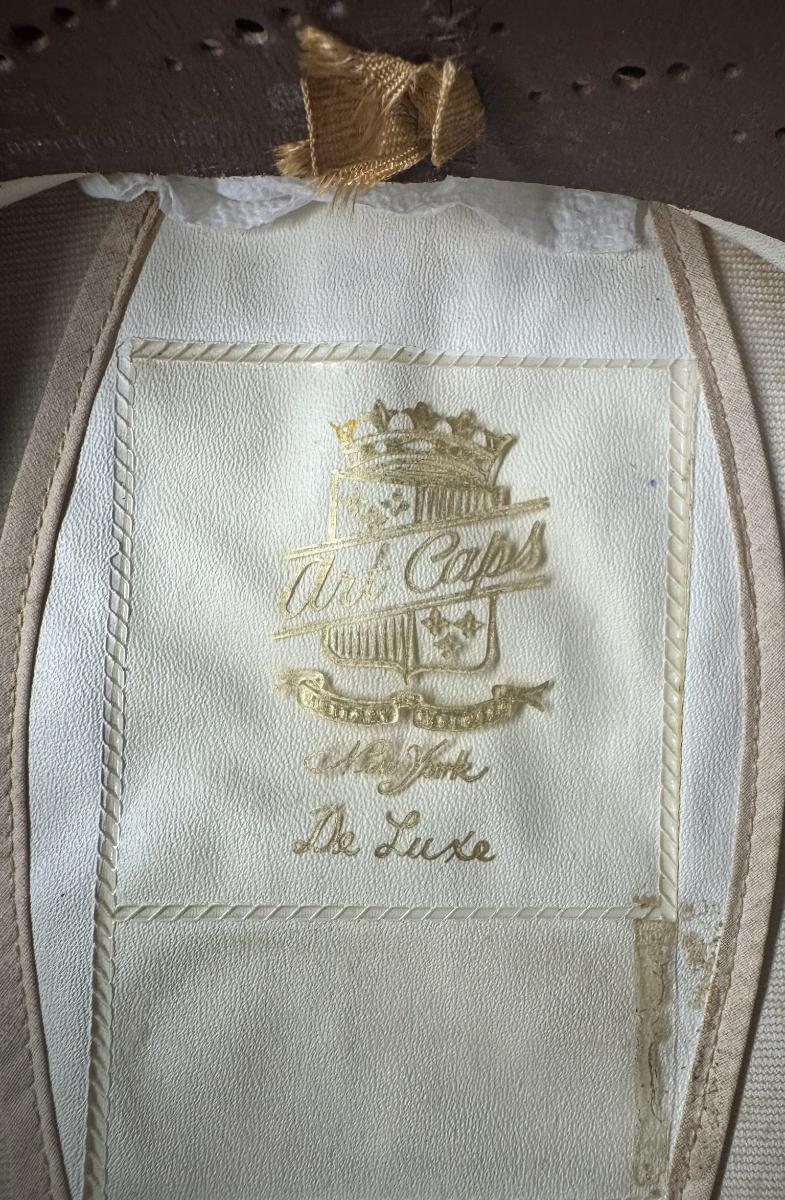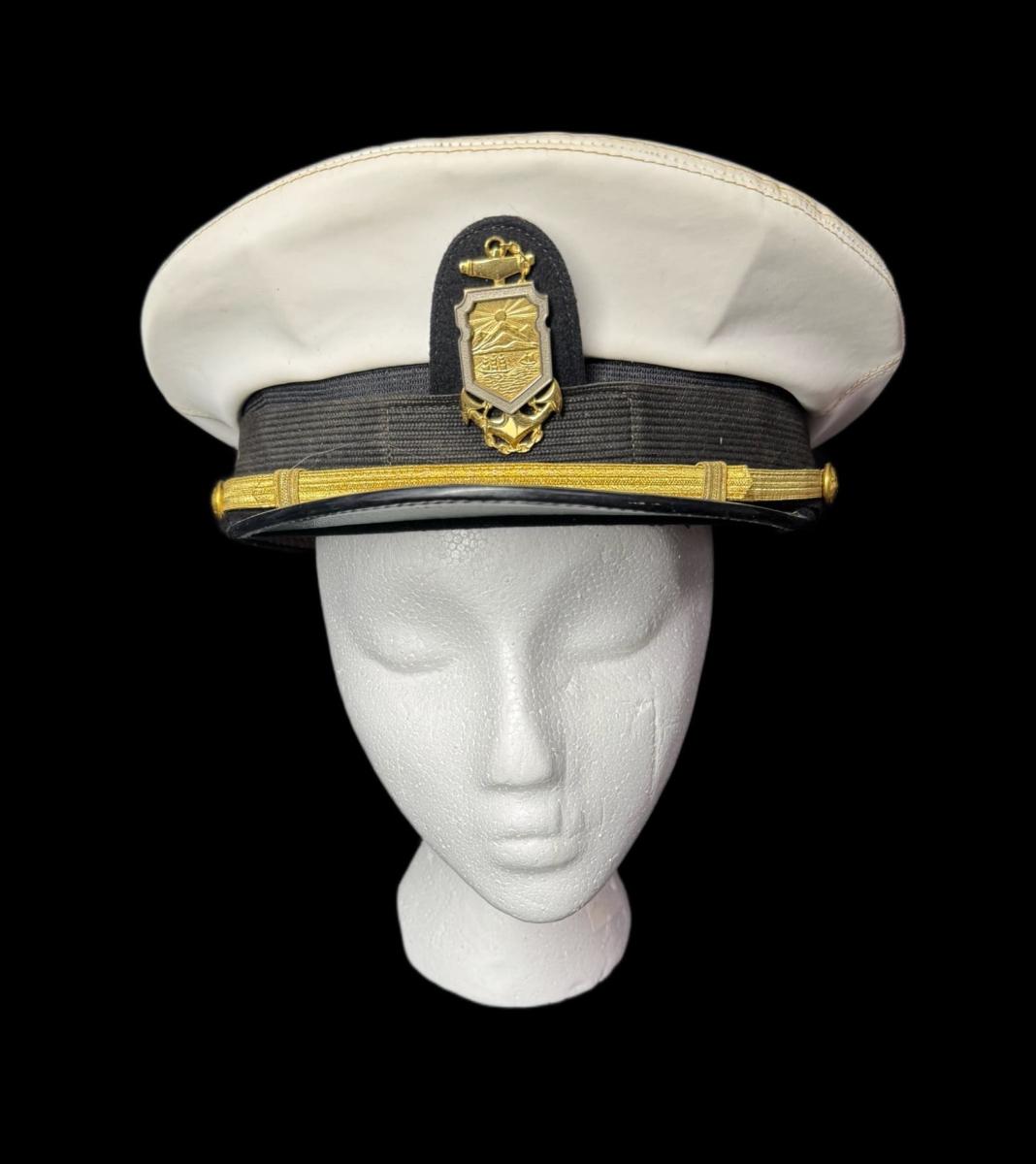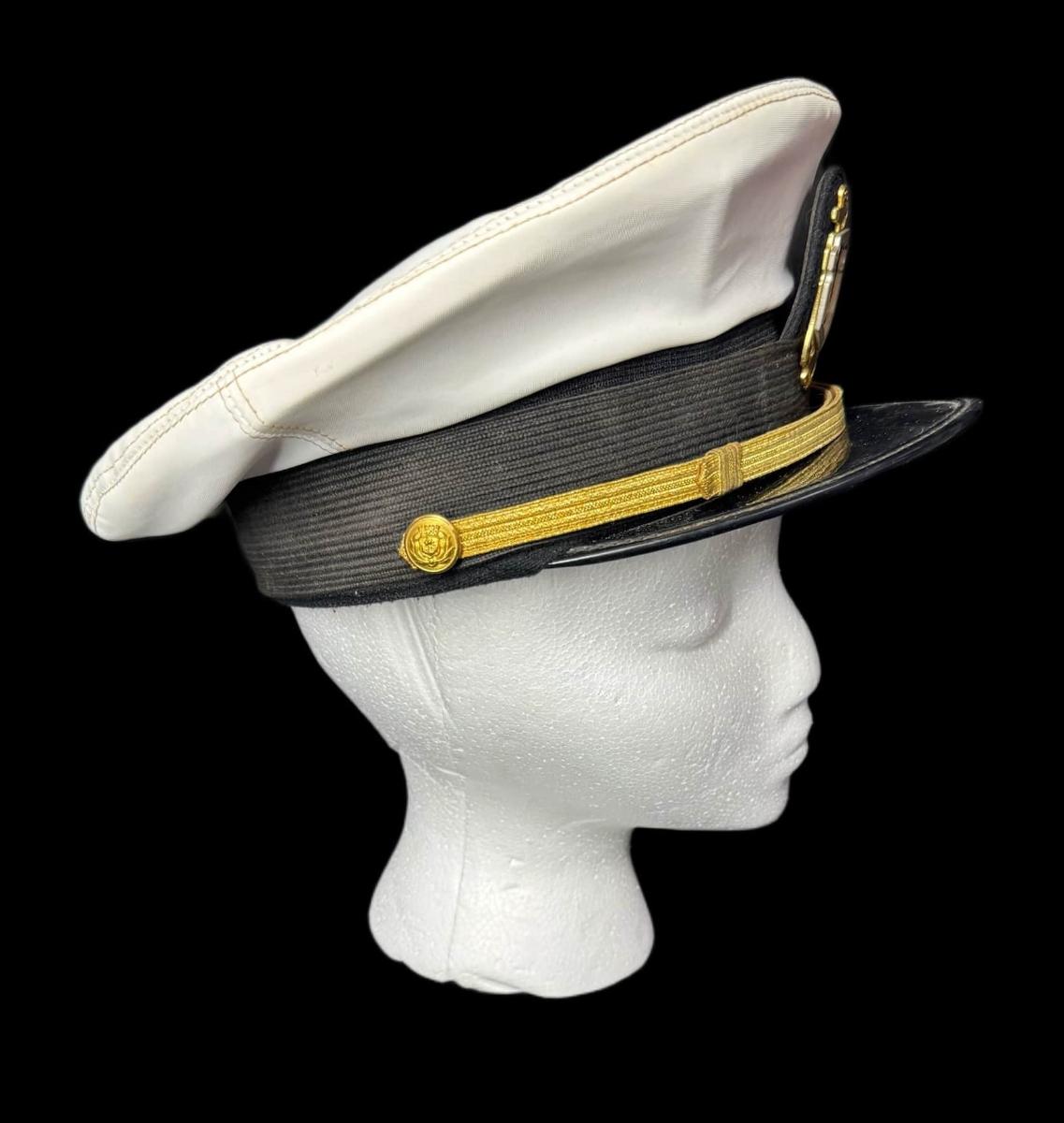 This Naval white peak cap belonged to a master swimmer. The size is unmarked/unknown. Age related wear. Measurement: 11.75” Diameter. [CS]