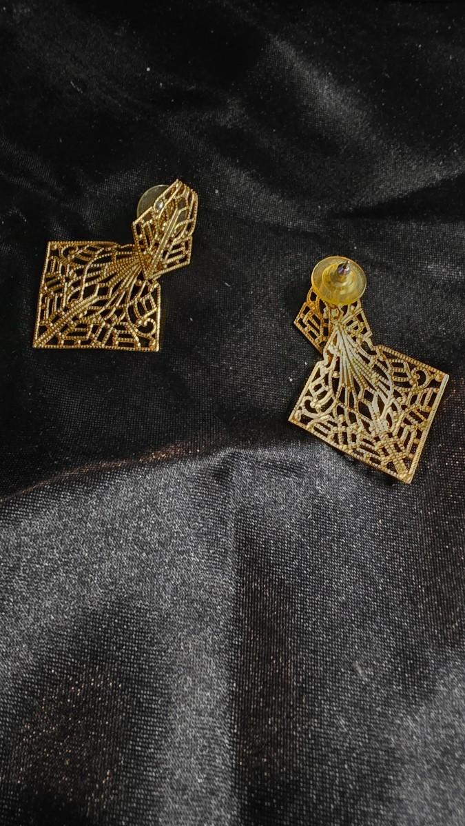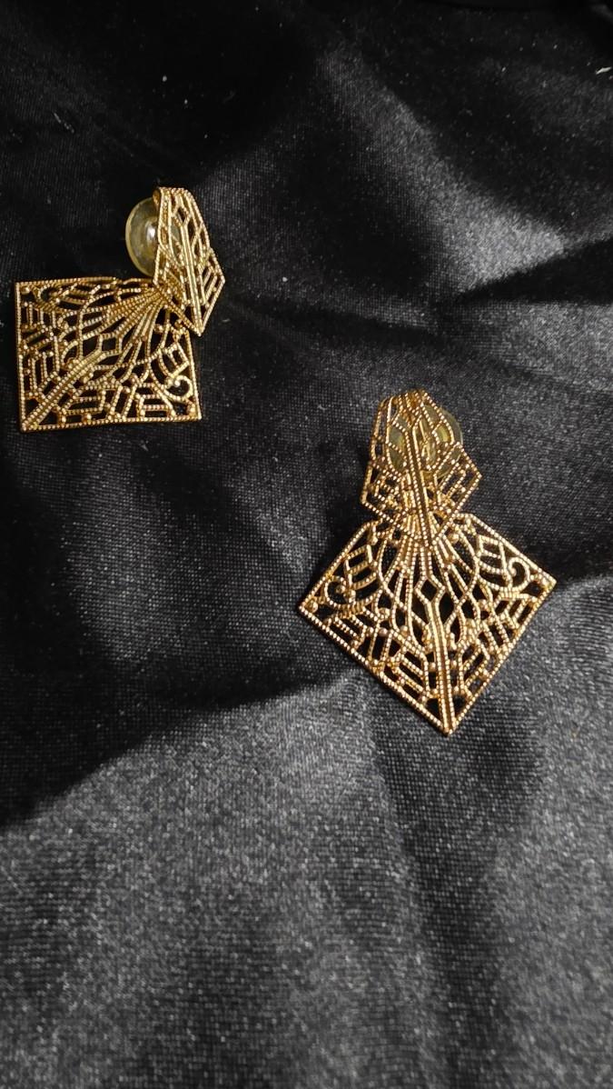 Vintage Art Deco Filigree Statement Earrings in Gold Tone – Geometric Elegance