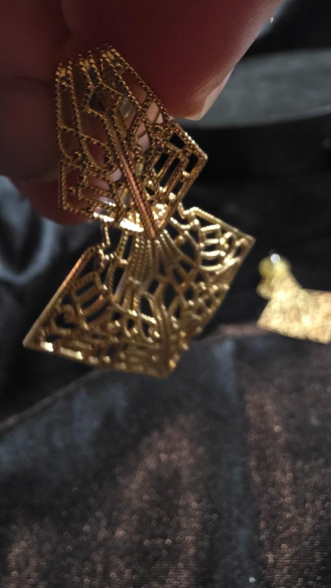 There is a moment, just before evening settles in, when the light turns soft and golden—when shadows stretch long and the world feels wrapped in a quiet glamour. These vintage Art Deco–inspired earrings capture that exact feeling. Their intricate filigree design unfolds like a lattice of geometric lace, each tiny beadwork detail forming a pattern that feels both architectural and ethereal.