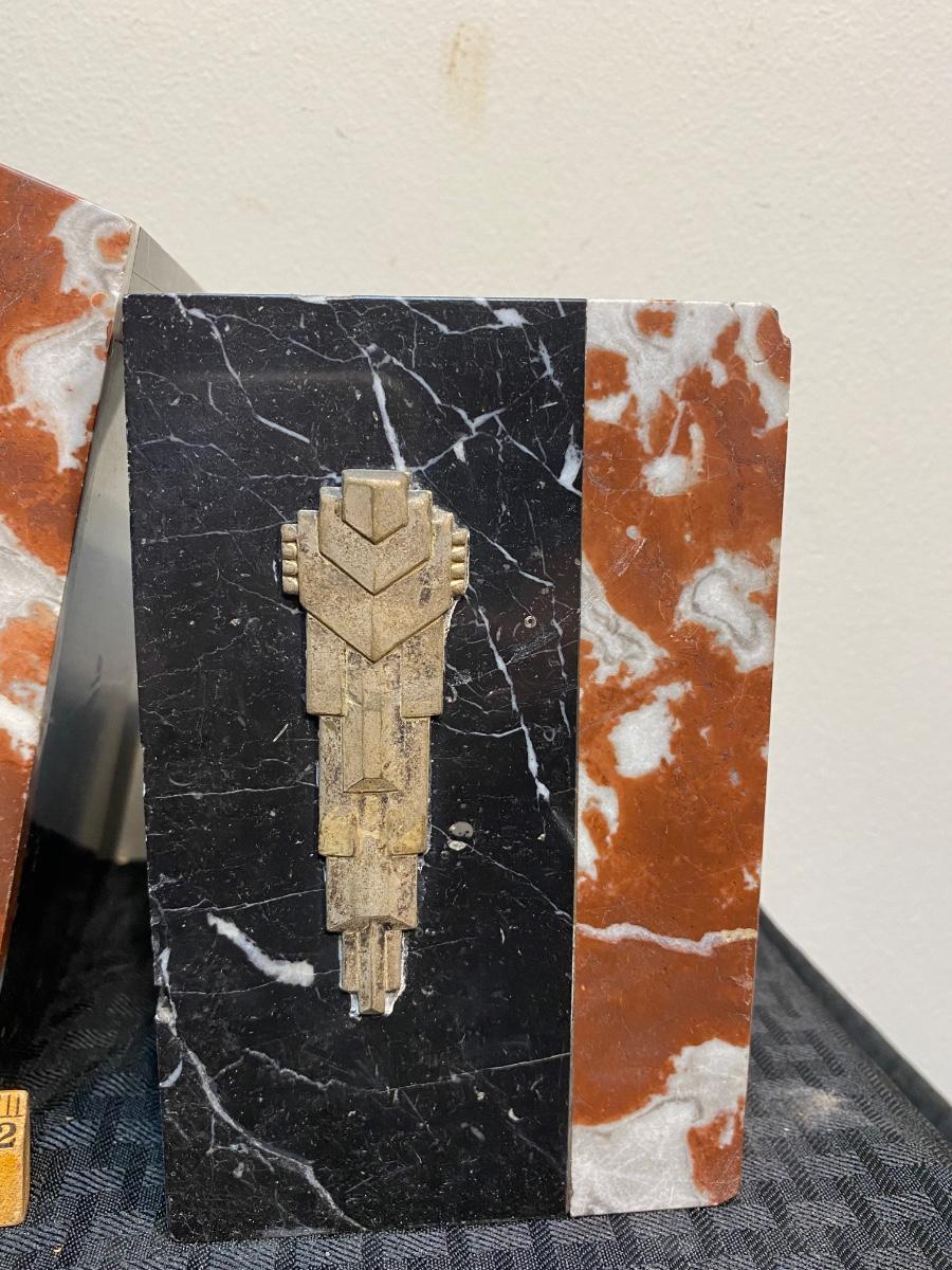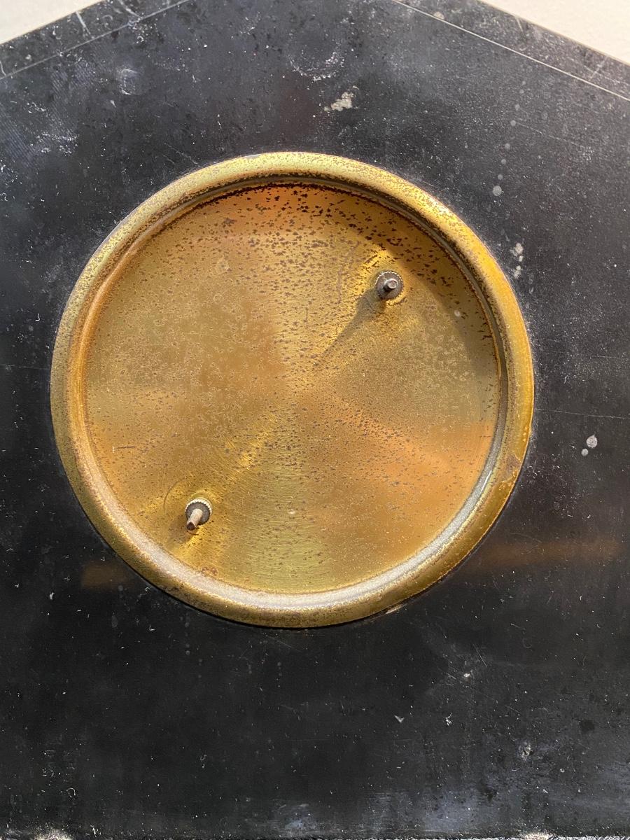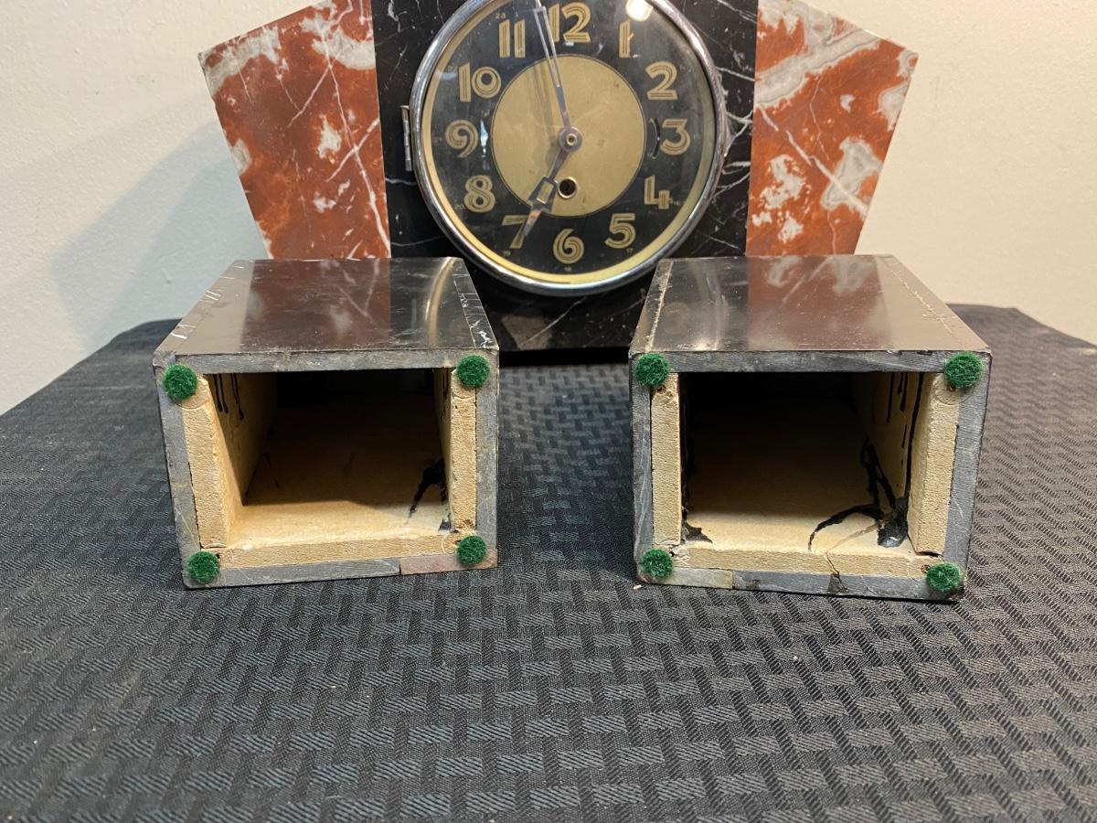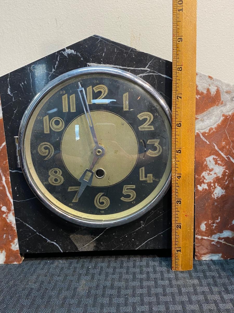 Vintage Art Deco Marble Mantel Clock Three Piece Set, there is no significant damage to the bodies of the pieces and is in good vintage condition. The clock is battery operated and does not run. It looks like it has been modified with adhesive, check pictures for more details and for sizing.