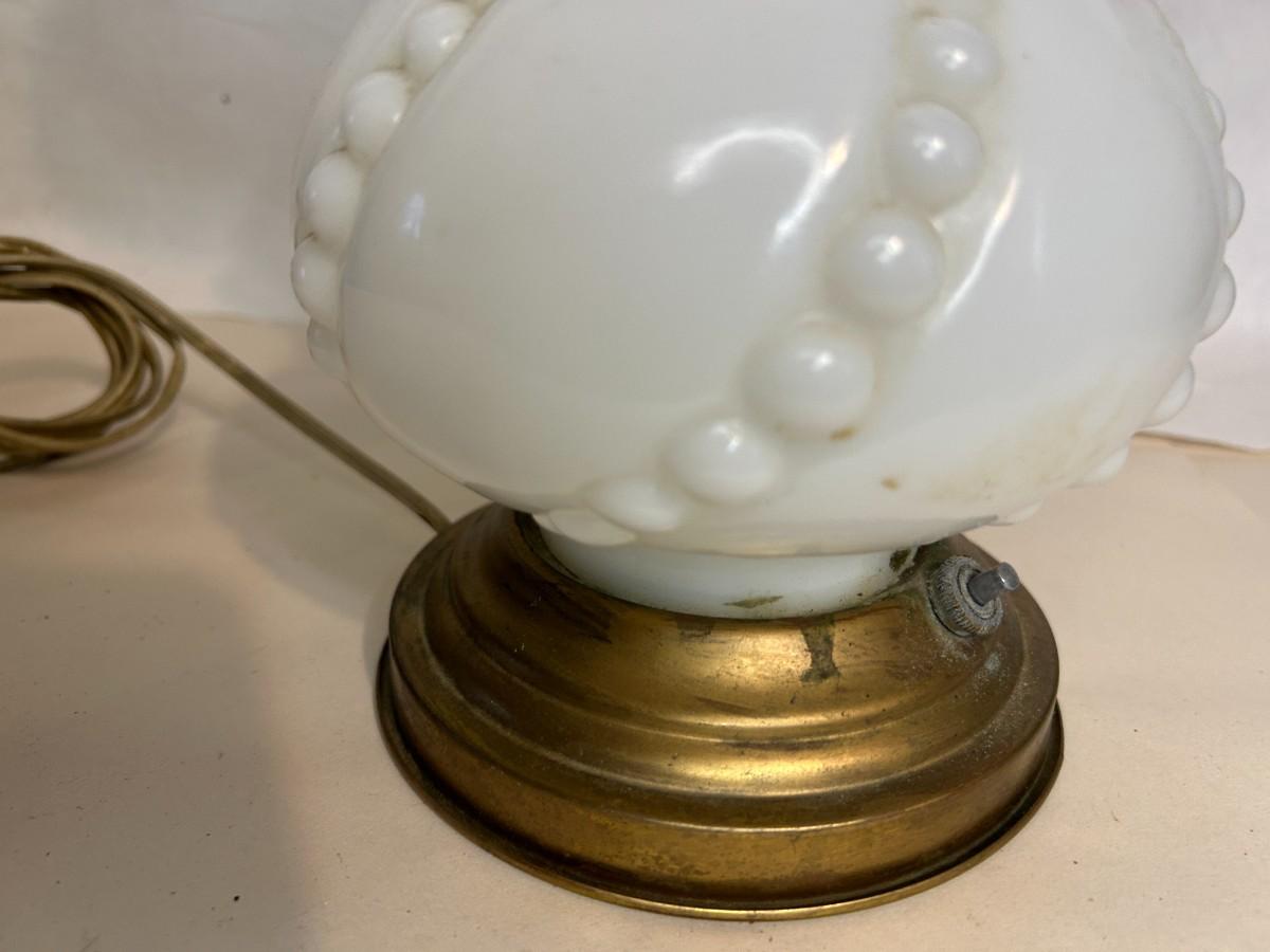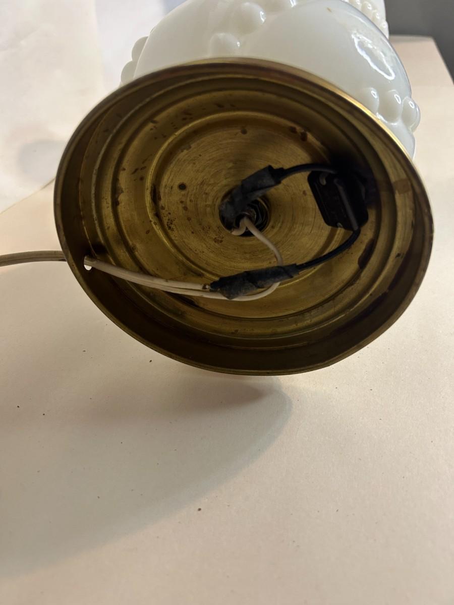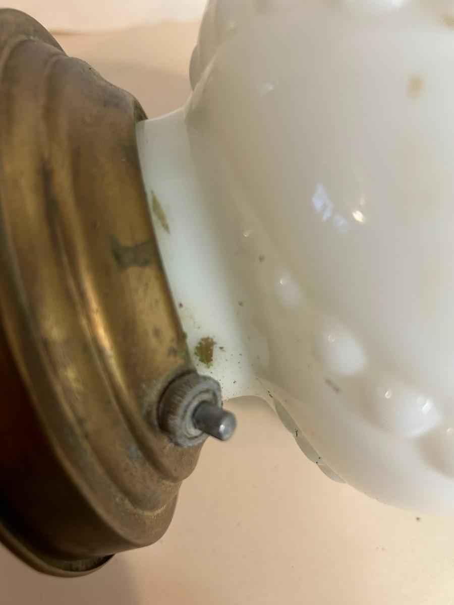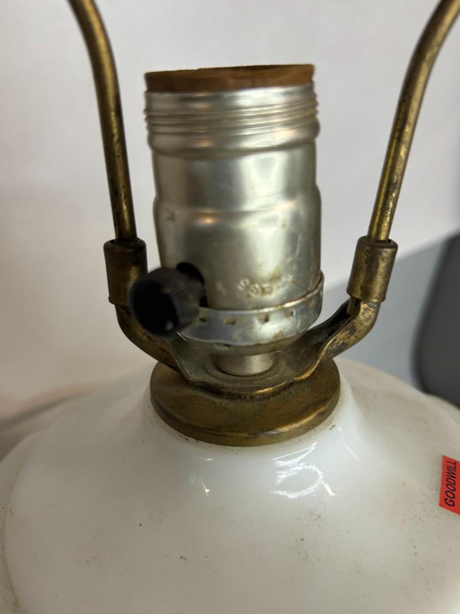 With its beautiful brass base, this traditional lamp will complete any room. It has the original push-button switch, which was upgraded to a 3-Way at some point. It is structurally in excellent condition with no chips or cracks, although it will benefit from a gentle washing.