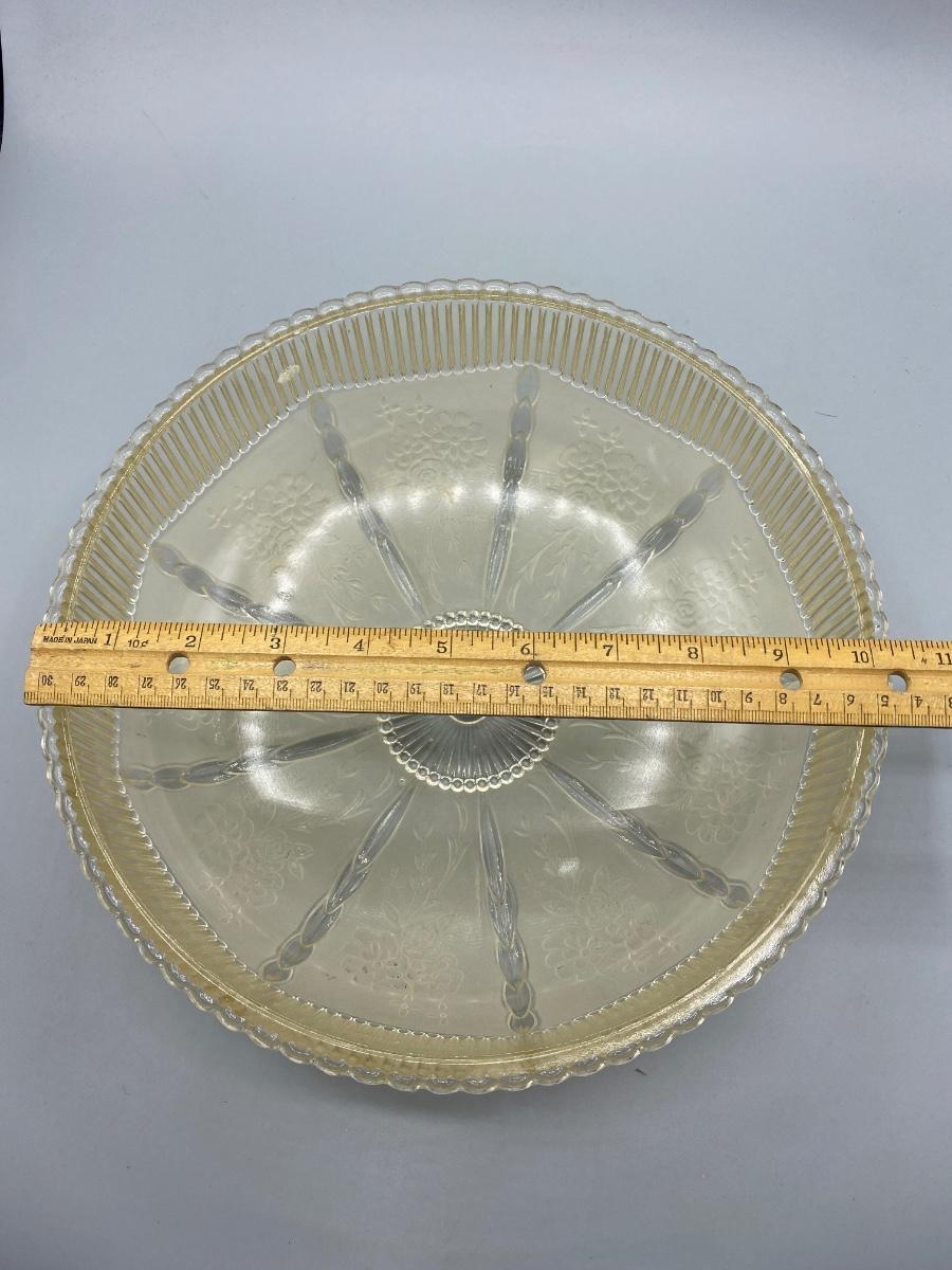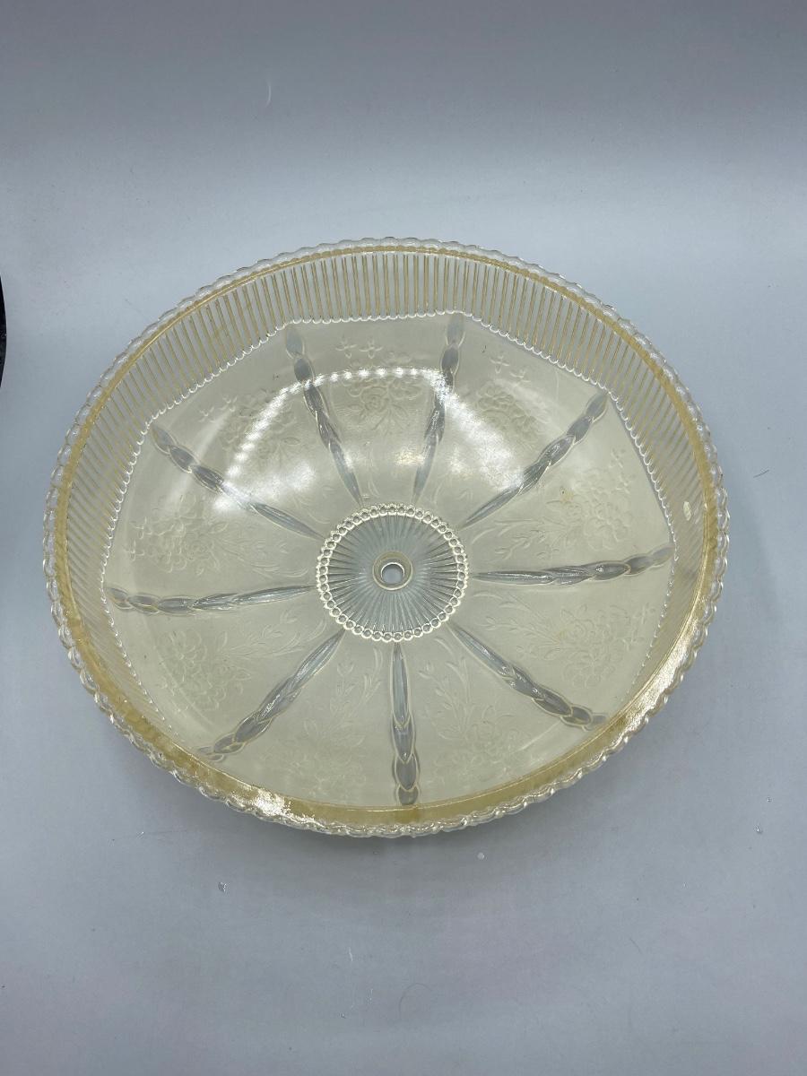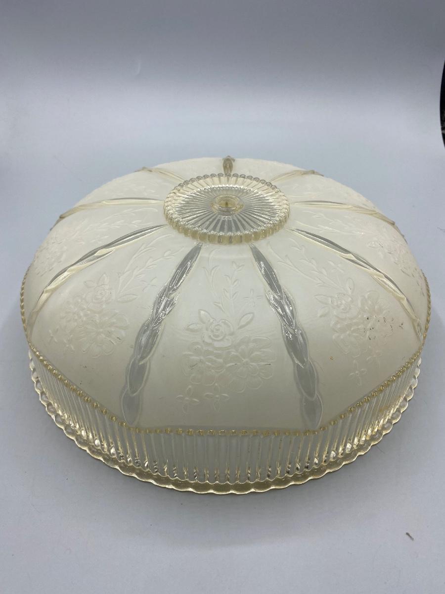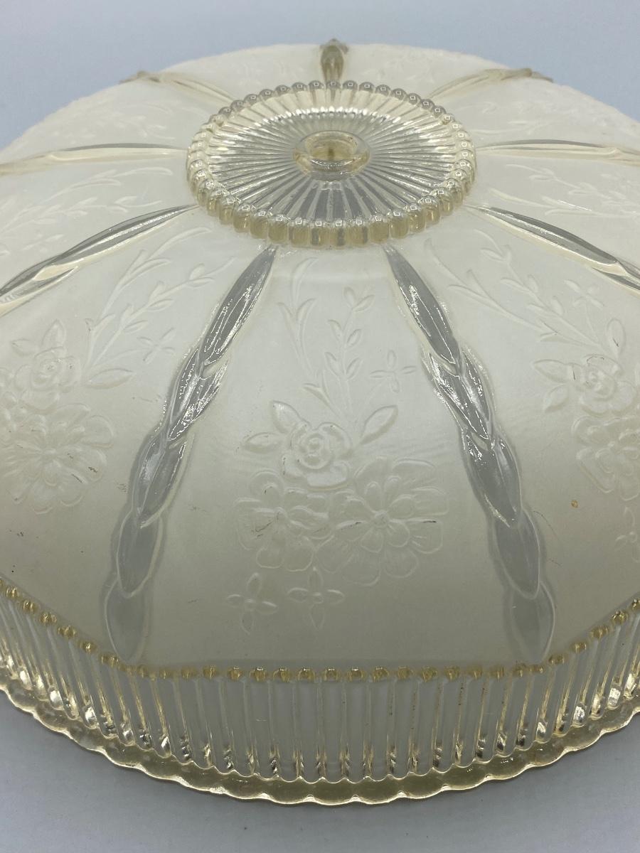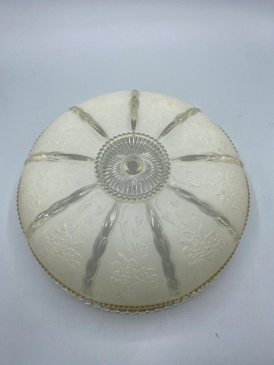Round vintage embossed floral frosted glass ceiling lamp shade. Beautiful details. In good condition, no chips or cracks. Has a slight yellowing to glass from age, not sure if it really would show when luminated. About 10" diameter.