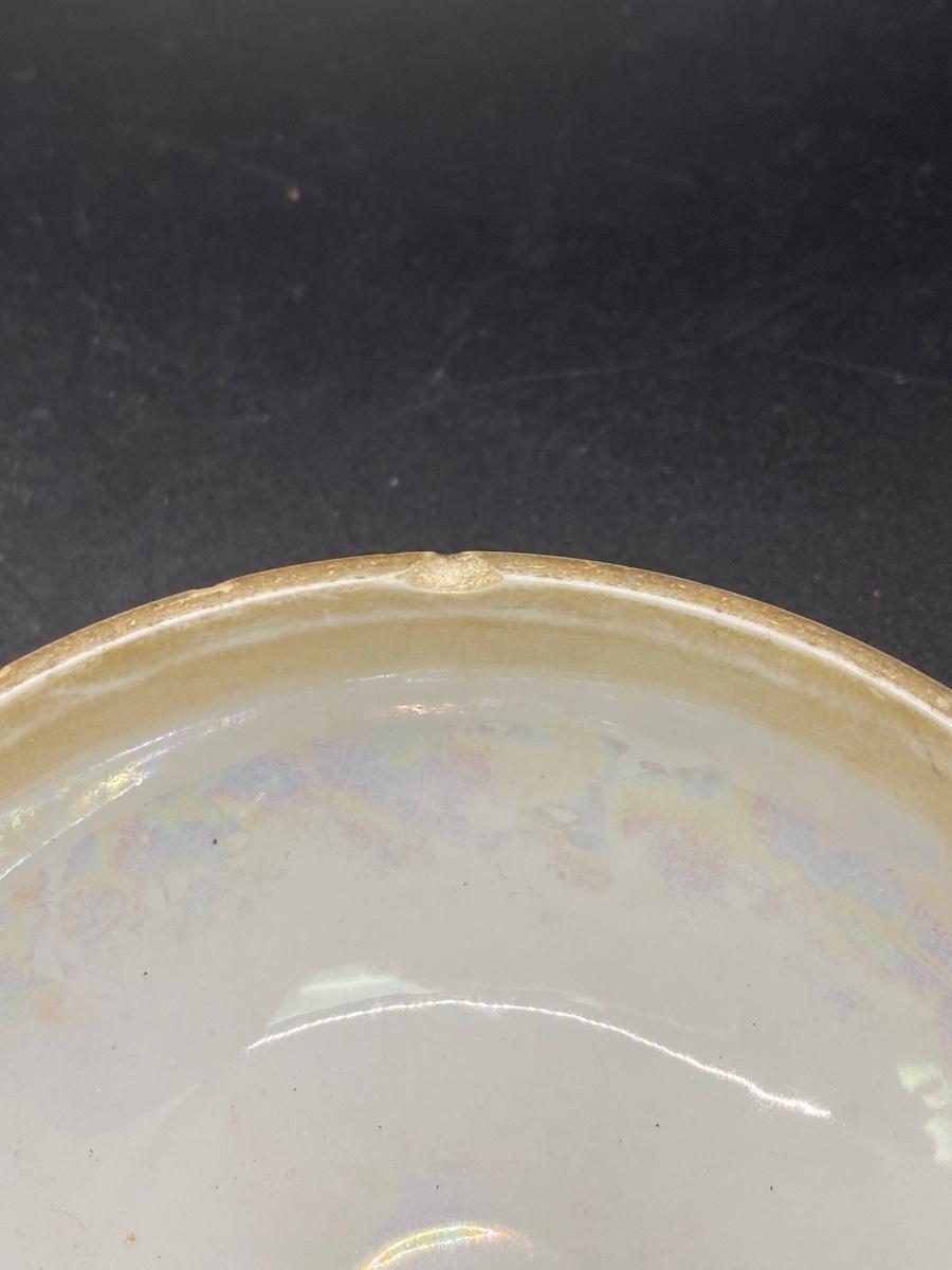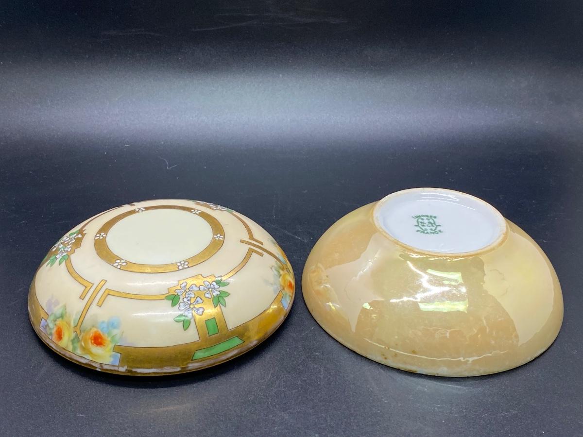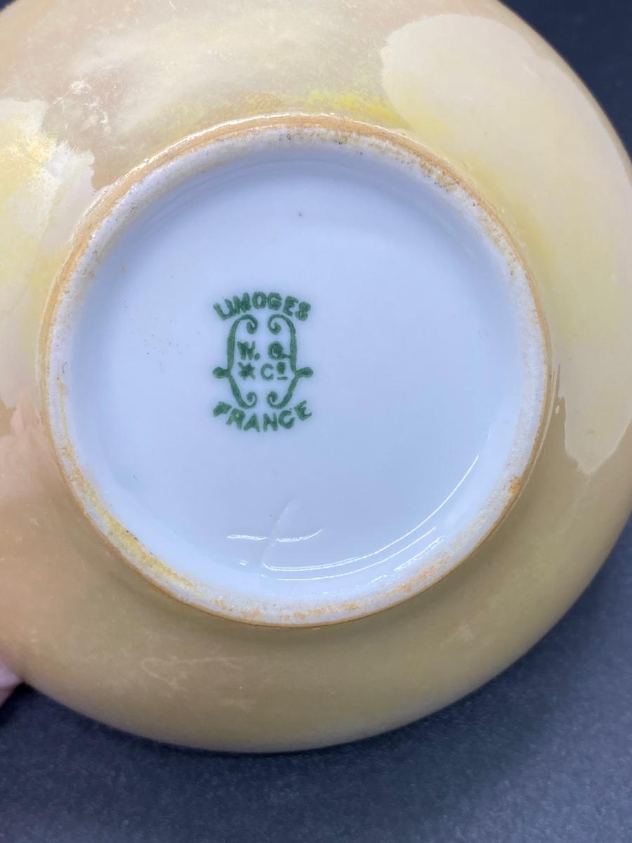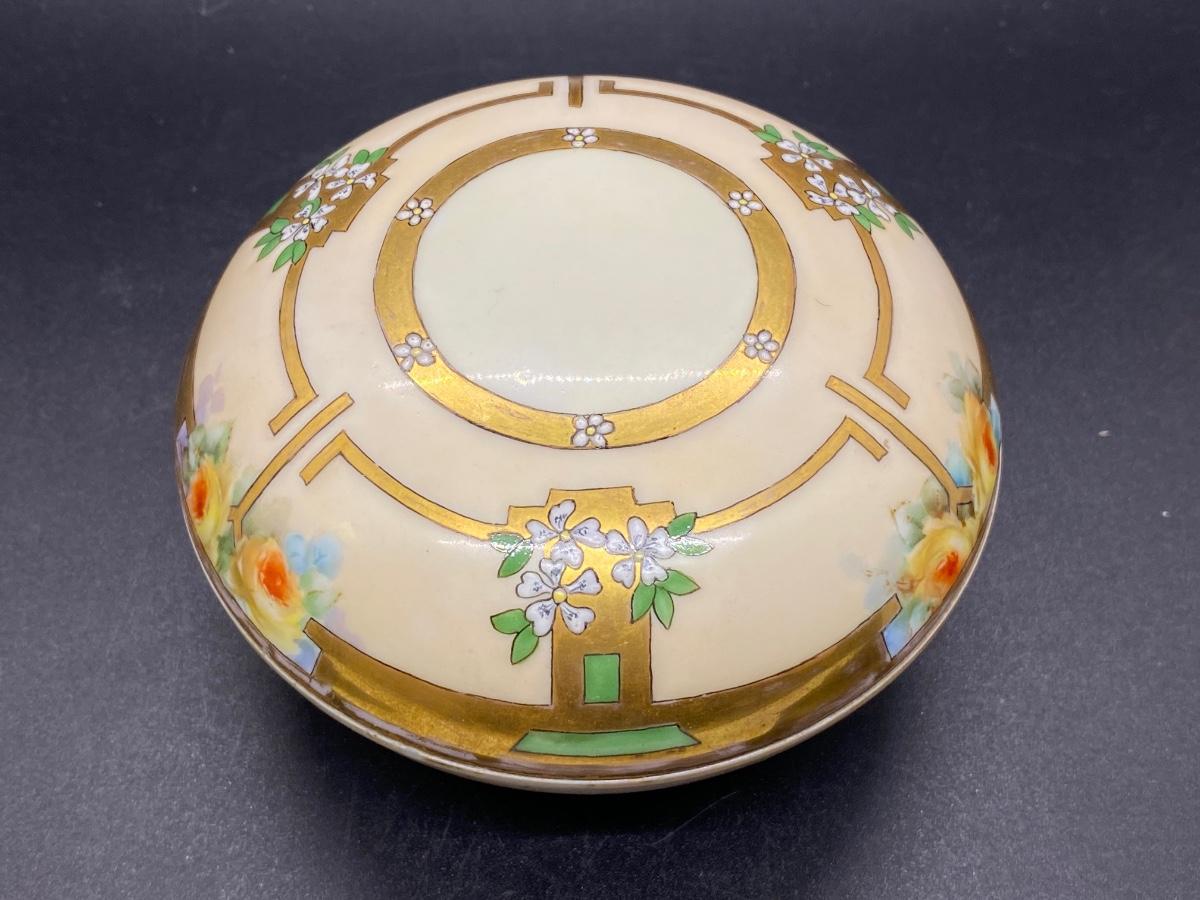 Vintage Limoges France round trinket powder box. Floral art deco design. Pattern does have some light wear from age and a couple flea bite chips along edge. Displays nicely. Marked on the bottom. About 4" diameter.