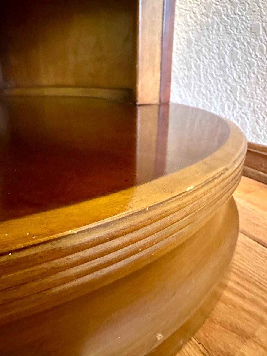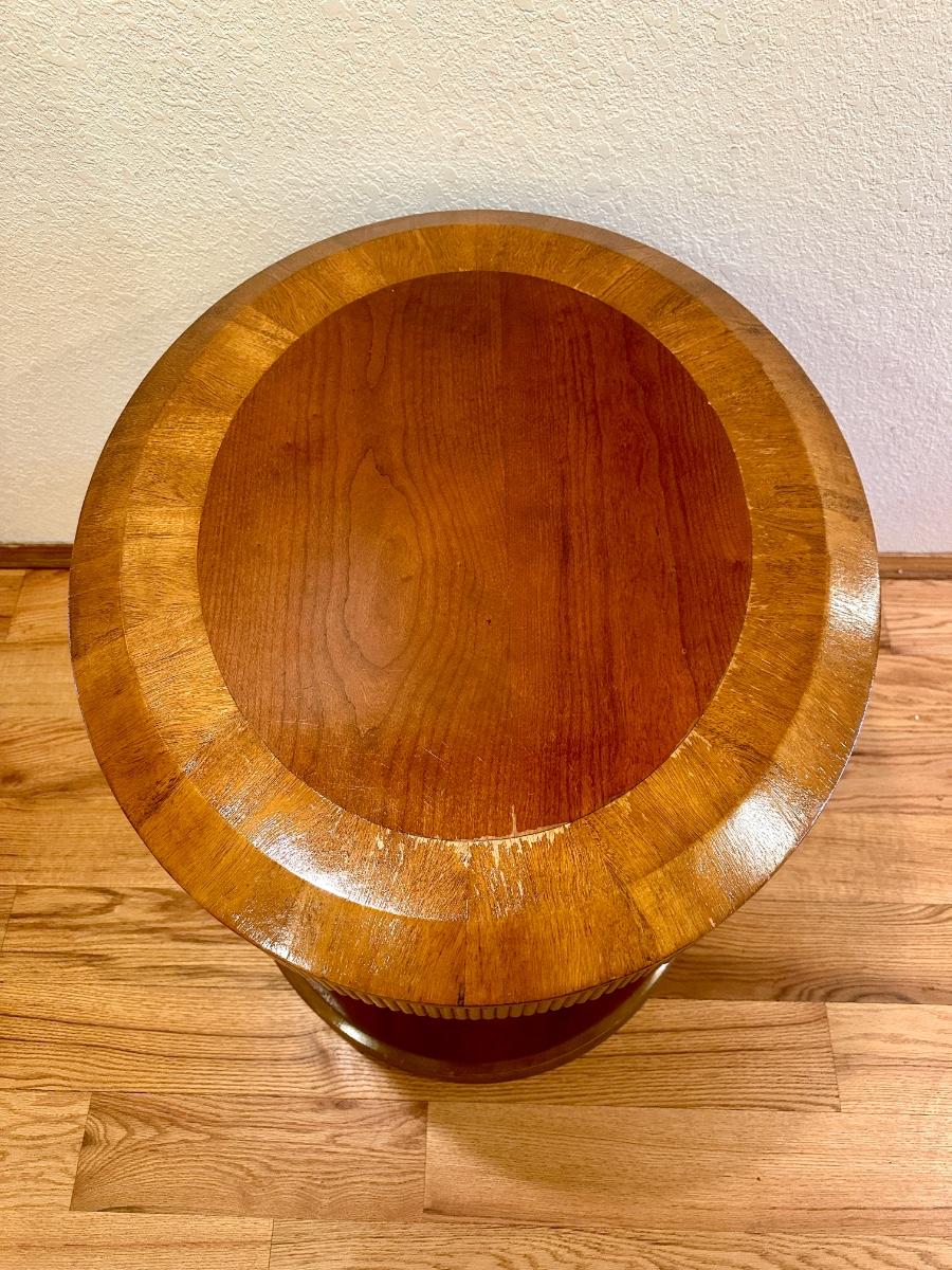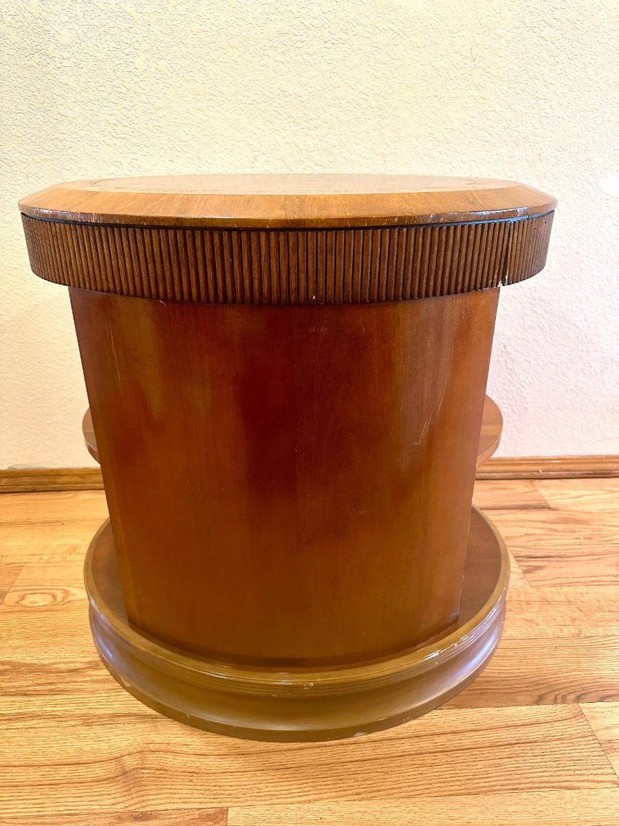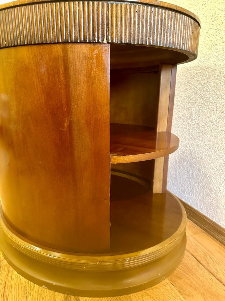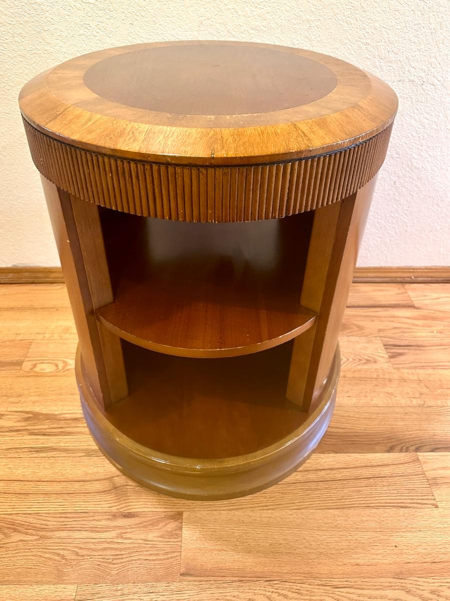 Vintage oval cylinder entry table with shelves. Walnut wood with reeded and bronze paint accents. Some nicks in wood and condition is generally as pictured. This piece is solid wood so heavy.