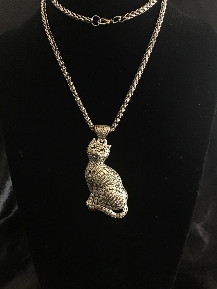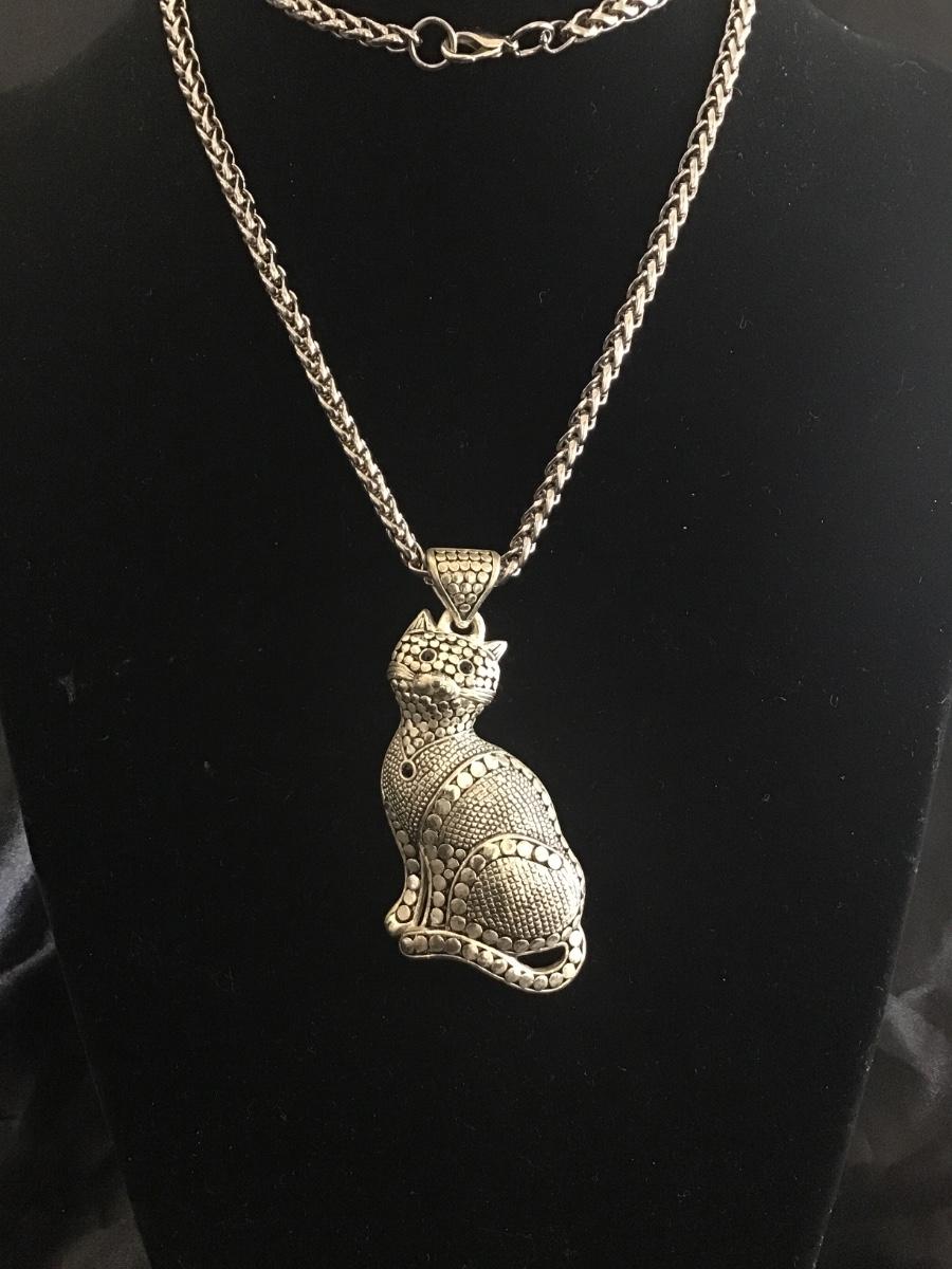 Vintage Art Deco, Silvertone cat pendant necklace with rhinestone accent