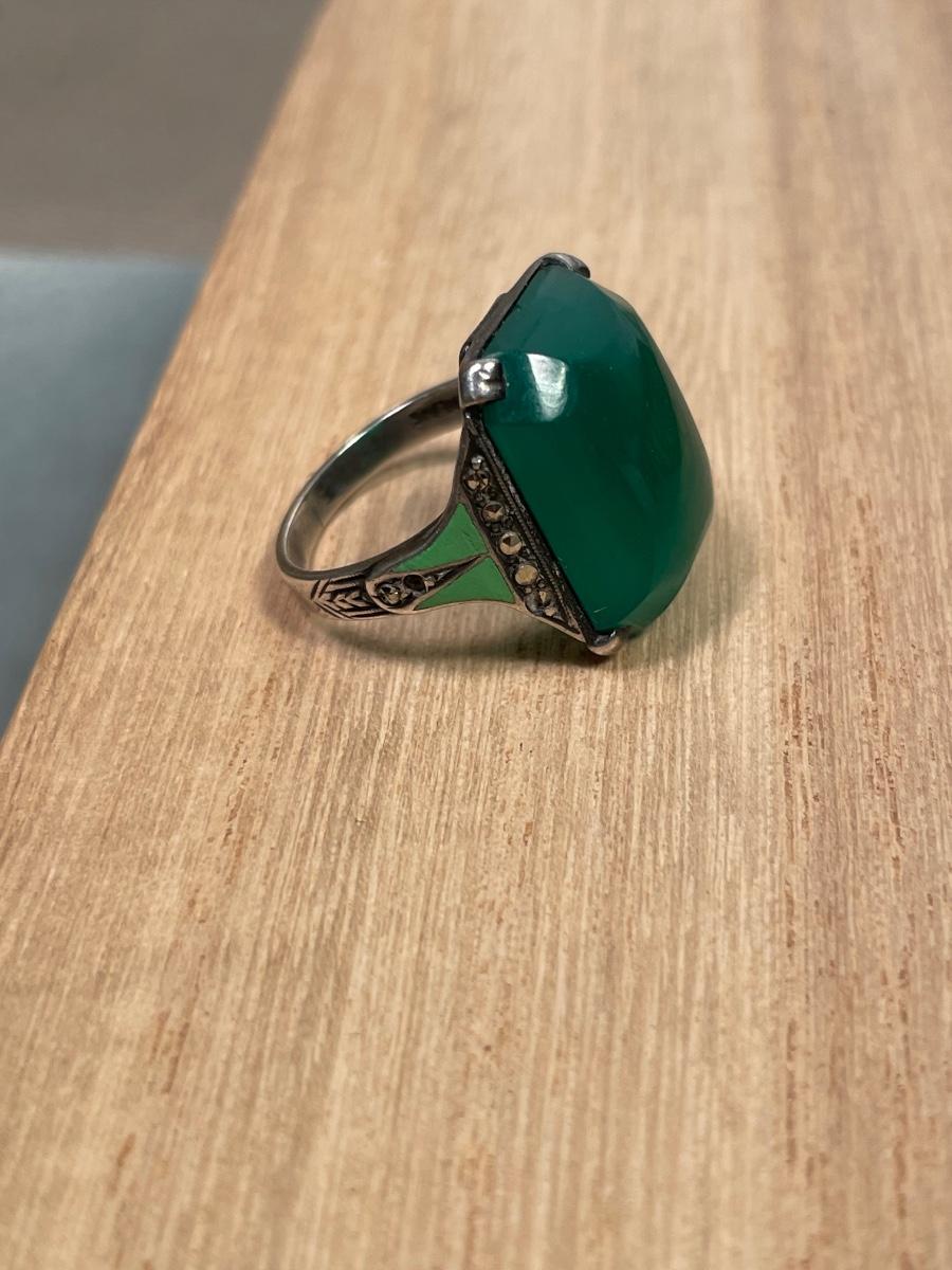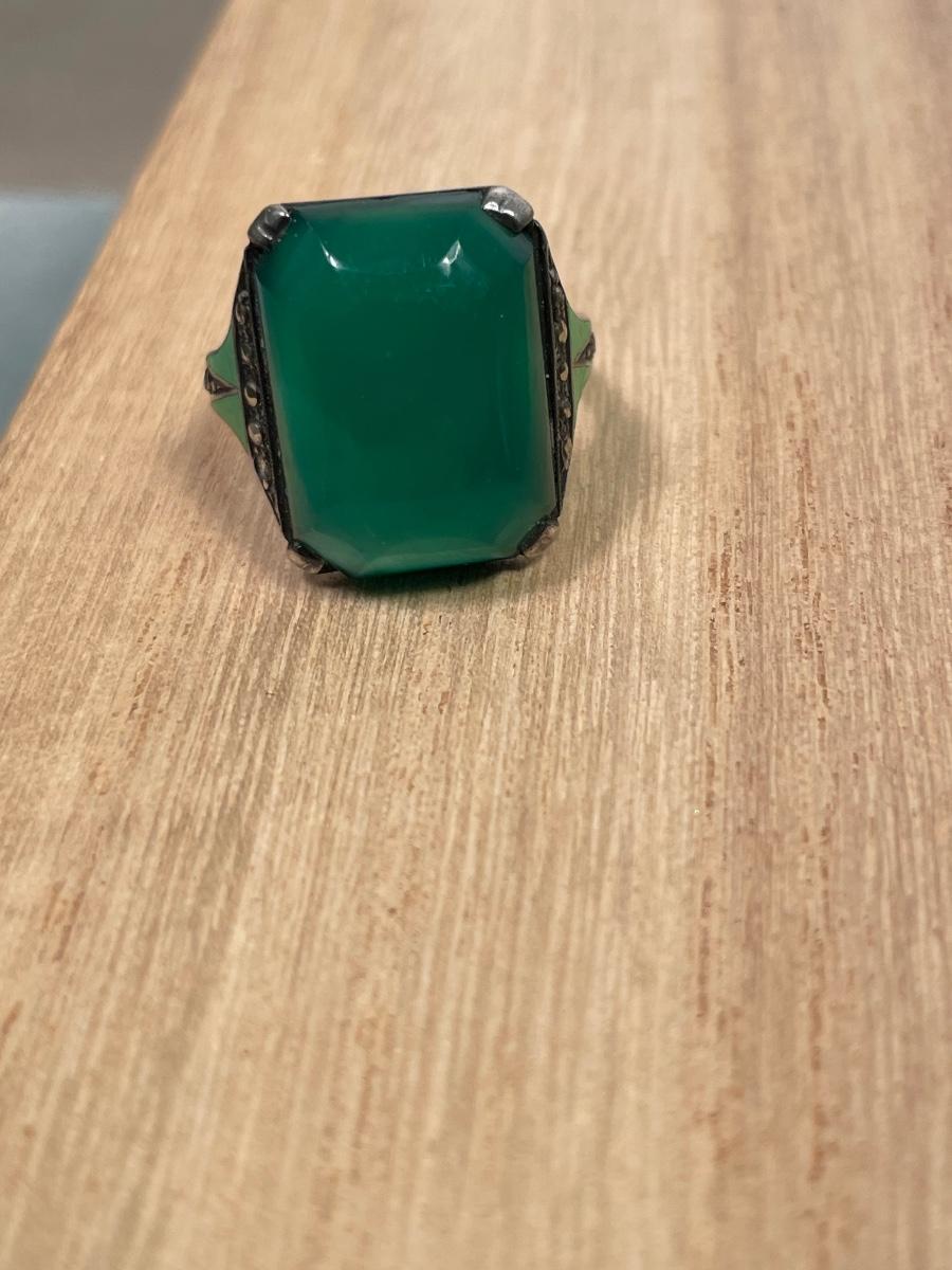 This is a special, hard to find vintage ring! Size 6. Nice enamel and I believe it’s a Chrysoprase stone. Marked “Sterling “