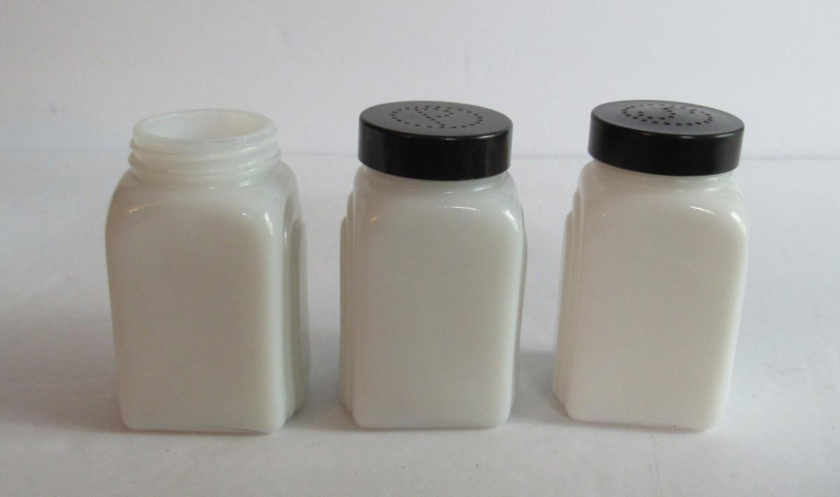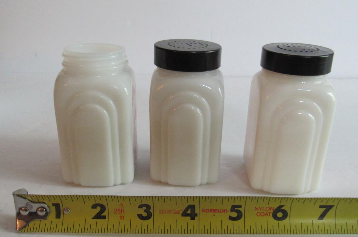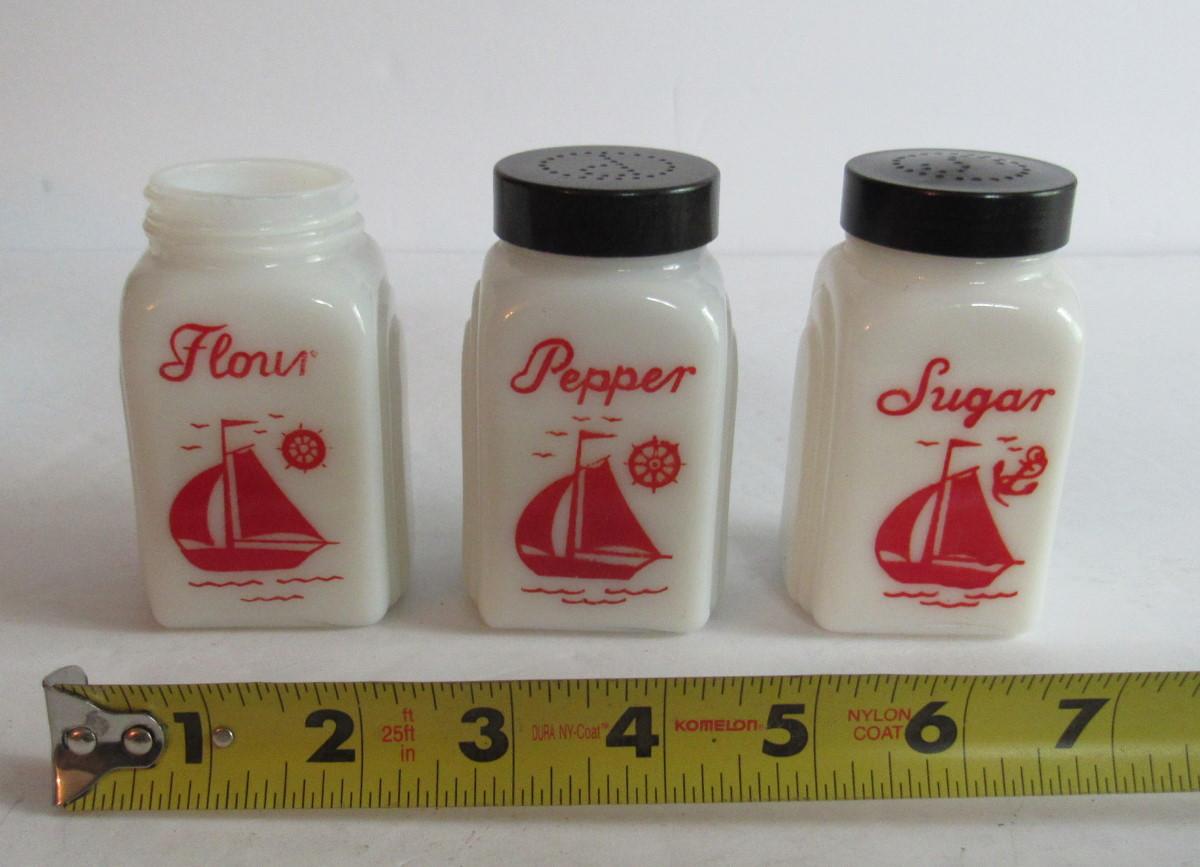 Flour, pepper and sugar shakers, covers may not be original. Slight rim nicks on the flour one.Shipping is available at actual shipping cost plus $5.00 handling fee per box for supplies/labor. See our terms for details. All sales are final. Condition notes may not be all inclusive, we may miss some issues as most vintage items are not in mint condition and have some degree of wear, paint loss, etc, but we always try to note obvious damage.